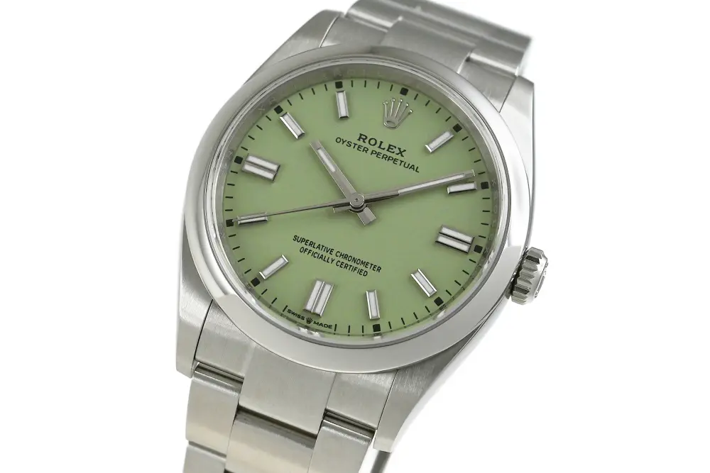 オイスターパーペチュアルは、ロレックスの原点を体現するシンプルな3針モデルです。防水性のオイスターケースと自動巻きのパーペチュアル機構を備え、日付表示がない分、汎用性が高いのが特徴。近年はカラーダイヤルの人気で入手難が続き、定価を上回る中古相場になるケースもあります。初めてのロレックスとしても選ばれやすい定番コレクションです。