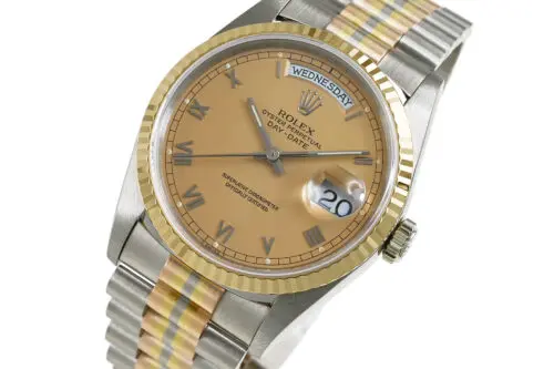 ドレス系の代表は「デイデイト」や「チェリーニ」、ジュビリーブレス仕様の「デイトジャスト」などです。金無垢やプラチナ、ダイヤを用いたモデルが多く、高級感と華やかさが際立ちます。フォーマルな場や商談、パーティーなどで存在感を発揮し、まさにステータスを示す時計といえます。