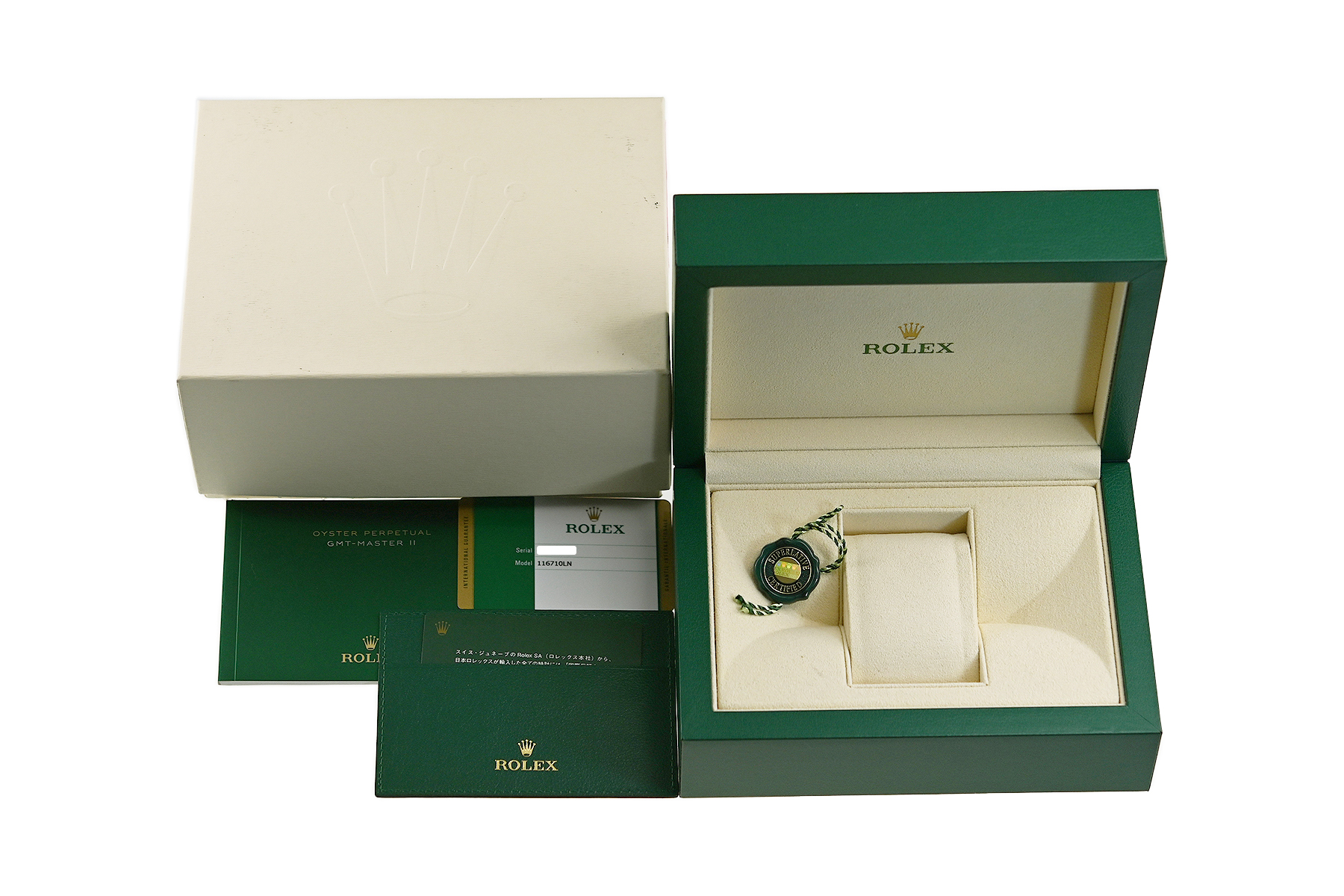 コメント 1955年に誕生した「GMTマスター」。進化したGMTマスターIIは回転ベゼルにより3箇所の時刻を知る事が出来ます。耐久性に優れたブラック・セラクロム・ベゼルが印象的、ロレックスキャリバー3186を搭載しています。Ref.116710LNは生産終了となっています。少々の軽い擦りキズはありますが一部保護シールの付いたままの状態です。国内正規店にて購入品です。
