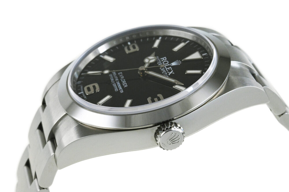 | コメント | 1953年デビューの「エクスプローラーI」。シンプルでスタイリッシュなデザインはどんなシーンにもマッチする、スポーツ・ロレックス人気モデルです。2010年にモデルチェンジした「Ref.214270」は、ケースサイズが35mmから39mmにサイズアップしました。インデックス(3・6・9)は夜光塗料のないメタル仕様のタイプ(ブラックアウト)です。ロレックス完全自社製造の高精度クロノメーターキャリバー3132を搭載しています。僅かな軽い擦りキズ、ダブルロックの王冠マーク付近に擦りキズはありますが目立つ様な深いキズはありません。2021年3月に正規修理サービスにてバックケース交換、ポリッシュ、時間調整、内部点検調整をしています。 |