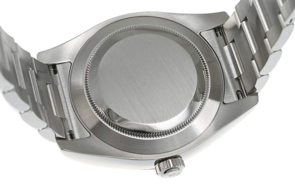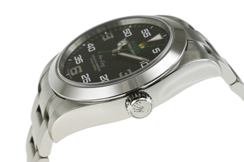 | コメント | 2016年に登場したエアキング「Ref.116900」。2014年のマイナーチェンジでダイヤルから「Air-king」ロゴが消え「エアキング」は終了してましたが、ケース径40mmにサイズアップして復活しました。イエローカラーのクラウンマークやグリーンカラーのROLEXロゴ・秒針が特徴的で、針がペンシル型からベンツ針となりかなりスポーティーな印象となっております。ロレックス完全自社製造の高精度クロノメーターキャリバー3131を搭載しております。少々の小キズ・擦りキズはありますが目立つ様な深いキズはありません。国内正規店にて購入品です。 |