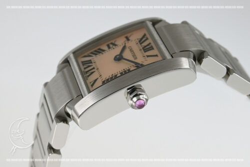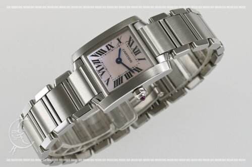 | コメント | タンクの特徴である平行した2本のバーを活かしたオシャレなスクエア型が魅力的な「タンクフランセーズ」、レディース・クォーツモデルです。可愛らしいピンクシェルダイアルが印象的です。若干の細かな軽い擦りキズはありますが目立つ様な深いキズはありません。 |