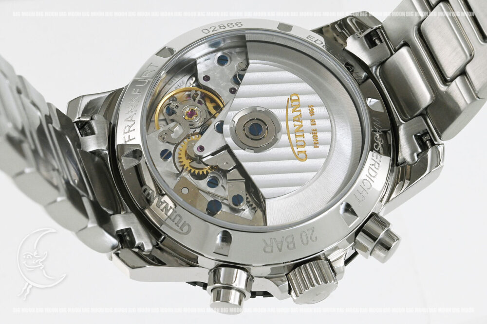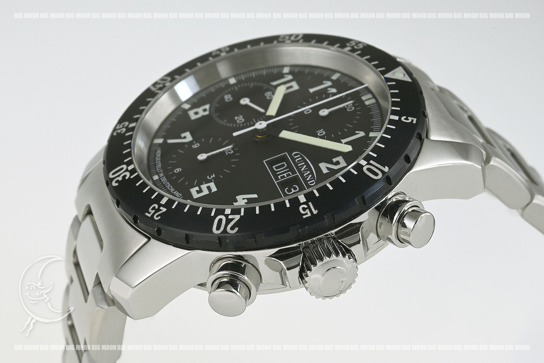| コメント | ドイツ時計「Sinn」の創設者、ヘルムート・ジン氏が自身の時計スピリットを具現化する為に新に興した時計工房「GUINAND」 の自動巻クロノグラフモデルです。ドイツ空軍に納められた名機、Sinn.155から続く実戦クロノグラフの継承モデルです。裏蓋シースルーバックとなっております。使用に伴う若干の小キズ・擦りキズはありますが目立つ様な深いキズはありません。ガラスに極僅かな軽い擦りキズがあります。国内正規店にて購入品です。 |
