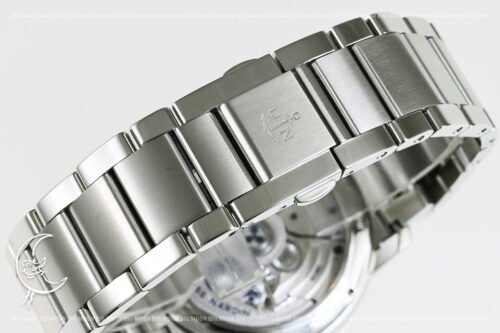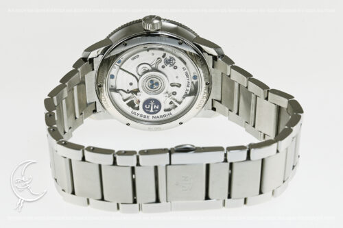 | コメント | 海洋との関係が深いユリス・ナルダンのマリーンコレクション「マリーン トルピユールムーンフェイズ 42mm」300本限定モデルです。トルピユールとは駆逐艦のフランス語での名称を意味し、小回りの利く船舶等を指します。12時位置パワーリザーブインジケーター、6時位置スモールセコンドとムーンフェイズを備えています。C.O.S.C認定ムーブメントを搭載。僅かな軽い擦りキズはありますが目立つ様なキズはありません。国内正規店にて購入品です。 |