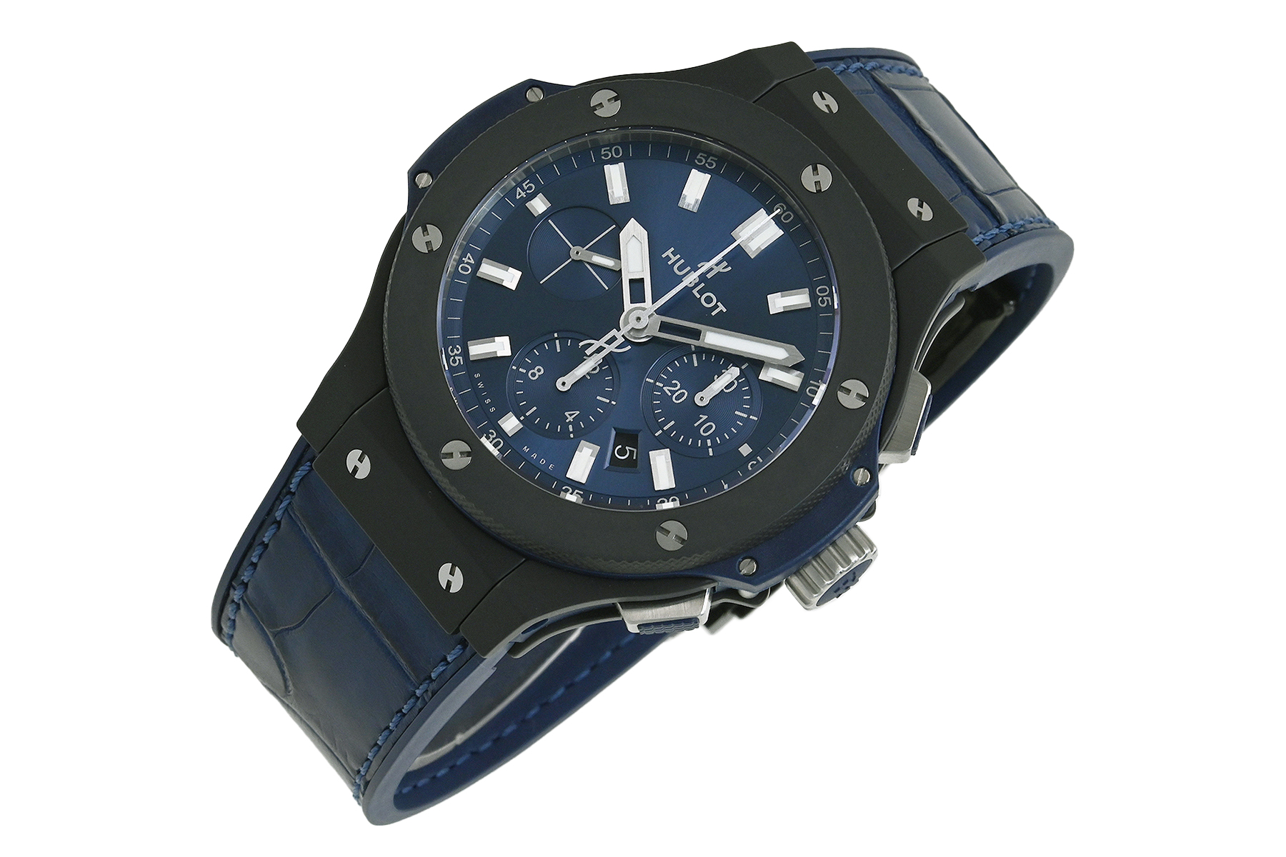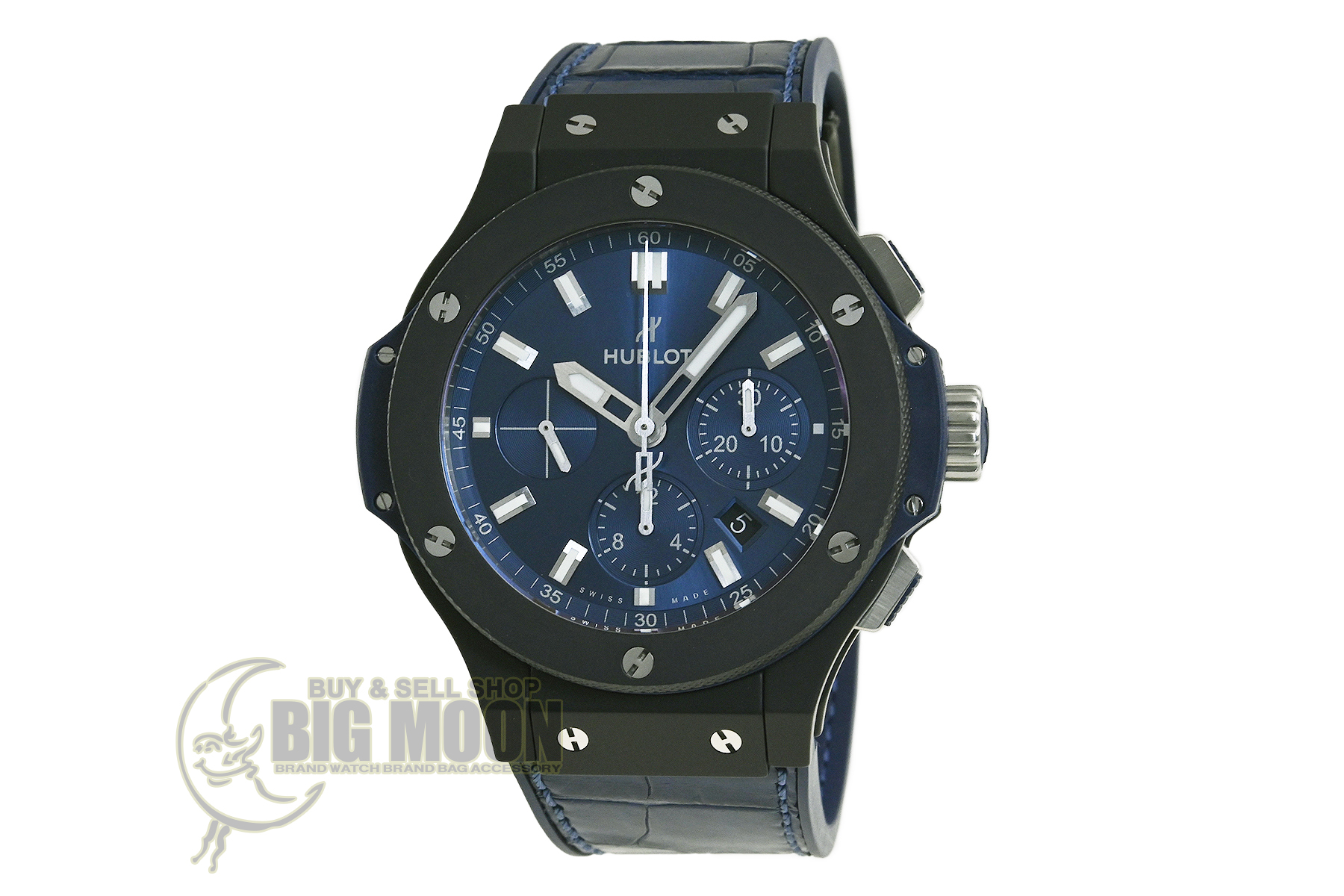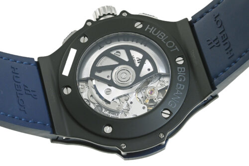 | コメント | 「異なる素材の融合」と「伝統と未来の融合」をテーマとした人気モデル「ビッグバン」。マイクロブラスト加工を施したブラックセラミックケースを採用、オシャレなブラック×ネイビーカラーに、シルバーのアプライドインデックスが印象的です。裏蓋シースルーバックとなっています。ベルトのラバー部分に少々の軽い擦れはありますが、その他特にキズらしいキズはなくキレイなコンディションです。 |