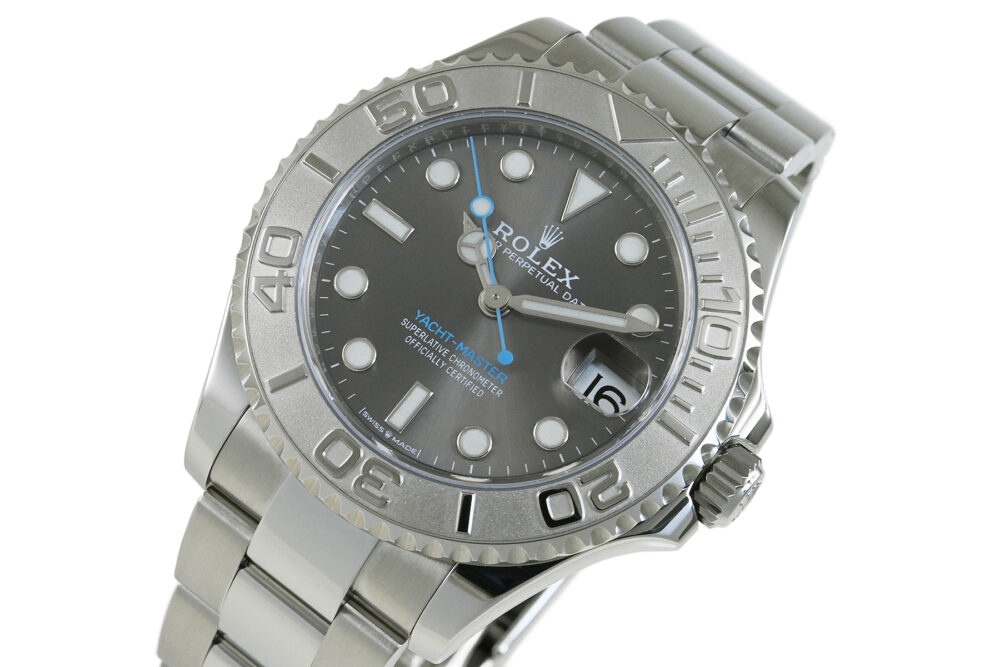| コメント | セーラーのスピリットを体現したシリーズ「ヨットマスター」。ケース径37mmの小振りな「ヨットマスター 37」、スチール&プラチナベゼルモデルです。サンドブラスト仕上げを施した950プラチナ製の両方向回転ベゼルが特徴的、落ち着いたグレーダイアルに水色塗装の秒針とYACHTMASTERの印字がオシャレな雰囲気です。ロレックス完全自社製造の高精度クロノメーターキャリバー2236を搭載しています。少々の軽い擦りキズはありますが目立つ様な深いキズはありません。2023年10月に日本ロレックスサービスにて時間調整をしています。 |