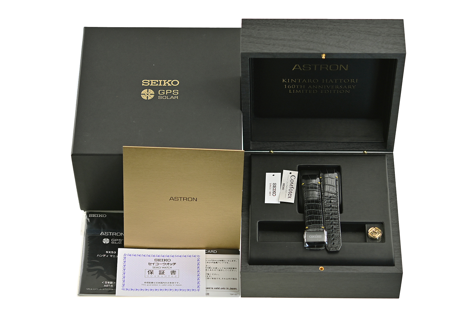 | コメント | セイコーの革新的テクノロジーが生み出した独自のGPSモジュールを搭載した世界初のGPSソーラーウオッチ「アストロン」。最高峰GPSソーラーキャリバー「5X53」を搭載、2020年10月9日に発売した服部金太郎の生誕160周年を記念した限定モデルです。「黒」「金」を基調としたカラーリングが特徴的、耐傷性を高めるスーパーブラックダイヤシールドがコーティングされています。デュアルタイム表示機能、タイムトランスファー機能、スーパースマートセンサー、ワールドタイム機能(39タイムゾーン)、パーペチュアルカレンダー、パワーリザーブ表示など多数の機能を搭載しています。セイコーの前身、服部時計店の商標「丸角Sマーク」特製ピンバッジが付属しています。裏蓋など使用に伴う多少の擦りキズはありますが目立つ様な深いキズはありません。 |