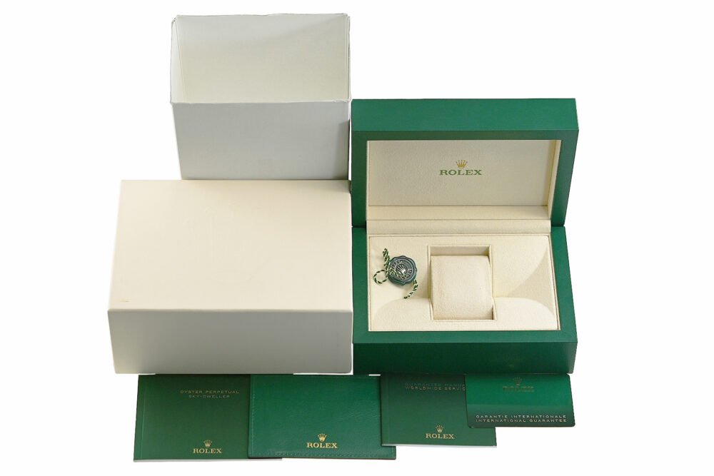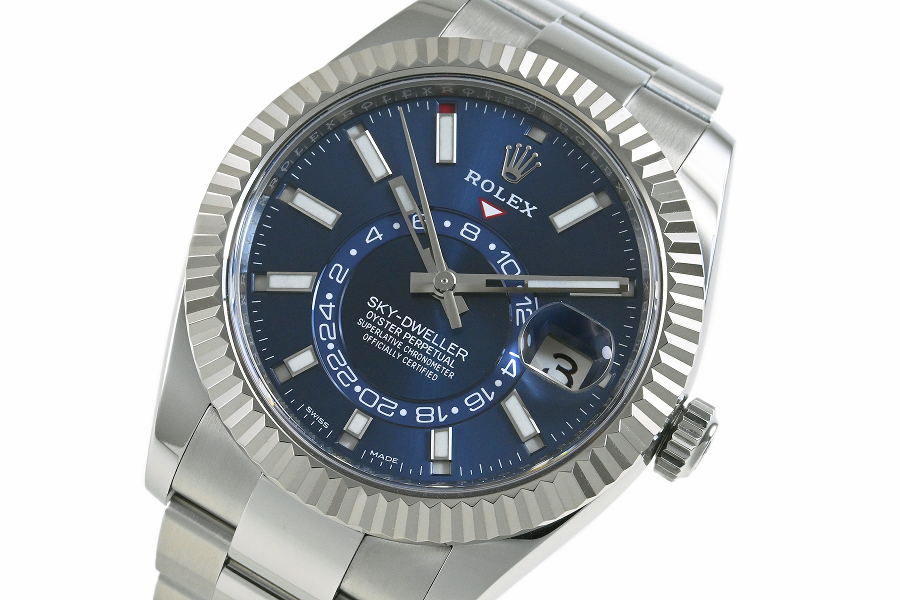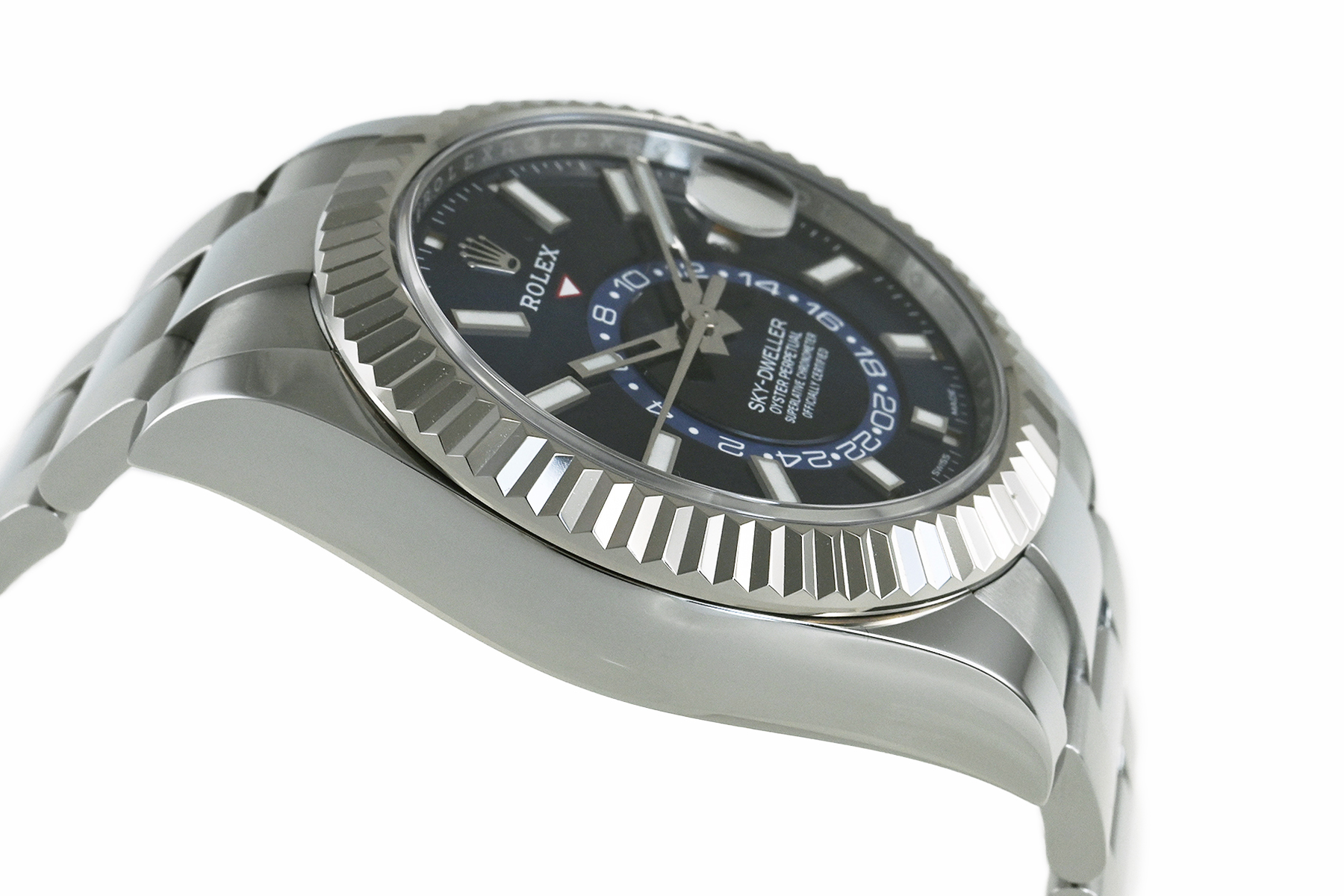| コメント | 2012年に登場した「スカイドゥエラー」。2タイムゾーン、24時間表示、年次カレンダーを搭載、華やかなフルーテッドベゼルを回転させ、3つの機能(日付、ローカルタイム、ホームタイム)の変更が可能となります。ロレックス完全自社製造の高精度クロノメーターキャリバー9001を搭載、この型は生産終了となっています。少々の細かな軽い擦りキズはありますが目立つ様な深いキズはありません。2024年1月に日本ロレックスにて内部点検、精度調整をしています。 |