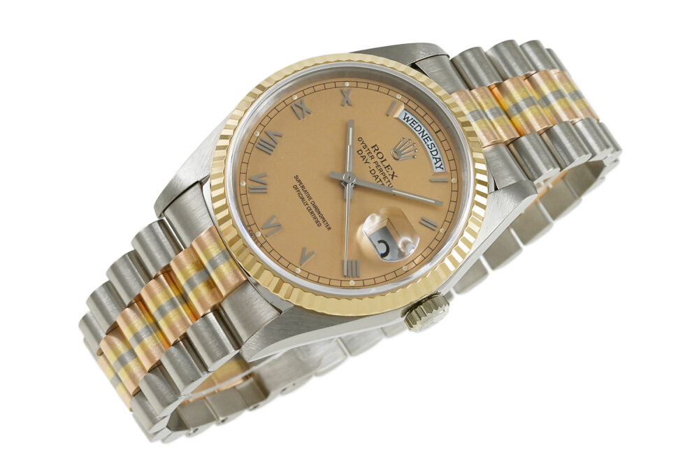 | コメント | 1956年に誕生したロレックス 最高峰モデル「オイスター パーペチュアル デイデイト」。生産終了モデル「Ref.18239」の、イエローゴールド・ホワイトゴールド・ピンクゴールドの3カラーゴールドを使用したトリドールブレスモデルです。独特な雰囲気を醸し出すカッパーダイアルがオシャレです。少々の軽い擦りキズはありますが目立つ様な深いキズはありません。2024年4月に日本ロレックスサービスにてバネ棒交換をしています。 |