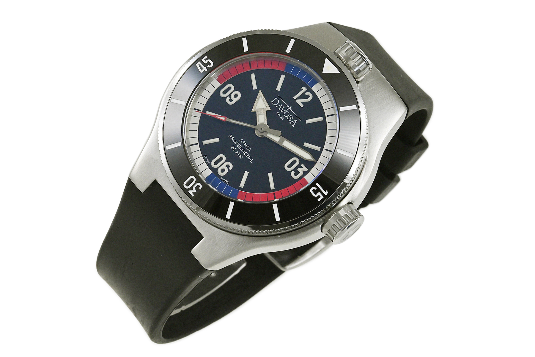 | コメント | ダボサ アプネア ダイバーは、プロのフリーダイバーNik Linder氏協力のもと生まれたダイバーズウォッチです。3時位置のリューズで取り外しが可能、デスクウォッチ機能も備えたユニークなモデルです。使用に伴う多少の小キズ・擦りキズがあります。目立つ様な大きなキズはありません。付属のラバーベルトは全体に使用に伴う擦れはありますがヒビなどの傷みはありません。 |