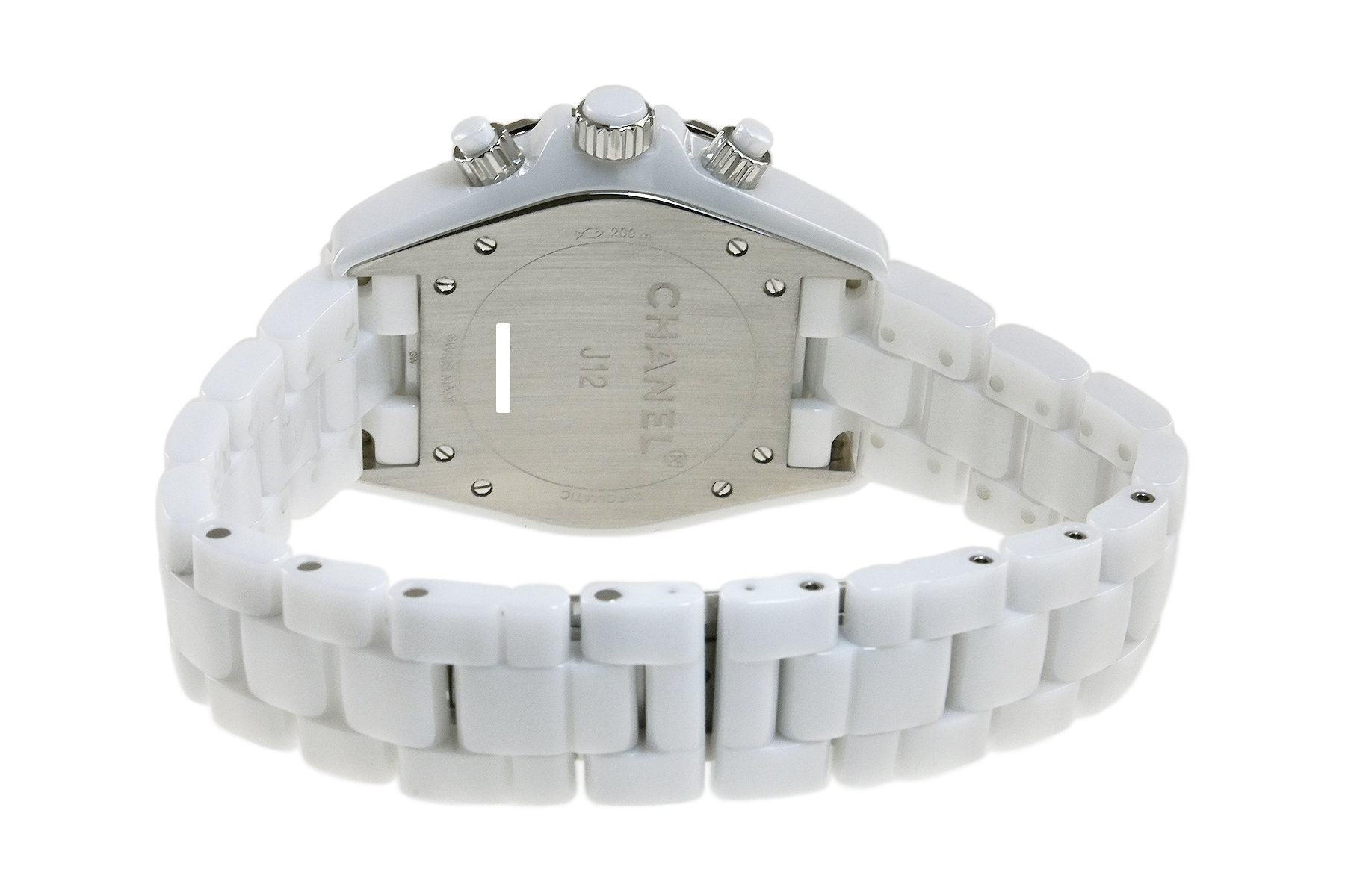 | コメント | シャネル人気スポーツコレクション「J12」、自動巻クロノグラフモデルです。硬くてキズのつき難いセラミック素材を採用、艶やかなホワイトセラミックがオシャレです。インデックスにダイヤモンドをセットしたラグジュアリーな仕様です。裏蓋に極小キズ、その他僅かな軽い擦れはありますが目立つ様なキズはありません。2024年4月に当店契約の修理サービスにてオーバーホールをしています。 |