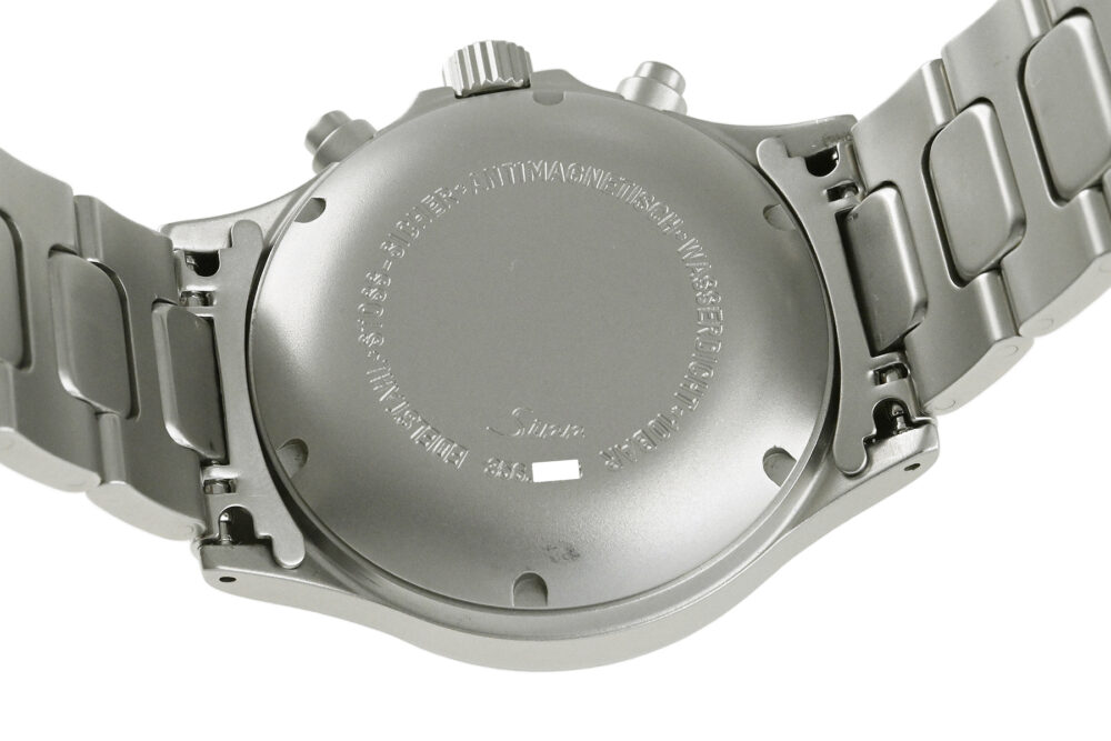 | コメント | NATO軍が使用しているユーロコプター用のコックピット・クロノグラフをイメージしたモデルです。左リューズを採用、ハンドにはコックピット内の特殊ランプでオレンジイエローに蛍光する特殊な塗料が使用されています。使用に伴う若干の擦りキズはありますが目立つ様な深いキズはありません。風防にキズ・擦りキズがあります。国内正規店にて購入品です。 |