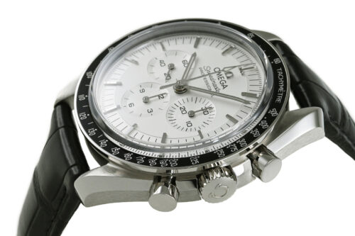 コメント 1957年に誕生した人気モデル「スピードマスター プロフェッショナル」。1969年、人類初の月面着陸に立ち会うという輝かしい名誉のあるモデルです。オメガ独自の18Kホワイトゴールド合金「カノープスゴールド™」製、第4世代のスピードマスターのデザインからインスピレーションを得た非対称ケース、段差のあるサンブラッシュ仕上げのシルバーダイアル、アルミニウム製ベゼルリングには「ドットオーバー90」(90の数字の上にドット)を採用しています。耐磁性テクノロジ⁠ーを採用したオメガ コーアクシャル マスター クロノメーター キャリバー3861を搭載。ベゼルエッジ部分の6分17分18~20分位置にあてキズがあり、7時ラグに1.5mm程のキズがあります。Dバックルにも少しキズ・擦りキズがあります。その他は少々の軽い擦りキズは目立つ様な深いキズはありません。国内正規店にて購入品です。