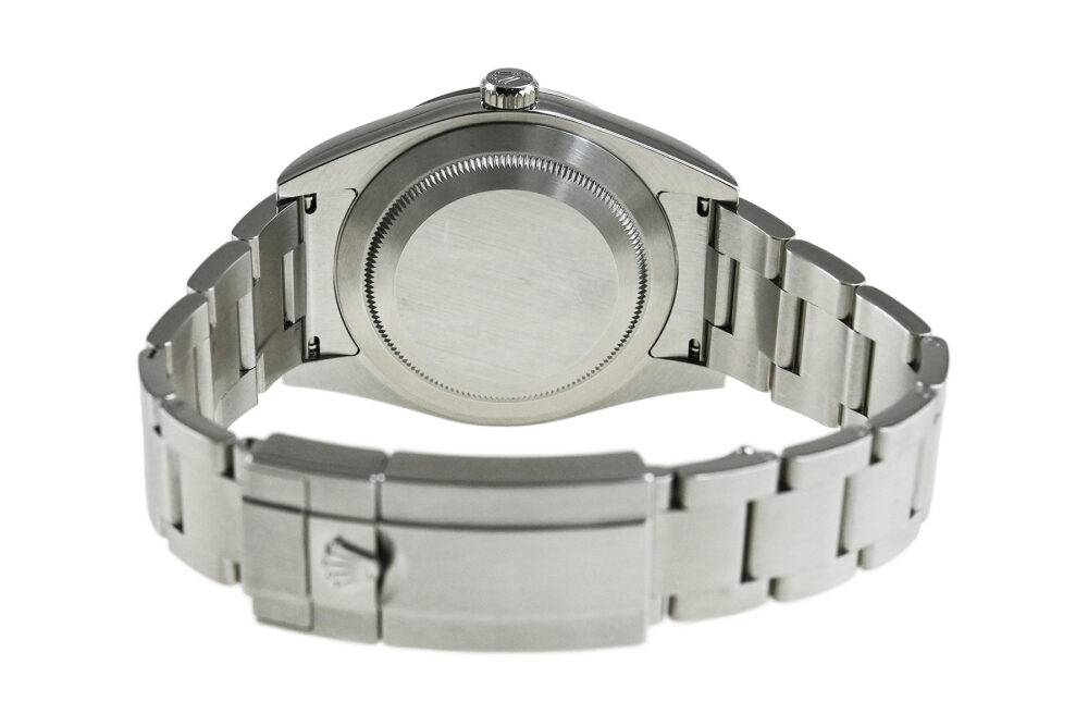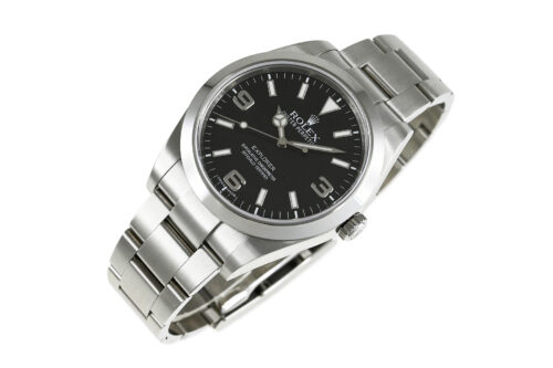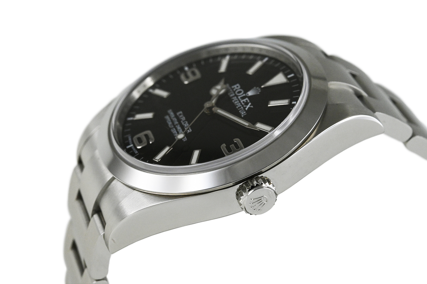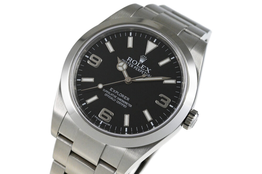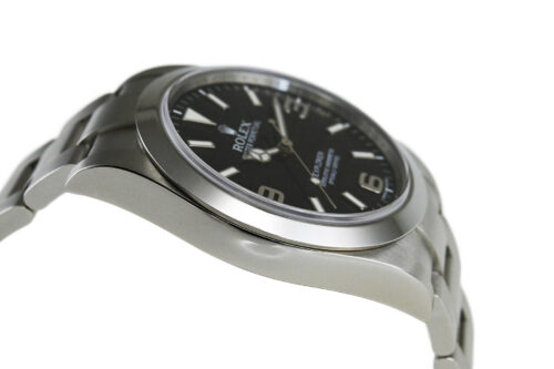 コメント | 1953年デビューの「エクスプローラーI」。3・6・9の数字が特徴的、シンプルでスタイリッシュなデザインはどんなシーンにもマッチする、スポーツ・ロレックス人気モデルです。2010年にモデルチェンジした「Ref.214270」は、ケースサイズが35mmから39mmにサイズアップしました。インデックス(3・6・9)は夜光塗料のないメタル仕様のタイプ(ブラックアウト)です。ロレックス完全自社製造の高精度クロノメーターキャリバー3132を搭載しています。裏蓋など少々の軽い擦りキズはありますが目立つ様な深いキズはありません。 |