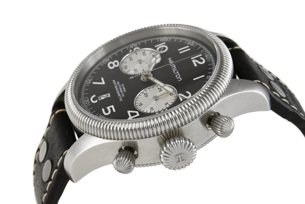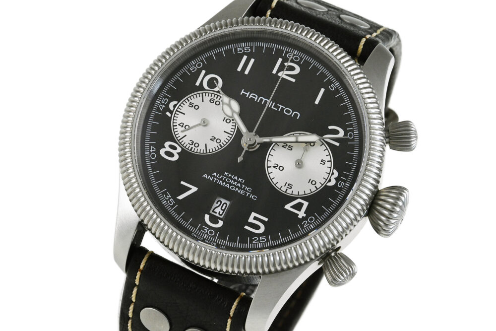 | コメント | 1892年、アメリカ合衆国ペンシルバニア州ランカスターで創業したハミルトン。コインエッジベゼルやコブラ針などクラシカルな雰囲気でオシャレなクロノグラフモデル「カーキ パイオニア オート クロノ」自動巻モデルです。逆パンダダイアルが特徴的です。僅かな軽い小キズ・擦りキズはありますが目立つ様なキズはありません。 |