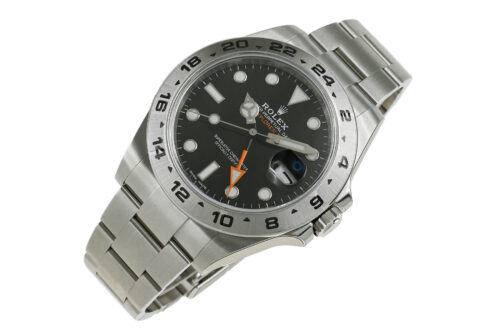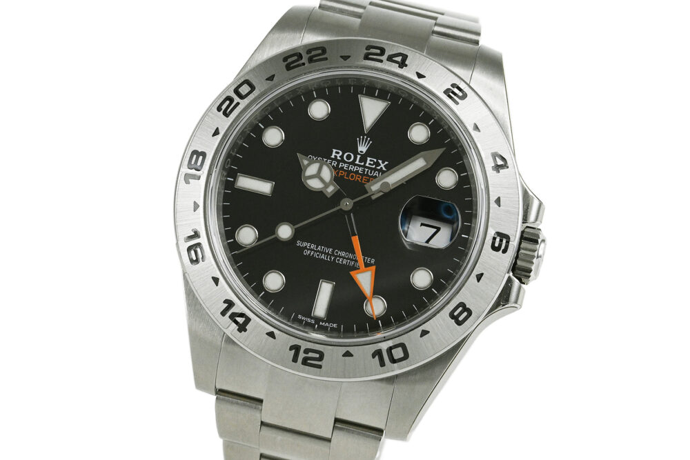 | コメント | 2011年にモデルチェンジした「エクスプローラーII Ref.216570」。ケースサイズが40mmから42mmにサイズアップしました。ファーストモデル「Ref.1655」を彷彿とさせるオレンジカラーのGMT針が印象的です。ベゼル、ケースサイド(3時側のみ)、裏蓋、バックルに保護シールが付いたままの未使用の状態です。 |