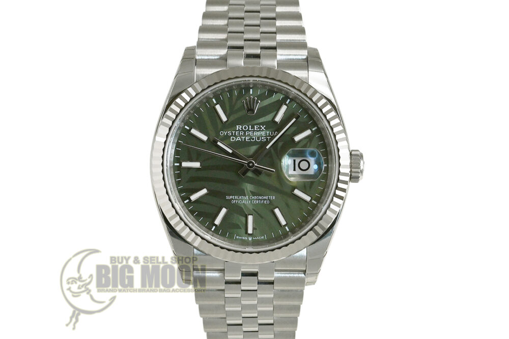 | コメント | 流行に左右されない美しさと機能を兼ね備えたロレックス・クラシック ウォッチ「デイトジャスト」、小振りなケース径36mmサイズモデルです。K18ホワイトゴールド製フルーテッドベゼルにジュビリーブレスがとてもエレガントで、オリーブグリーン、パームモチーフダイアルが特徴的です。ロレックス完全自社製造の高精度クロノメーターキャリバー3235を搭載しています。ケースサイド、裏蓋、バックルに透明保護テープの付いたままの未使用の状態です。 |