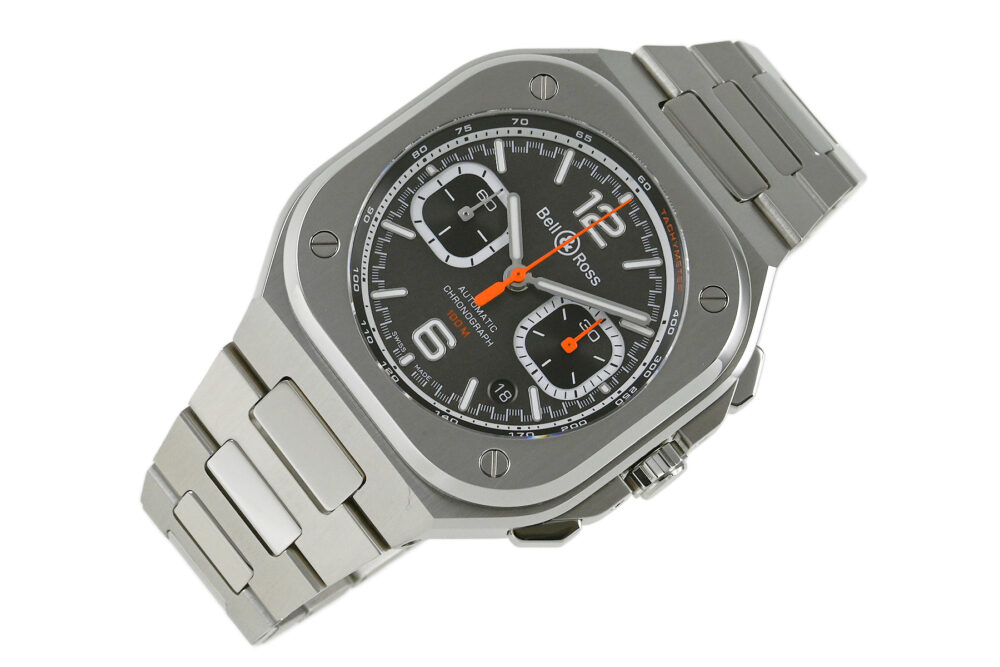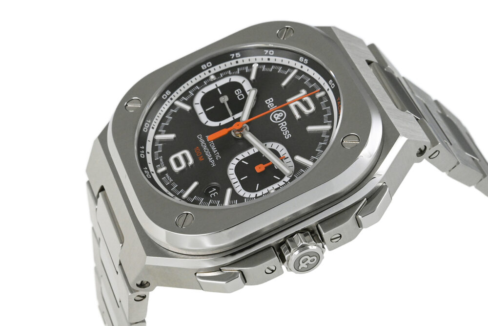 | コメント | 1991年にブルーノ・ベラミッシュとカルロス・ロシロの旧友2人によりフランス・パリで誕生した「ベル&ロス」。過酷な状況に挑むプロフェッショナル達が使用するにふさわしい完璧な時計作りをコンセプトとしております。「丸」と「四角」を組合わせたケースデザインが特徴的な「BR 05」コレクションのクロノグラフモデルです。ケースとブレスレットが一体型となったデザインとなっています。落ち着きと洗練さを感じさせるアンスラサイトダイアル採用の日本99本限定モデルです。僅かな軽い擦れはありますが目立つ様なキズはありません。国内正規店にて購入品です。 |