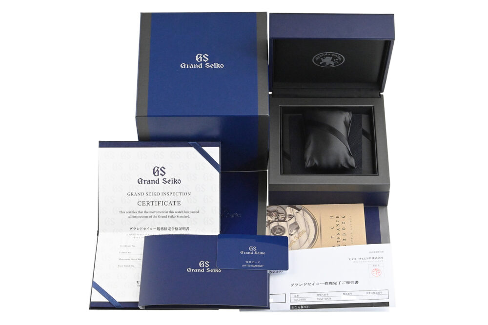 | コメント | 機械式グランドセイコーの製造拠点「グランドセイコースタジオ 雫石」。同じ岩手県にある平庭高原の白樺林に着想を得て、丁寧に作り込り込まれた型打ちのダイヤルが魅力的なモデルです。高効率な脱進機やツインバレル採用で最大巻上時約80時間のパワーリザーブを備えた、毎時36,000振動のハイビートムーブメント「キャリバー9SA5」を搭載、裏蓋シースルーバックとなっています。ブレス裏側に使用に伴う若干の小キズ・擦りキズはありますが目立つ様な深いキズはありません。2025年4月に正規修理サービスにてオーバーホールをしています。 |