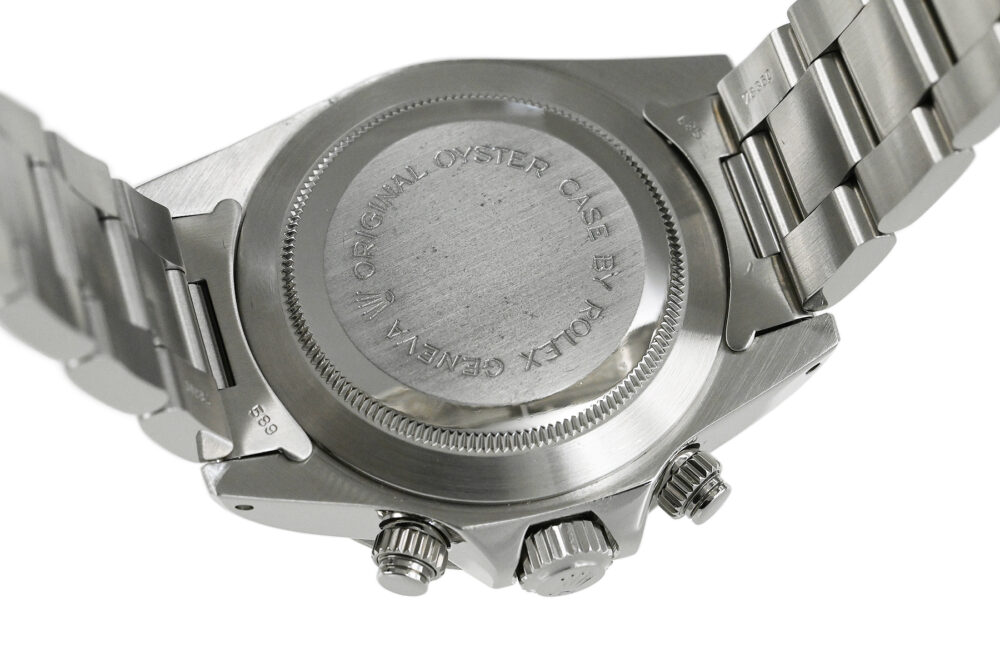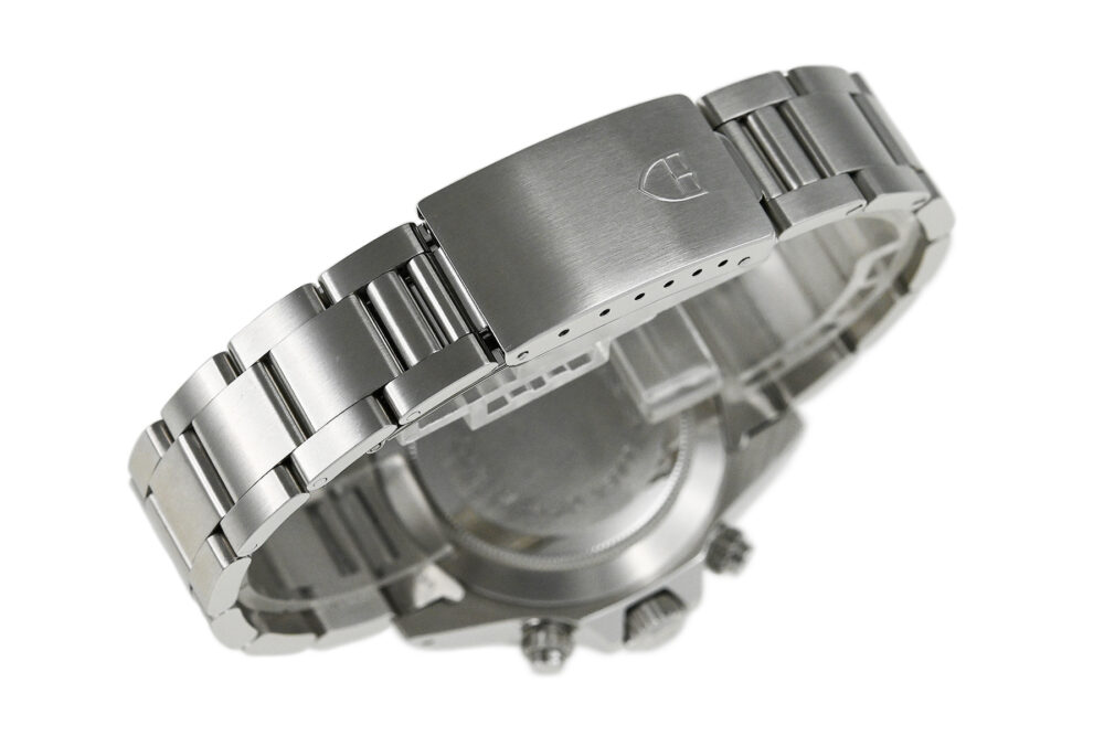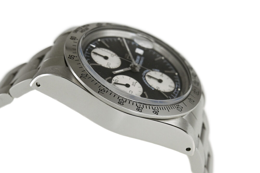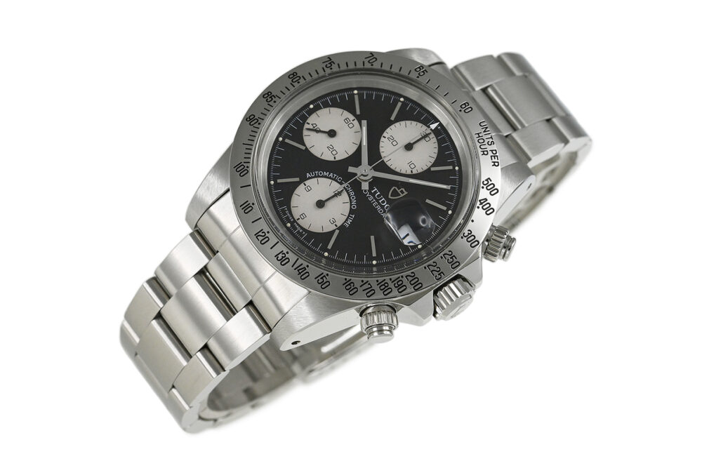 | コメント | ロレックスの兄弟ブランド「チューダー」の人気モデル「クロノタイム」。直線を基調とした武骨なラインが特徴的なケース、ブラック×ホワイトダイアルが独特な雰囲気を醸し出しています。裏蓋、リューズにはロレックスの王冠マークがあります。9時側ケースサイドエッジ部分(裏蓋側)にあてキズがあります。プラスチック風防のエッジ部分の所々に小キズ、平面に細かな擦りキズがあります。30分計、12時間計、スモールセコンドの針に経年変化による劣化が見られます。2025年10月に当店契約の修理サービスにてオーバーホールをしています。 |