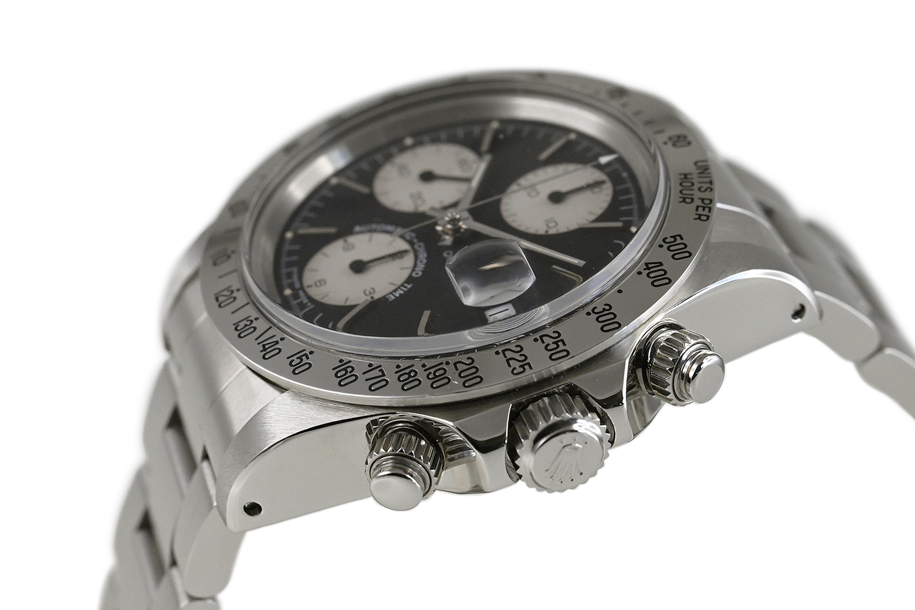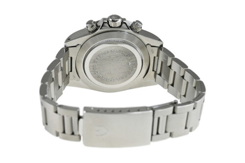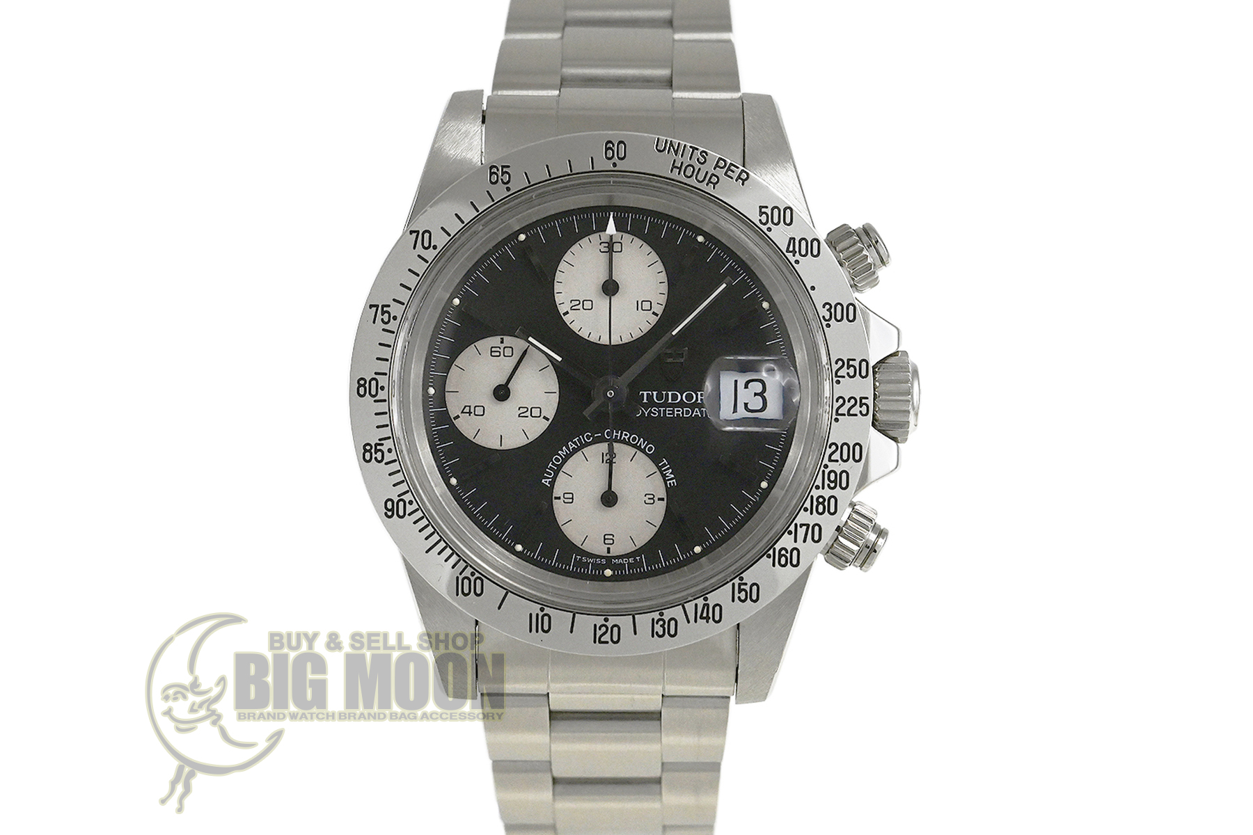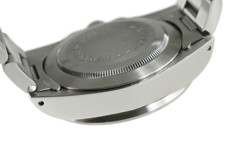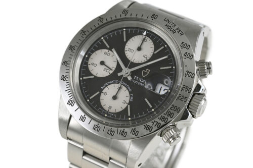 | コメント | ロレックスの兄弟ブランド「チューダー」の人気モデル「クロノタイム」。直線を基調とした武骨なラインが特徴的なケース、ブラック×ホワイトダイアルが独特な雰囲気を醸し出しています。裏蓋、リューズにはロレックスの王冠マークがあります。9時側ケースサイドエッジ部分(裏蓋側)にあてキズがあります。プラスチック風防のエッジ部分の所々に小キズ、平面に細かな擦りキズがあります。30分計、12時間計、スモールセコンドの針に経年変化による劣化が見られます。2025年10月に当店契約の修理サービスにてオーバーホールをしています。 |