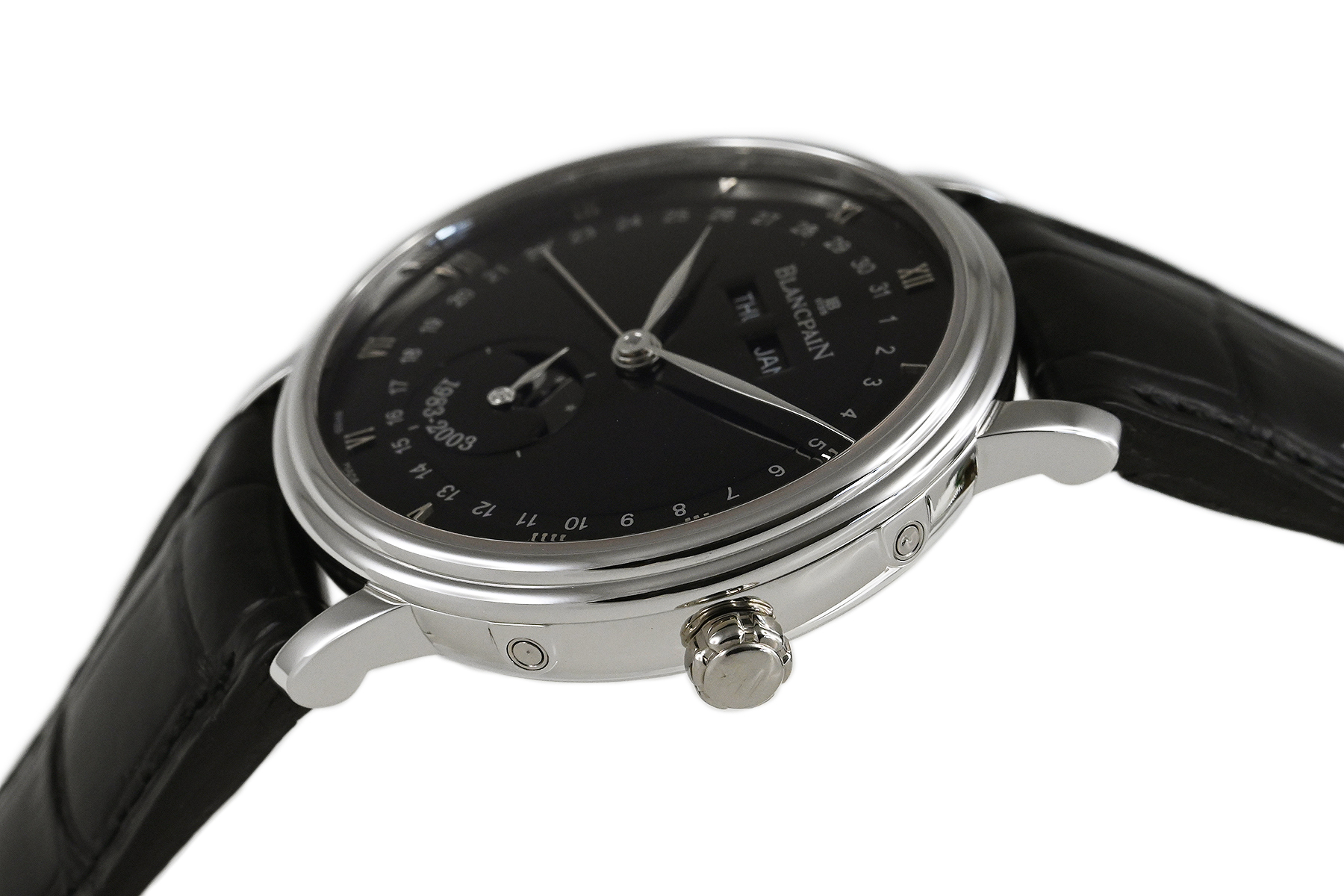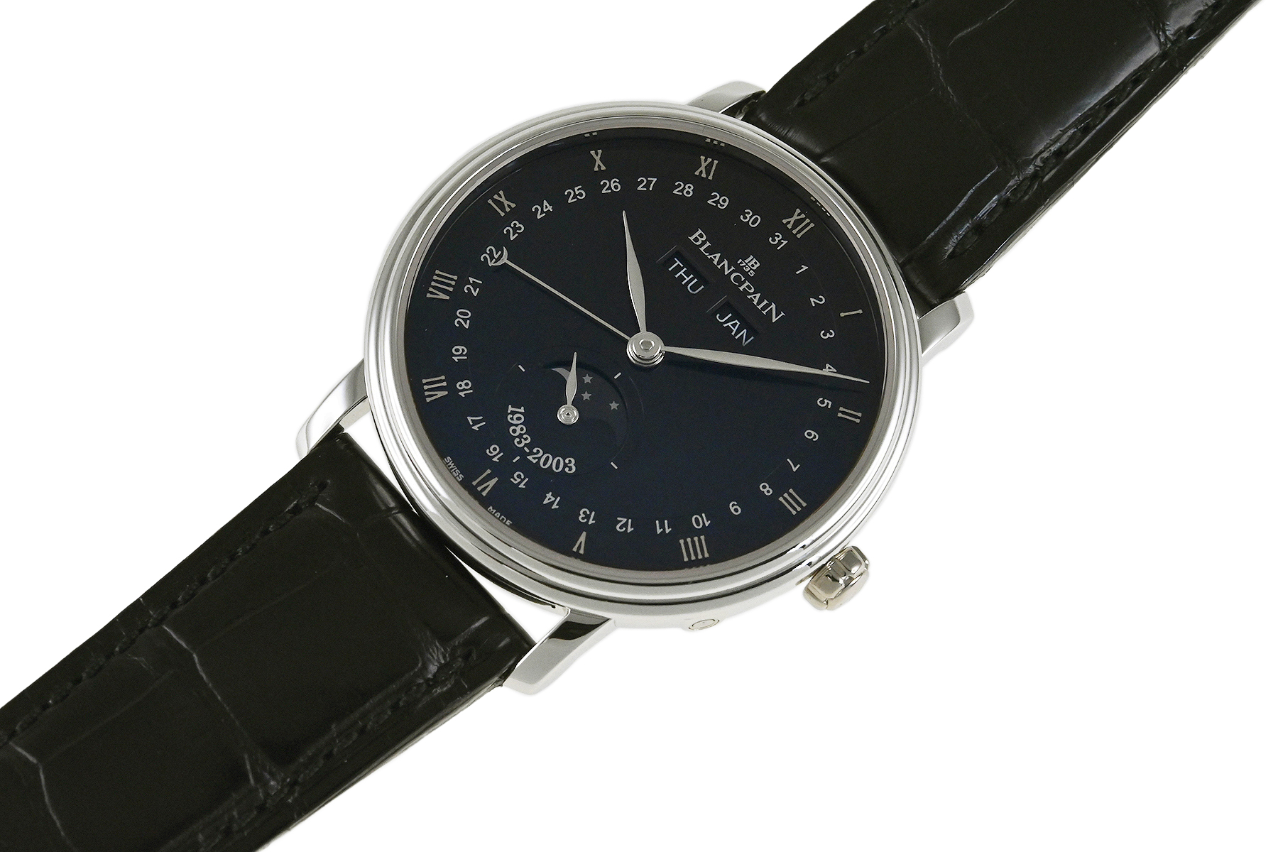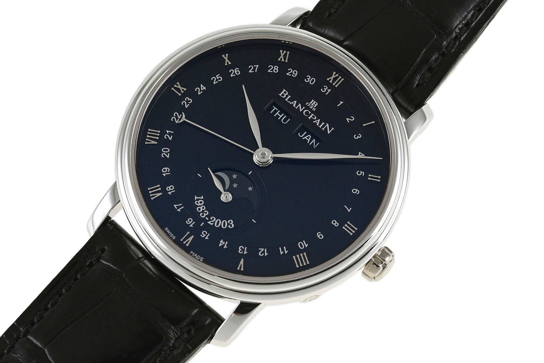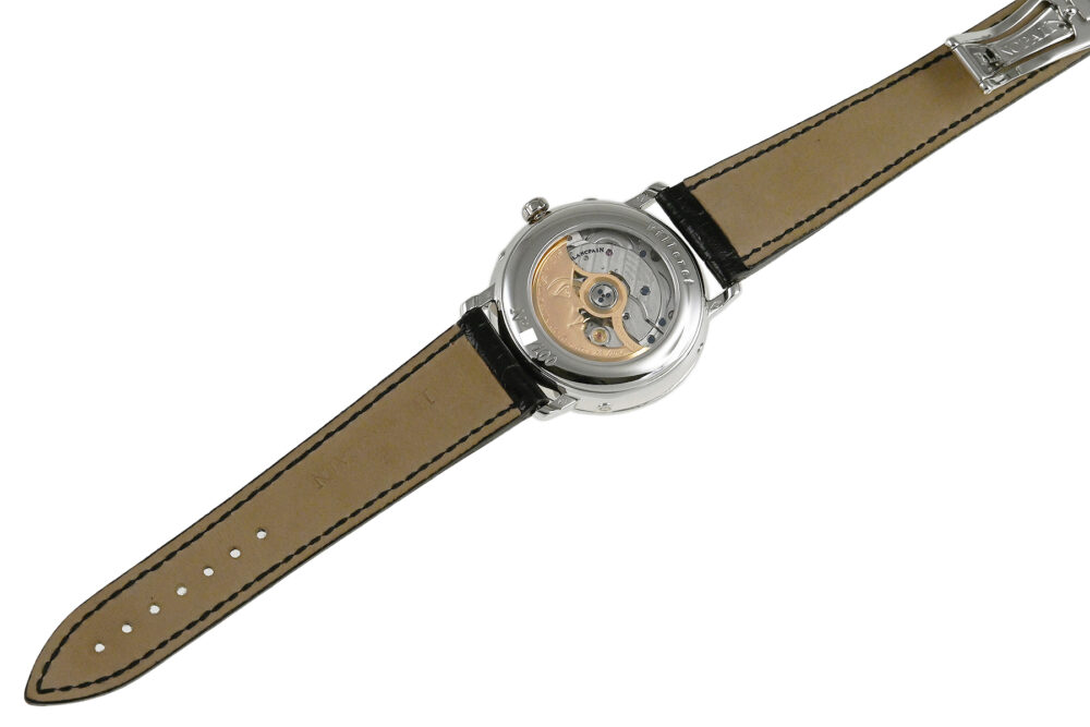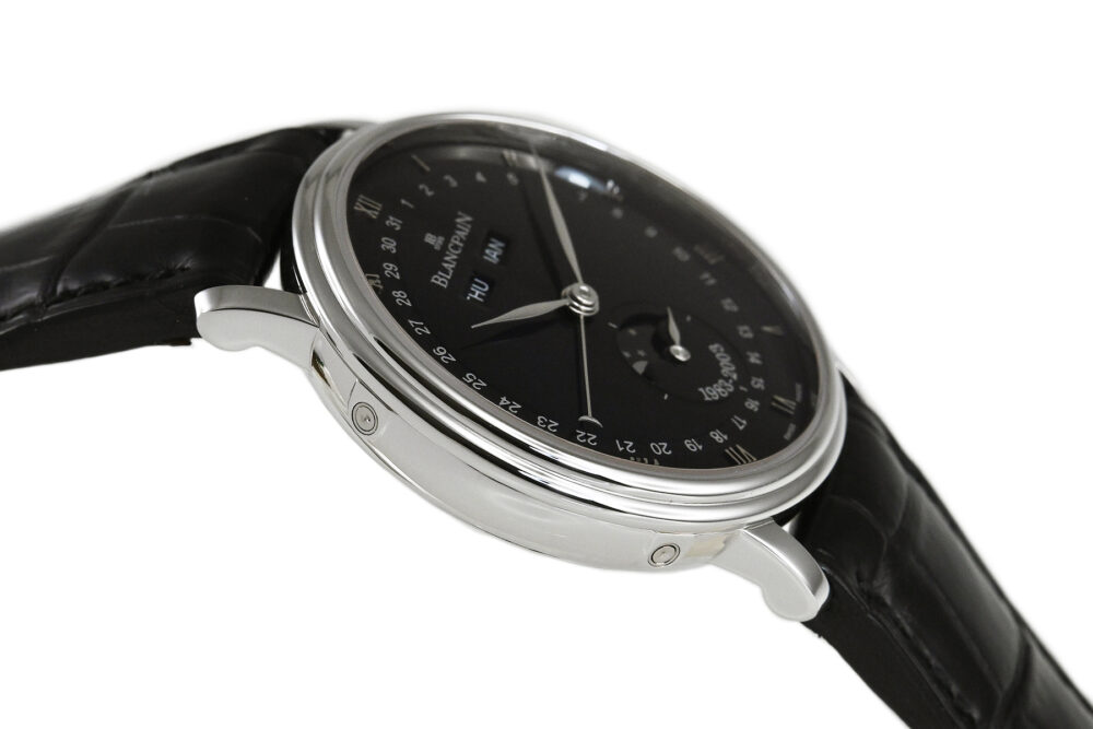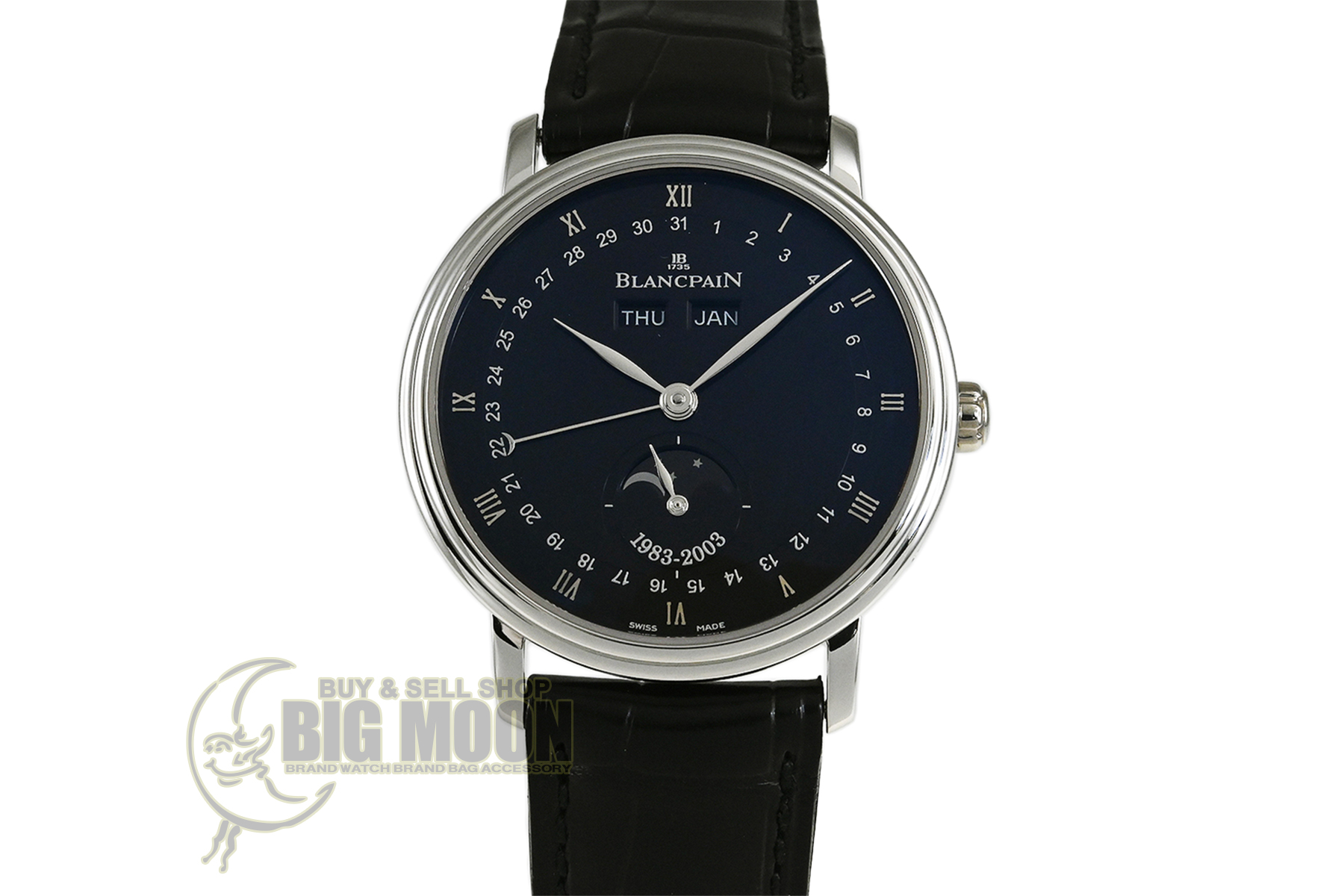 | コメント | 1735年創業の世界最古の時計ブランド「ブランパン」。ムーンフェイズモデルを数多く生産しているブランパンのムーンフェイズ製作20周年を記念したリミテッドモデルです。ダイアル6時位置に「1983-2003」と記され、ローターには三日月が彫り込まれています。 月・日・曜日を表示する複雑機構 コンプリートカレンダーとムーンフェイズを搭載、プラチナ100本限定モデルです。少々の細かな軽い擦りキズはありますが目立つ様な深いキズはありません。国内正規店にて購入品、2026年1月に正規修理サービスにてコンプリートメンテナンスサービスをしています。 |