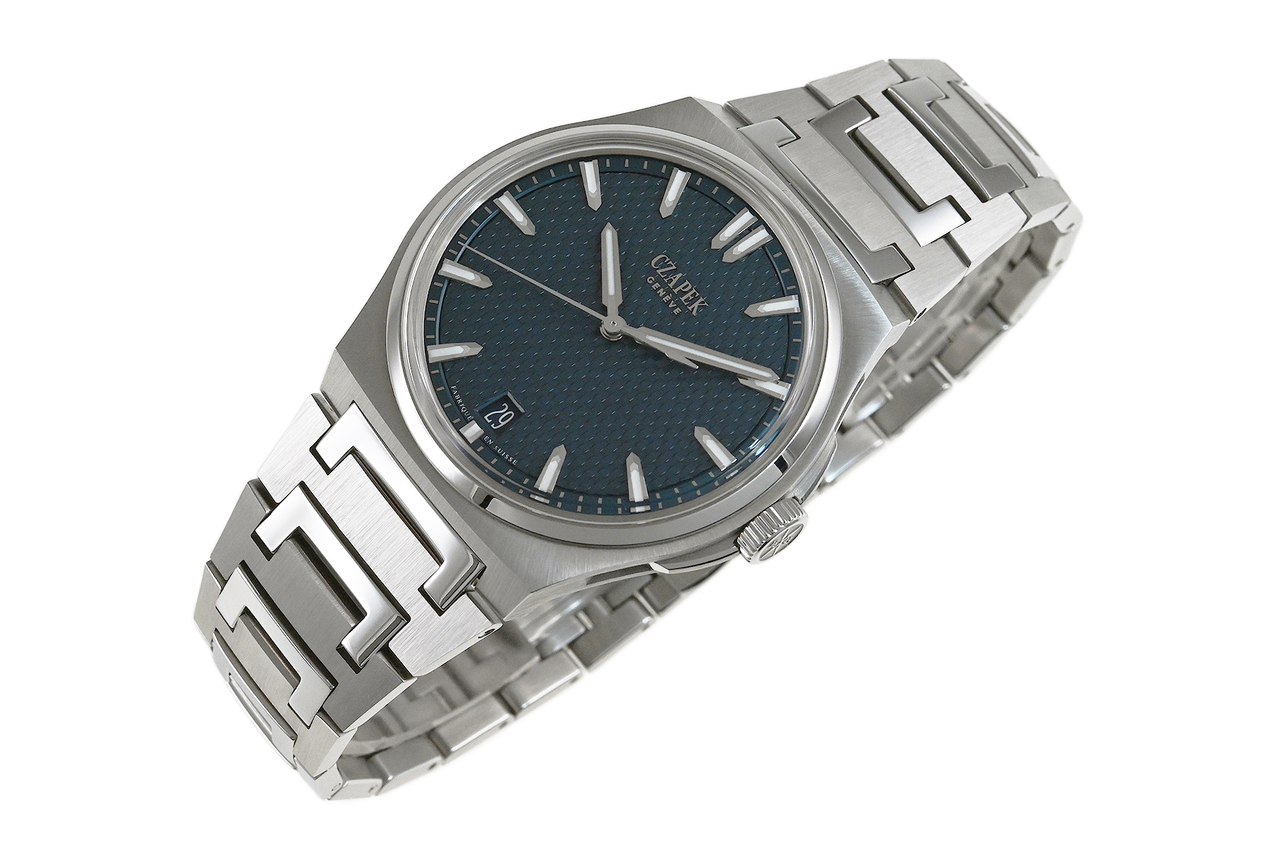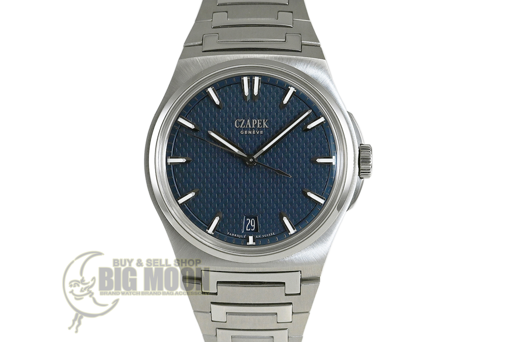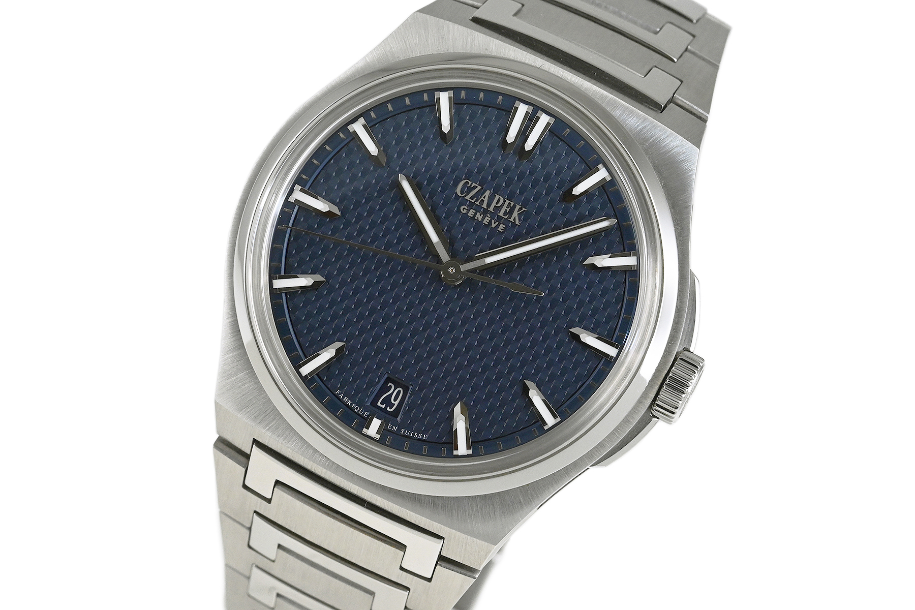 | コメント | チャペックのスポーツモデル「アンタークティック」コレクション。「Stairway to Eternity–永遠への階段」と名付けられたパターンダイアル、チャペックの「C」の形がデザインされた人間工学に基づいた滑らかなブレスレットが特徴的です。独自の「イージー・リリース」システムを備えており付属のラバーベルトに素早く交換が出来ます。使用に伴う若干の小キズ・擦りキズはありますが、目立つ様な深いキズはありません。国内正規店にて購入品、2025年11月に正規修理サービスにてリューズ交換をしています。 |