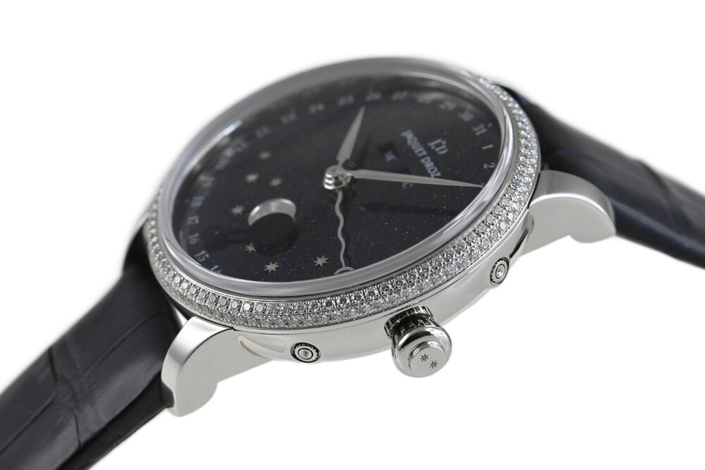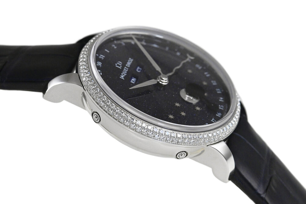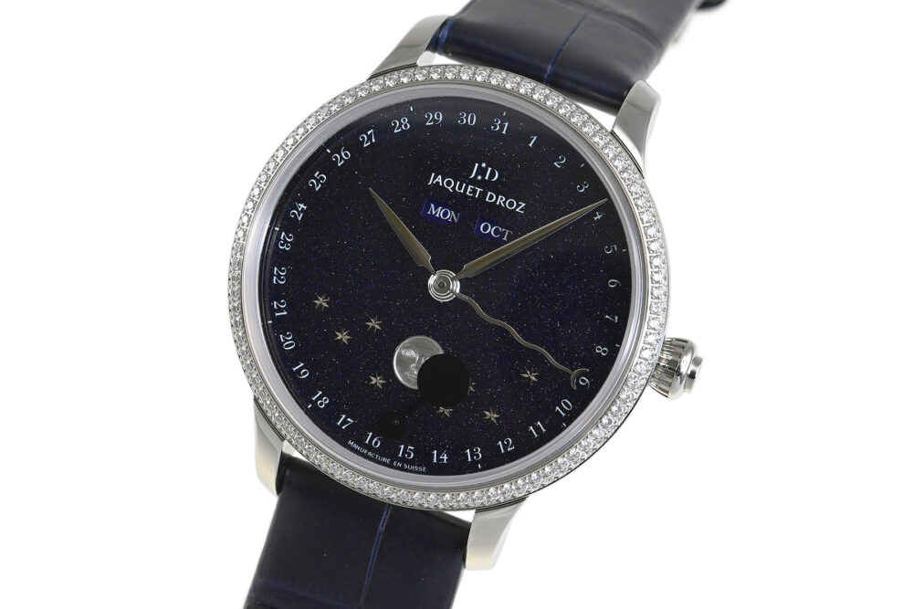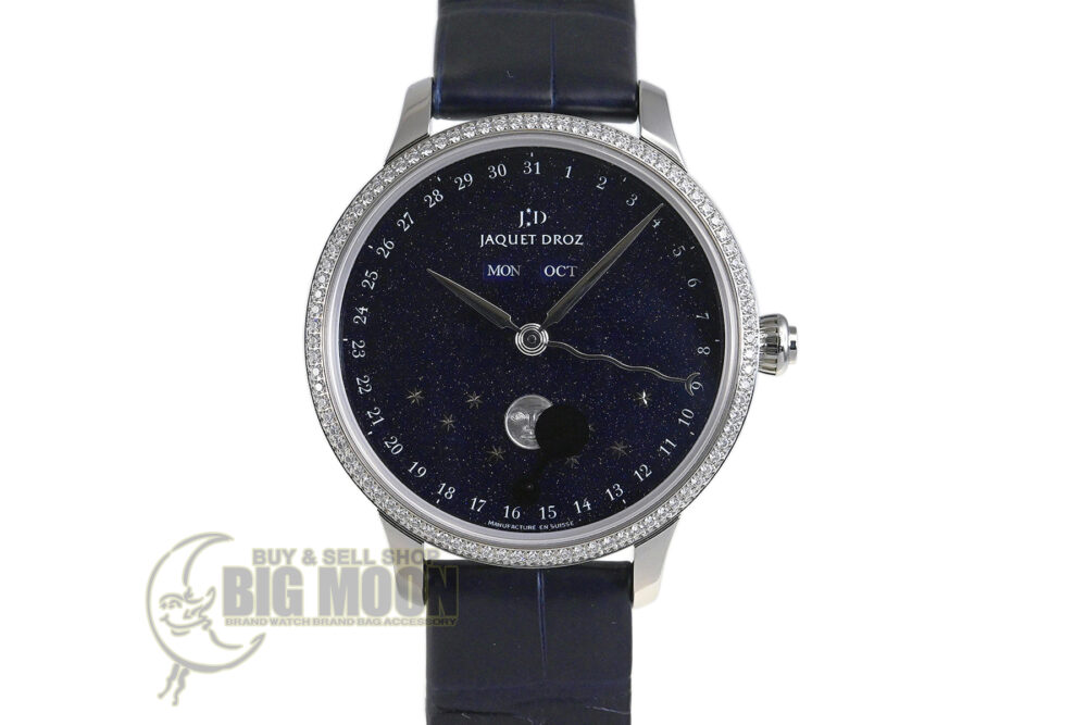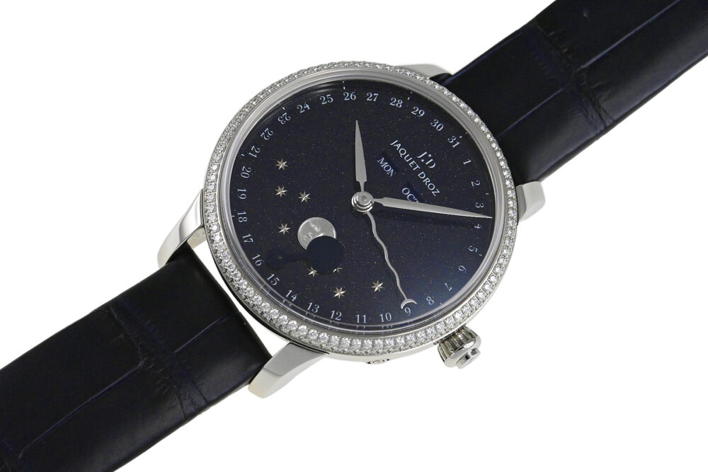 | コメント | 1738年スイスにて創業の「ジャケ・ドロー」。綺麗なダイヤモンドベゼル、アベンチュリンダイアルが魅力的な「エクリプス」、自動巻モデルです。12時位置下の小窓で月・曜日表示、 ポインターデイト表示、6時位置にレトログラード式ムーンフェイズを搭載しています。少々の軽い擦りキズはありますが目立つ様なキズはありません。国内正規店にて購入品です。 |