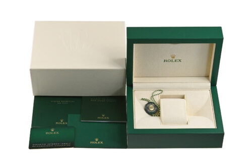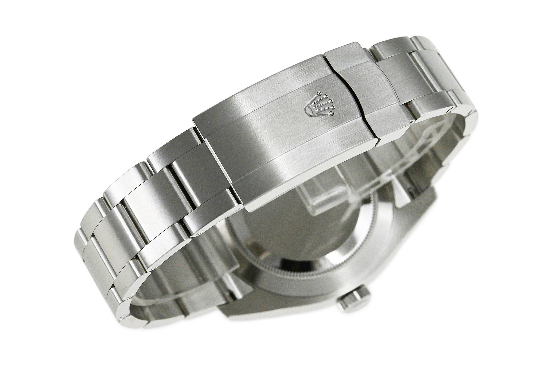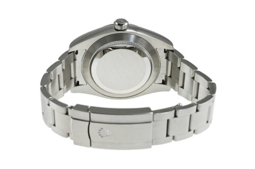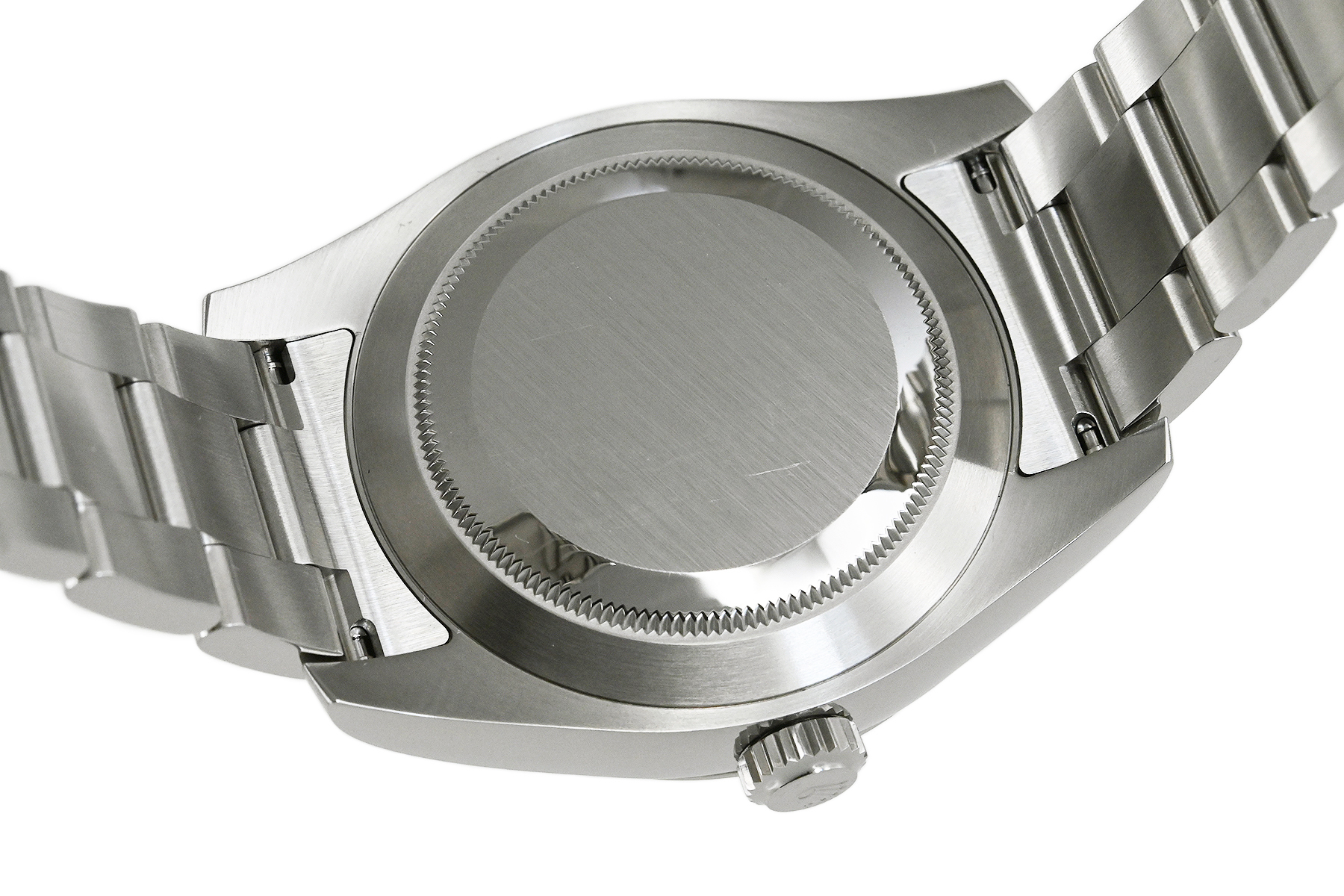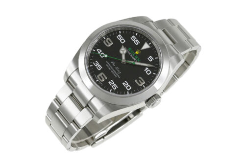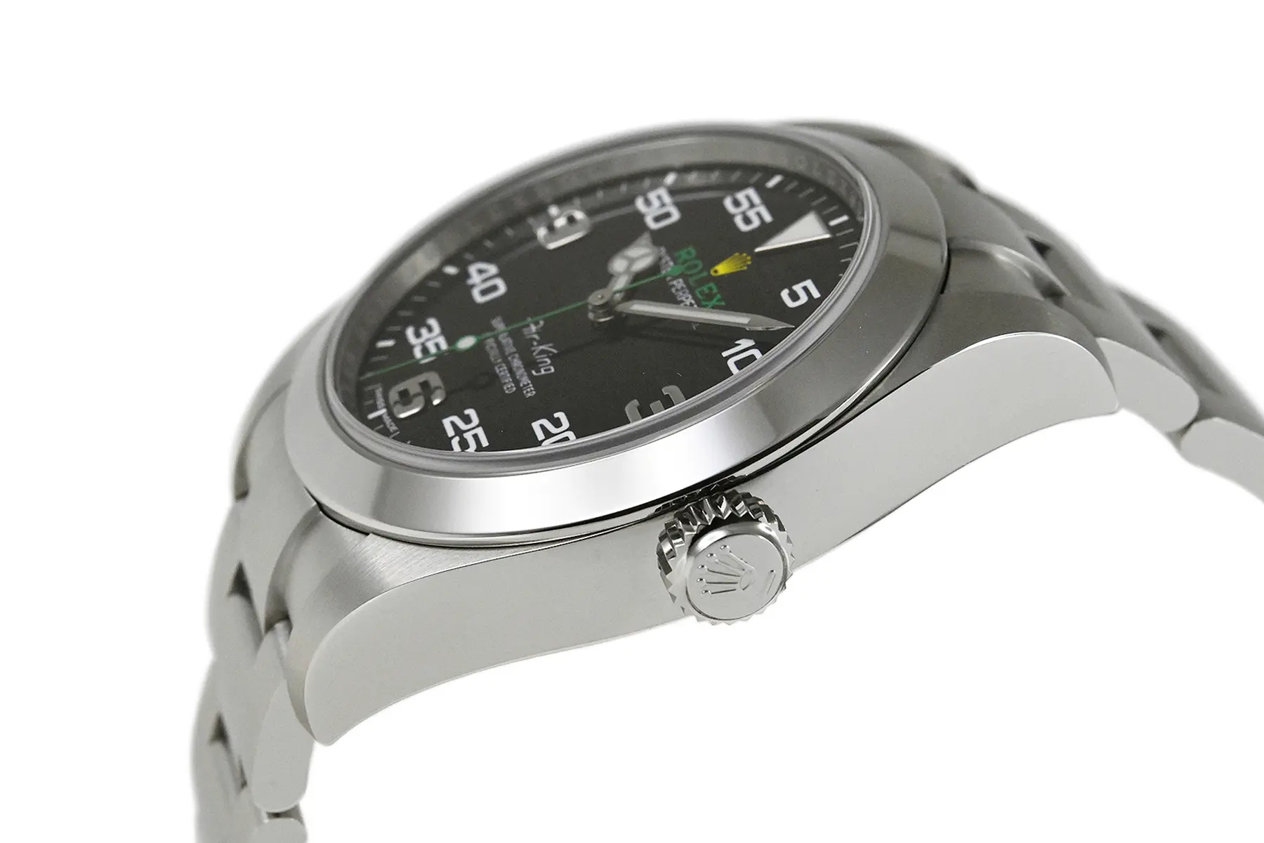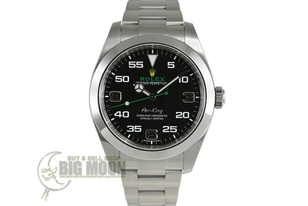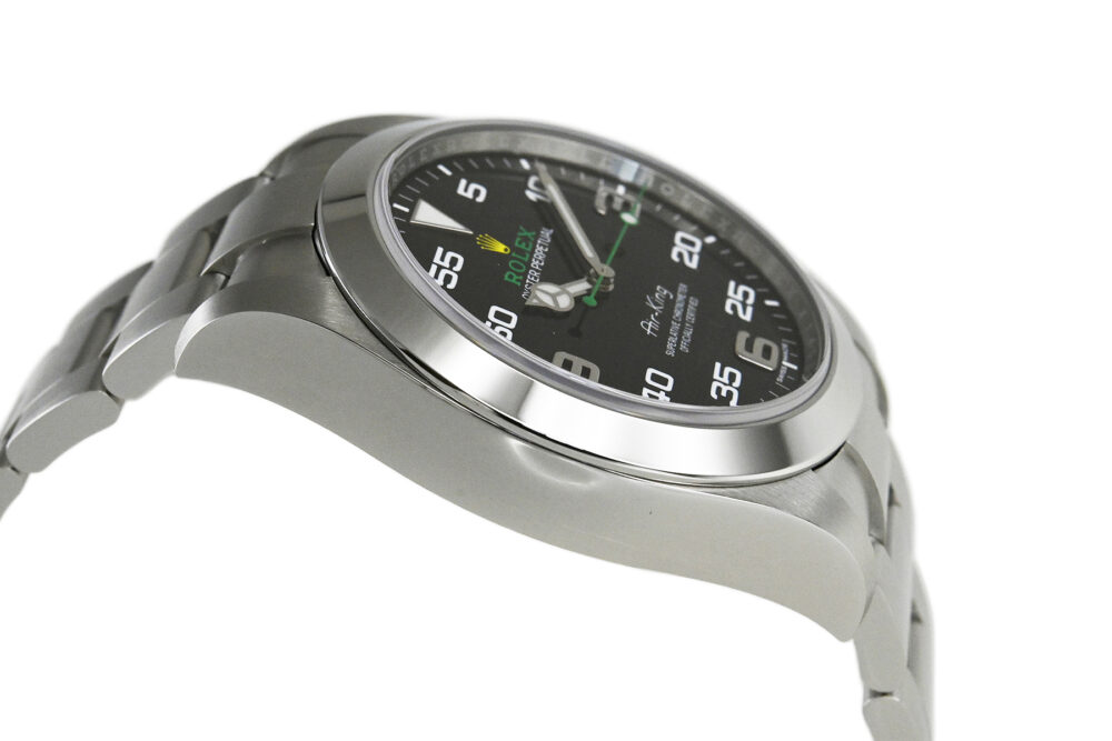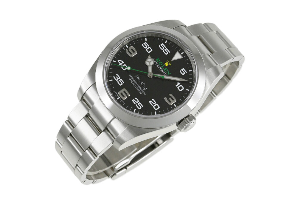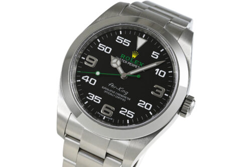 | コメント | 2016年に登場したエアキング「Ref.116900」。2014年のマイナーチェンジでダイヤルから「Air-king」ロゴが消え「エアキング」は終了していましたが、ケース径40mmにサイズアップして復活しました。この型は2022年頃まで製造されています。イエローカラーのクラウンマークやグリーンカラーのROLEXロゴ・秒針が特徴的で、針がペンシル型からベンツ針となりかなりスポーティーな印象となっております。ロレックス完全自社製造の高精度クロノメーターキャリバー3131を搭載。裏蓋など若干の軽い擦りキズはありますが目立つ様な深いキズはありません。 |