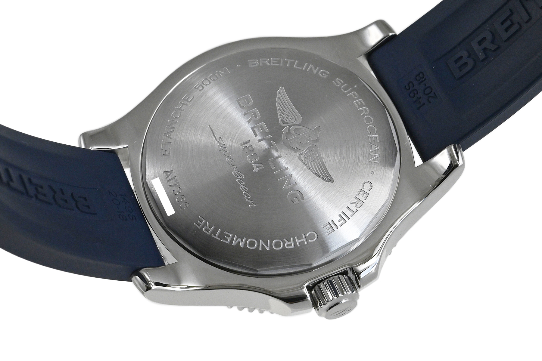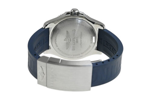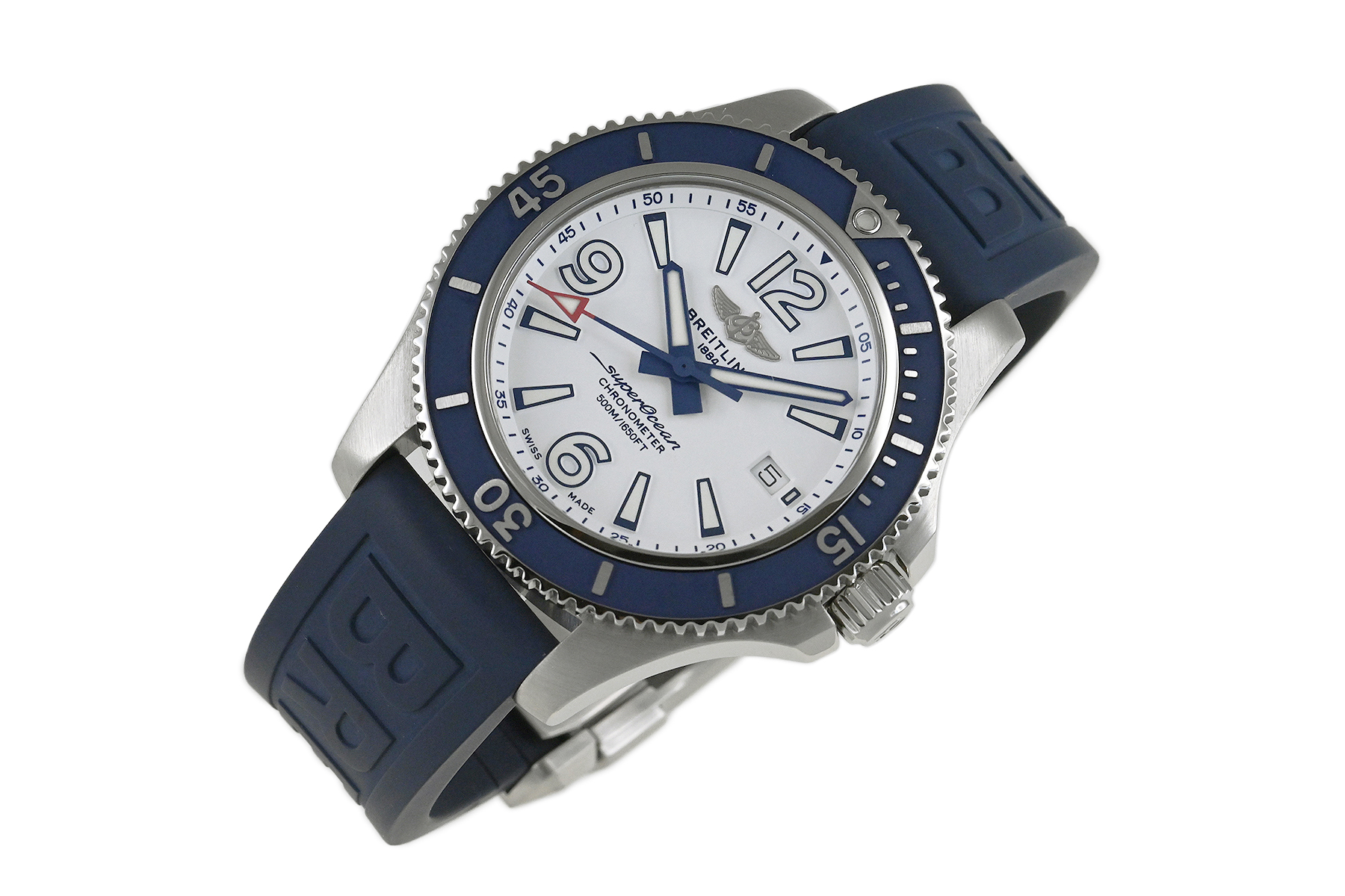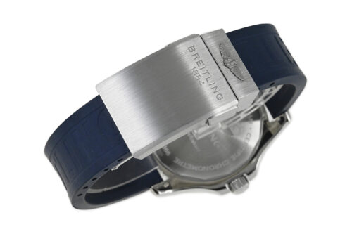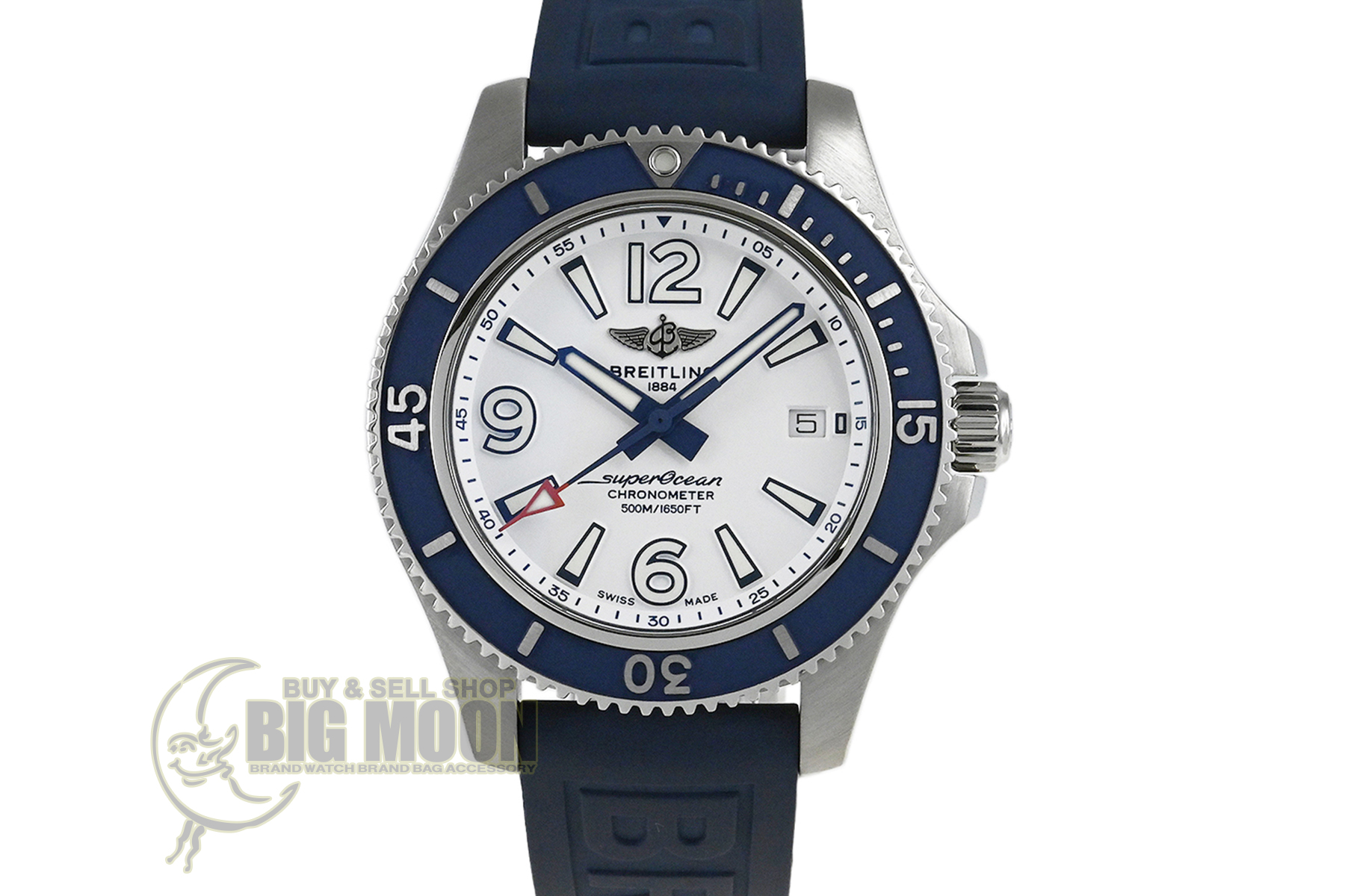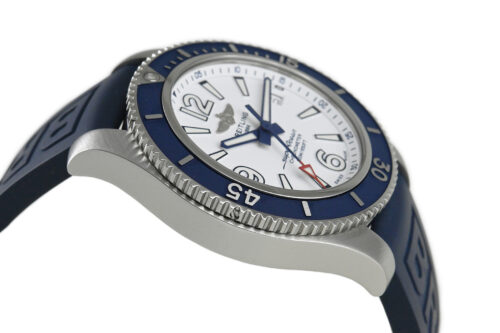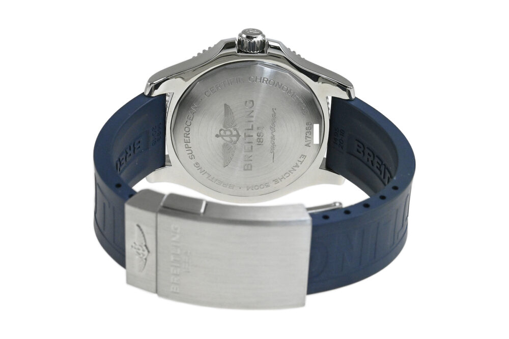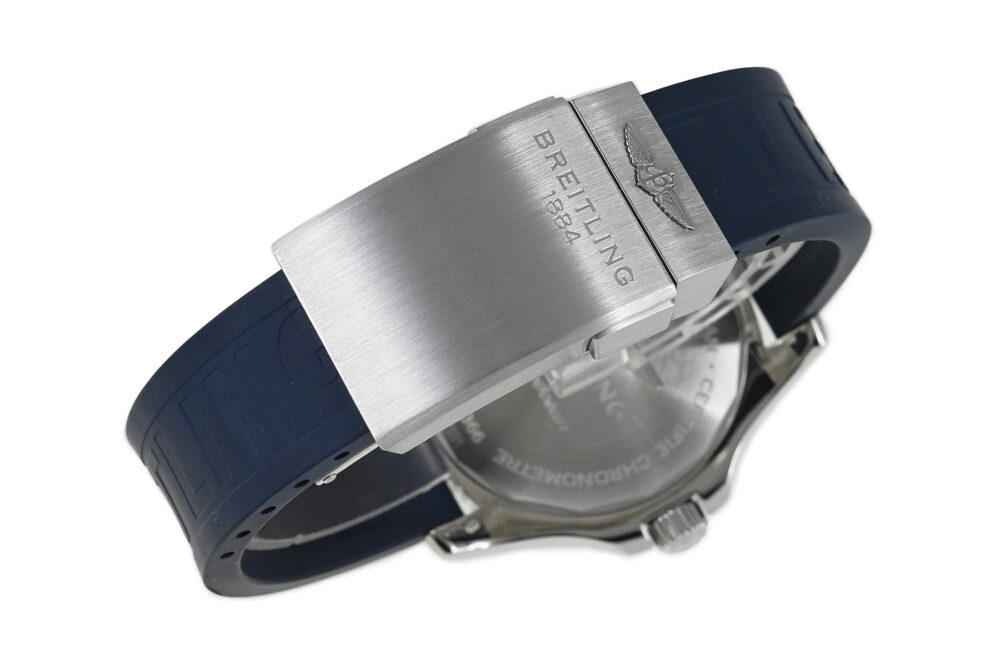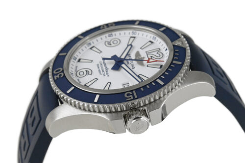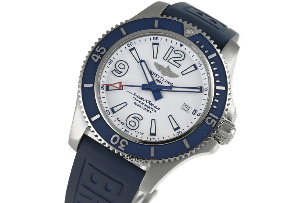 コメント ブライトリングを代表するダイバーズウォッチコレクション「スーパーオーシャン」。視認性の良いダイアルデザインが魅力的、爽やかなホワイトとブルーの組合せがスポーティーでオシャレです。少々の小キズ・擦りキズはありますが目立つ様なキズはありません。国内正規店にて購入品です。保証書にはブレス仕様の型番が記載されていますが現在はラバーベルトが付いています。