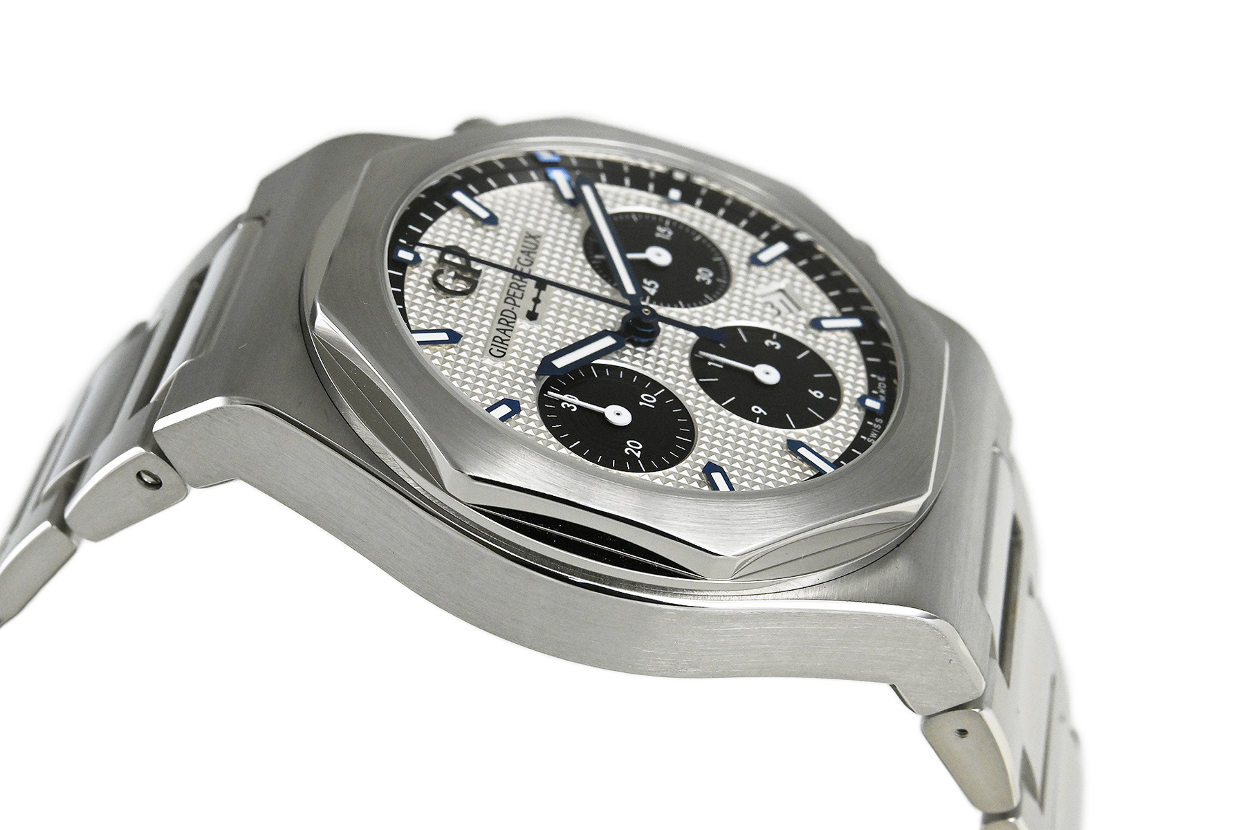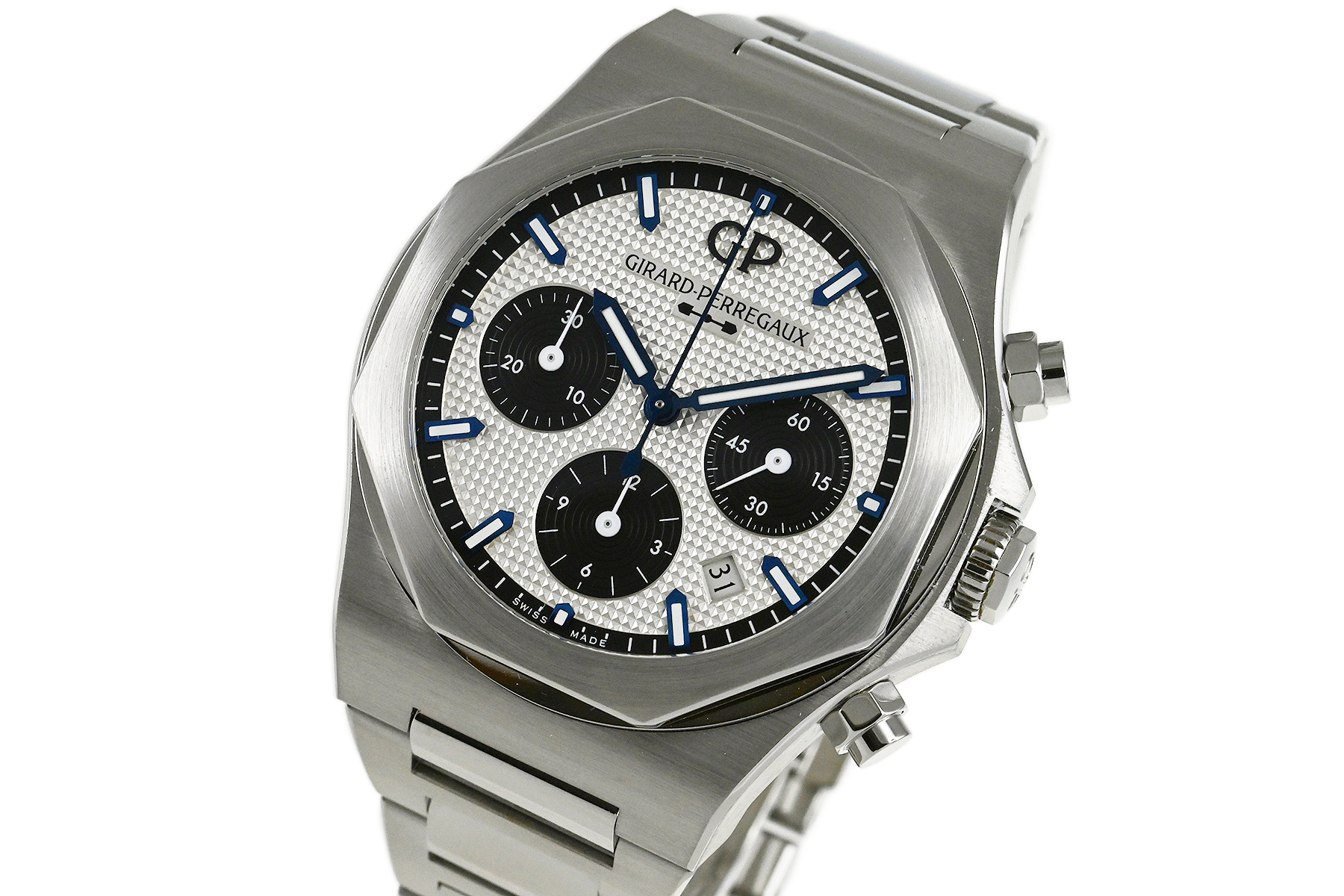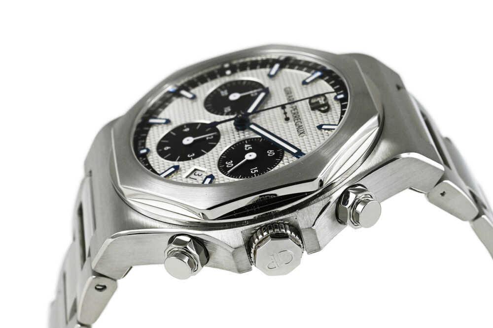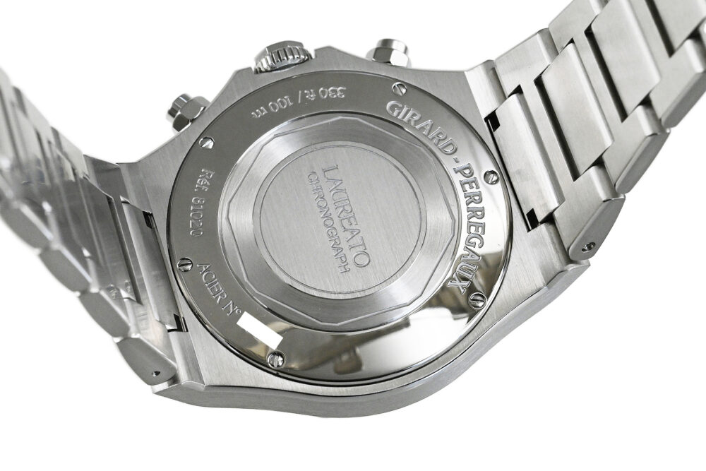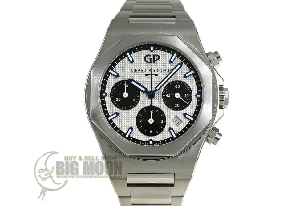 | コメント | 優れた機能性と品質、現在もマニュファクチュール(自社一貫生産)という伝統を貫く老舗ブランド「ジラール・ペルゴ」。スポーティ&エレガンス、8角形のベゼルが特徴的な「ロレアート」、ケースサイズ42mm自動巻クロノグラフモデルです。46時間パワーリザーブの自社製キャリバーGP03300を搭載、「クル・ド・パリ」仕上げを施したダイアルが印象的です。僅かな軽い擦りキズはありますが目立つ様なキズはありません。国内正規店にて購入品です。 |