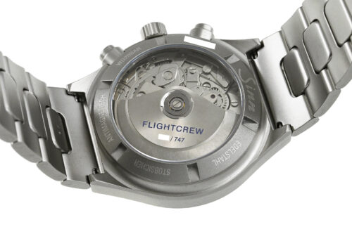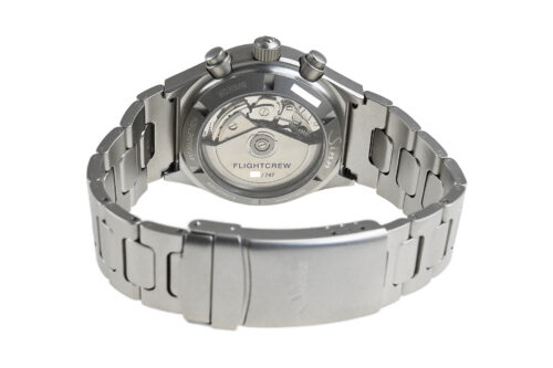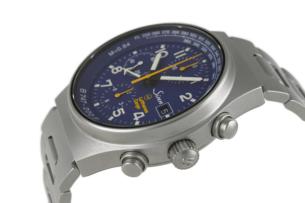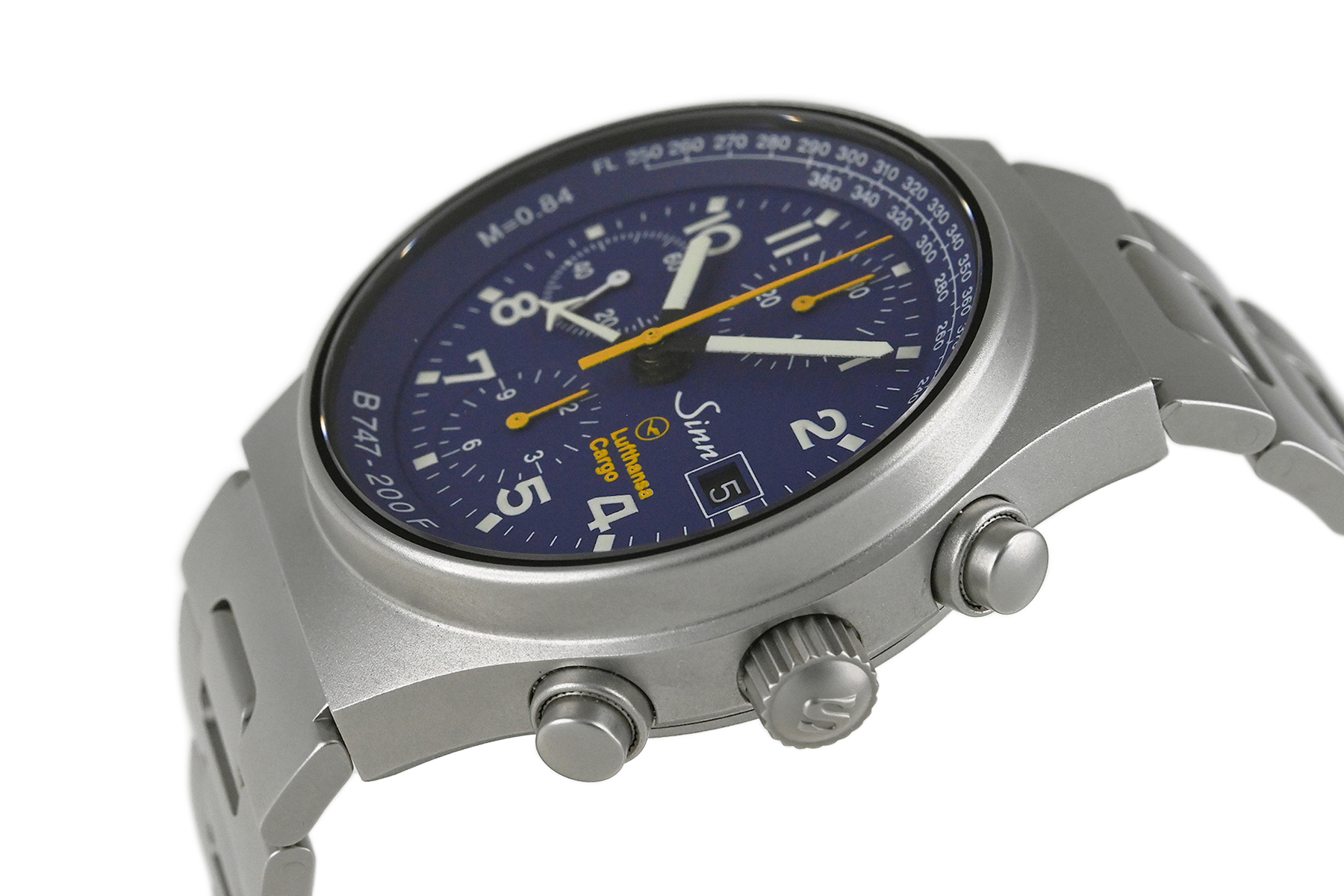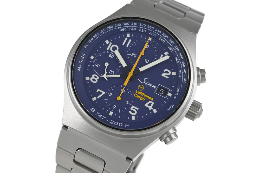 ルフトハンザ・カーゴ世界747本限定モデルです。ルフトハンザコーポレイトカラーのブルーに、オレンジペイントがアクセントとなっています。ボーイング747をイメージした飛行機型GMT針、ダイヤル外周部のスケールはエアカーゴの運航に重要な貨物積載総重量に対する飛行高度の対比表を装備しています。僅かな軽い擦りキズはありますが目立つ様なキズはありません。国内正規店にて購入品、2026年1月に正規修理サービスにてオーバーホールをしています。 |