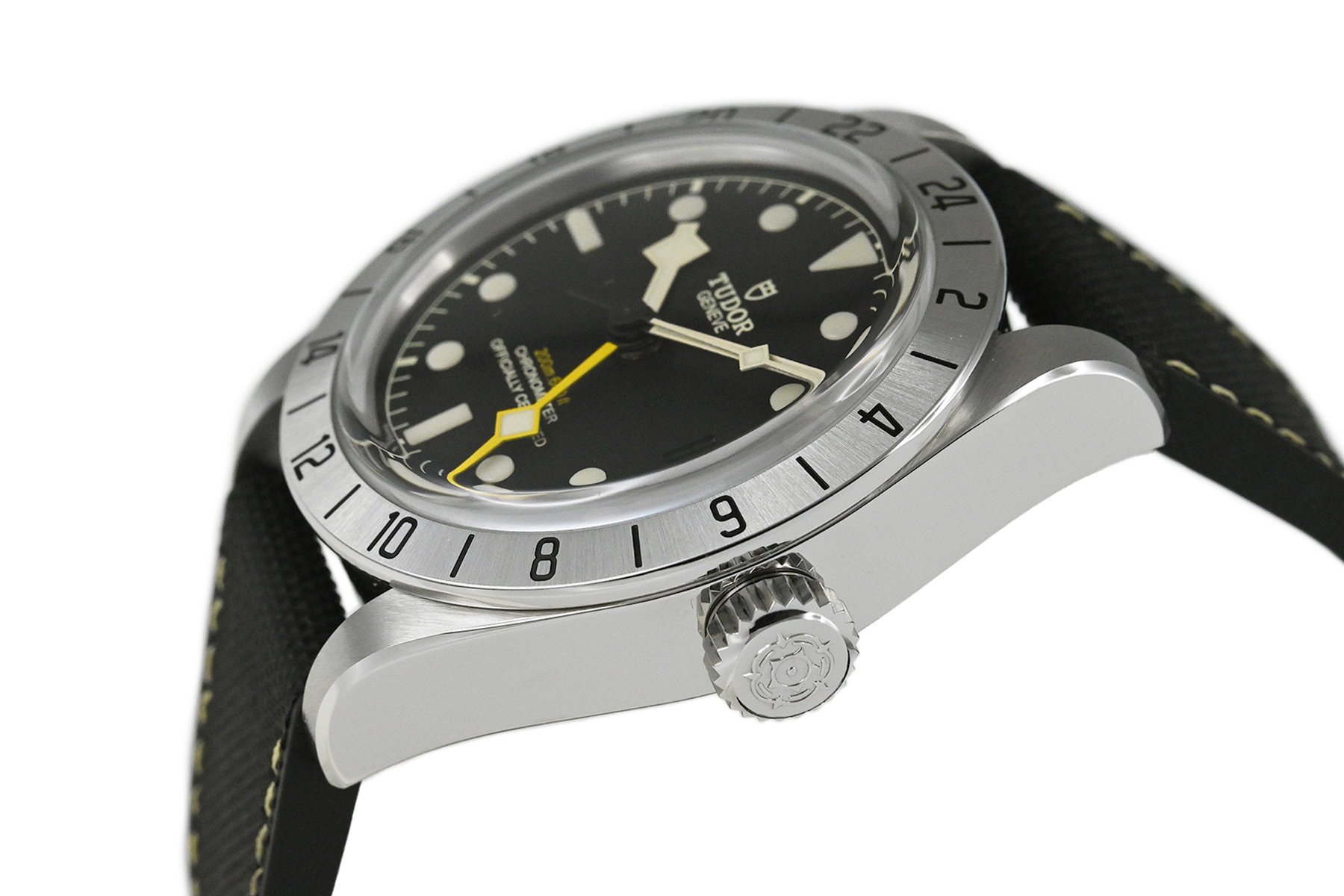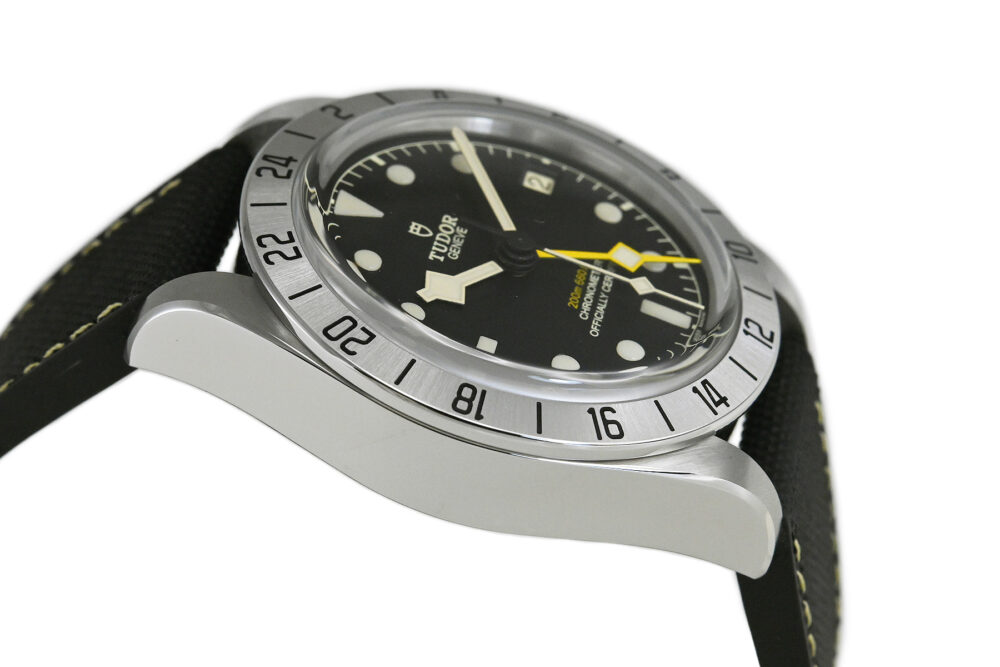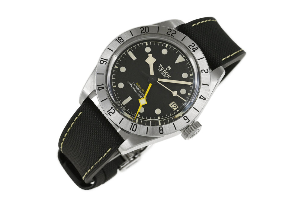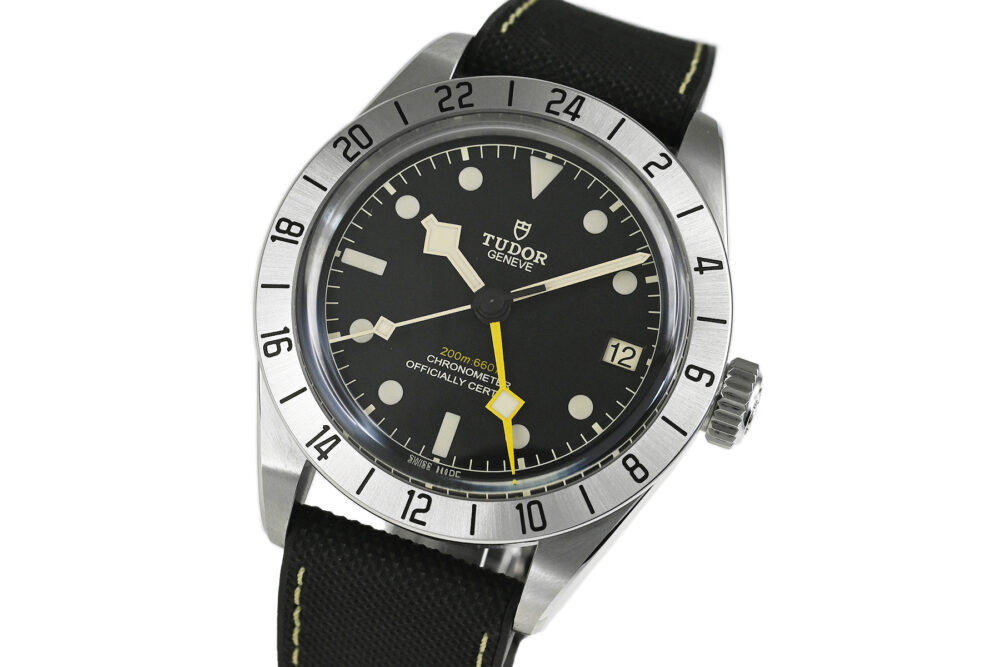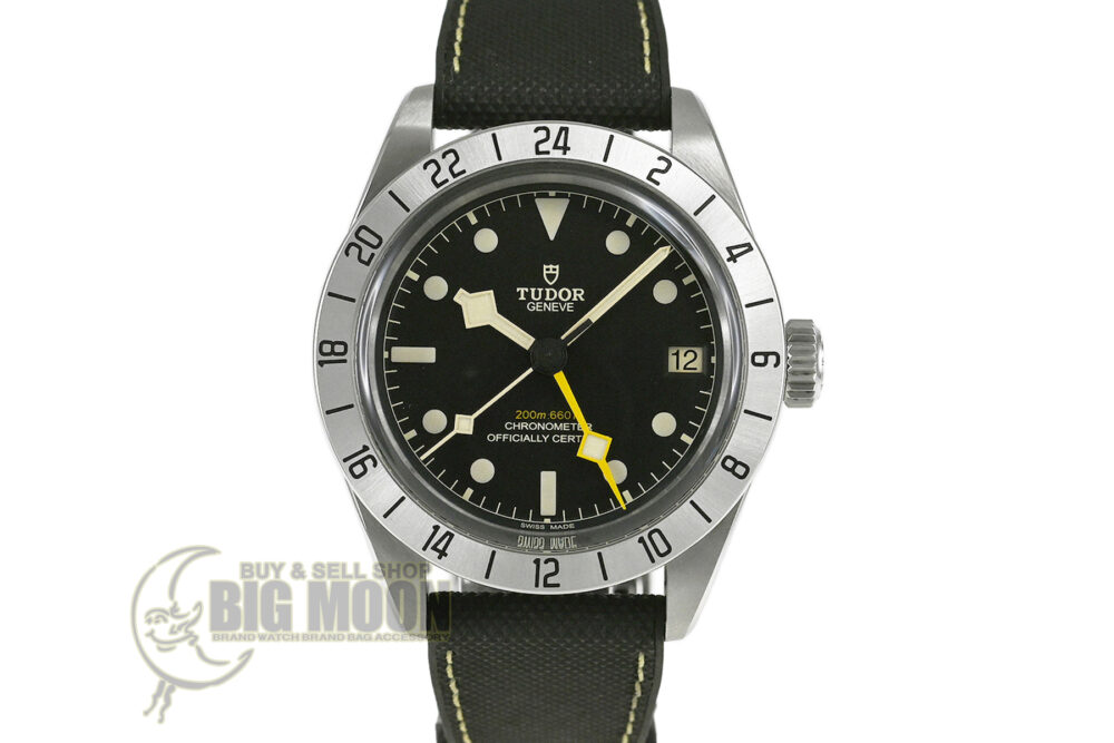 | コメント | ロレックスの兄弟ブランド「チューダー」。GMT機能を搭載した「ブラックベイ プロ」自動巻モデルです。イカ針などヴィンテージテイストなデザインが魅力的、ラバーとファブリックによるハイブリッドストラップ採用です。マニュファクチュール キャリバーMT5652を搭載。ラグ裏側(4カ所)とラグおもて側5時方向に少々の小キズはありますがその他目立つ様なキズはありません。 |