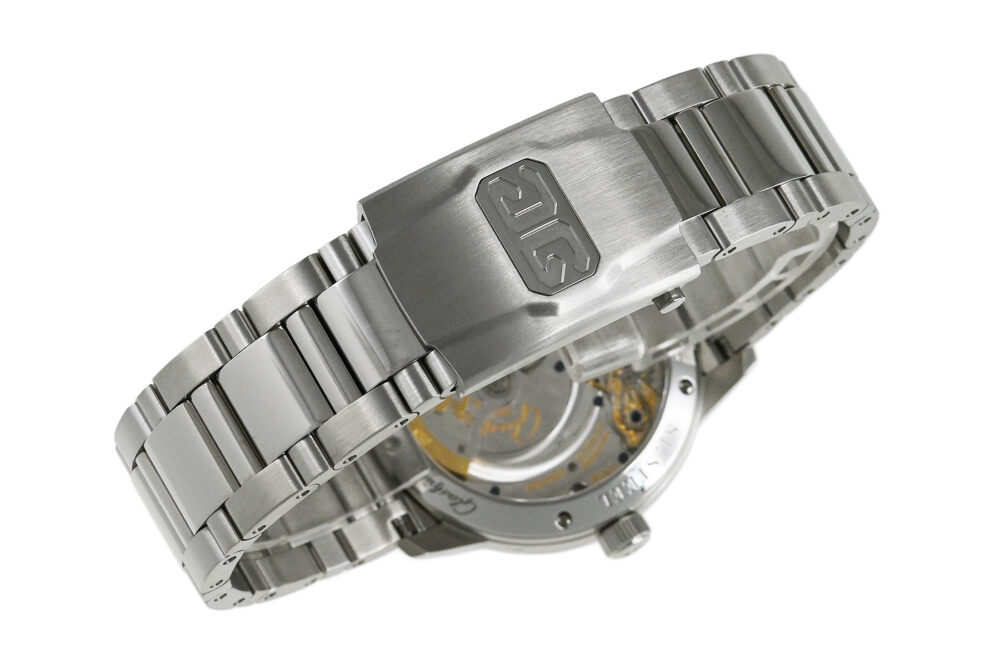 | コメント | ムーブメントから自社一貫生産しているドイツのマニュファクチュールブランド「グラスヒュッテ・オリジナル」。オフセンターに配された時・分・スモールセコンドに、ビッグデイト表示、ムーンフェイズが絶妙なバランスのダイアルデザインが特徴的な「パノマティックルナ」、自動巻モデルです。キレイなディープブルーダイアルが魅力的です。自社製ムーブメントキャリバー90-02を搭載、裏蓋シースルーバックとなっており、独自のダブルスワンネック緩急微調整装置や伝統的な装飾仕上などを眺めることが出来ます。少々の軽い擦りキズはありますが目立つ様なキズはありません。国内正規店にて購入品です。 |