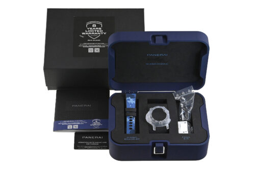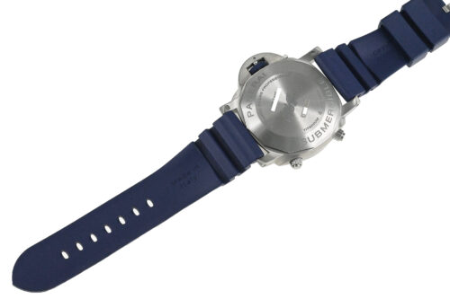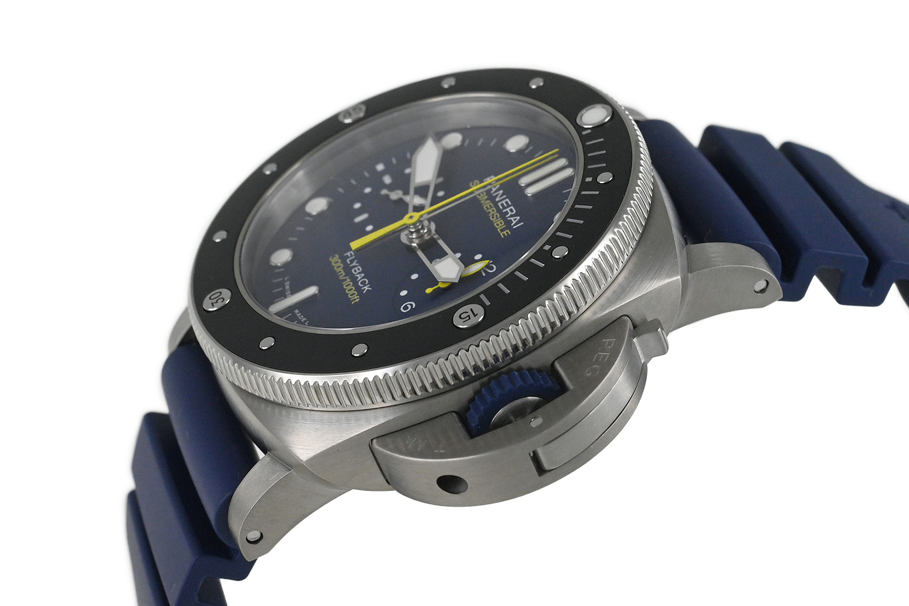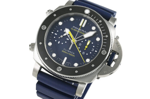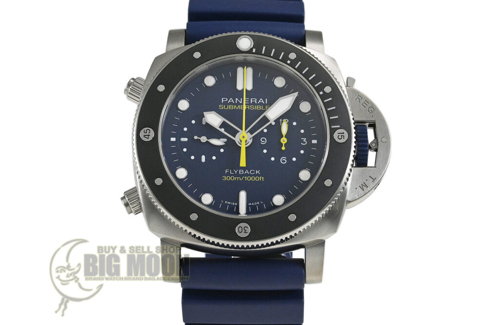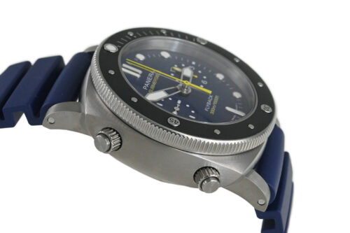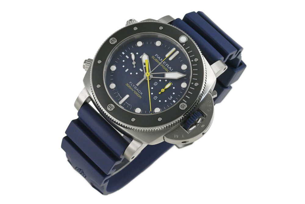 | コメント | 逆回転防止機能付きベゼルを備えた無骨なデザインが魅力の「サブマーシブル」。1956年にエジプト海軍特殊潜水部隊用に開発された「エジツィアーノ」からインスピレーション得て誕生しました。20年以上パネライのアンバサダーを務めているプロの探検家マイク・ホーンモデルで、ブルー×イエローのカラーリングが特徴的です。裏蓋にはマイク・ホーン氏のサインが刻印されています。フライバック機能を備えた自社製キャリバー「P.9100」を搭載。9時側ケースサイドや裏蓋に使用に伴う若干の擦りキズはありますが、目立つ様な深いキズはありません。 |