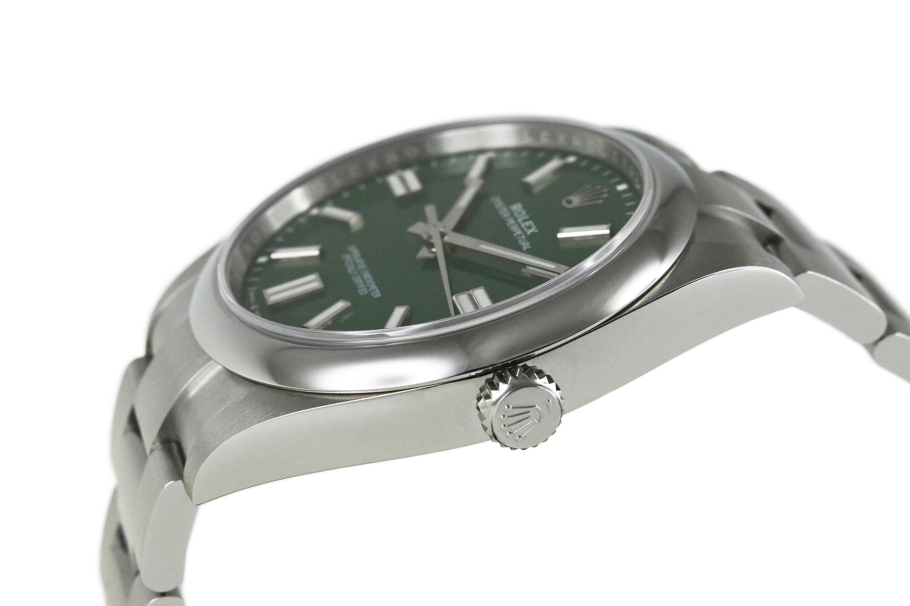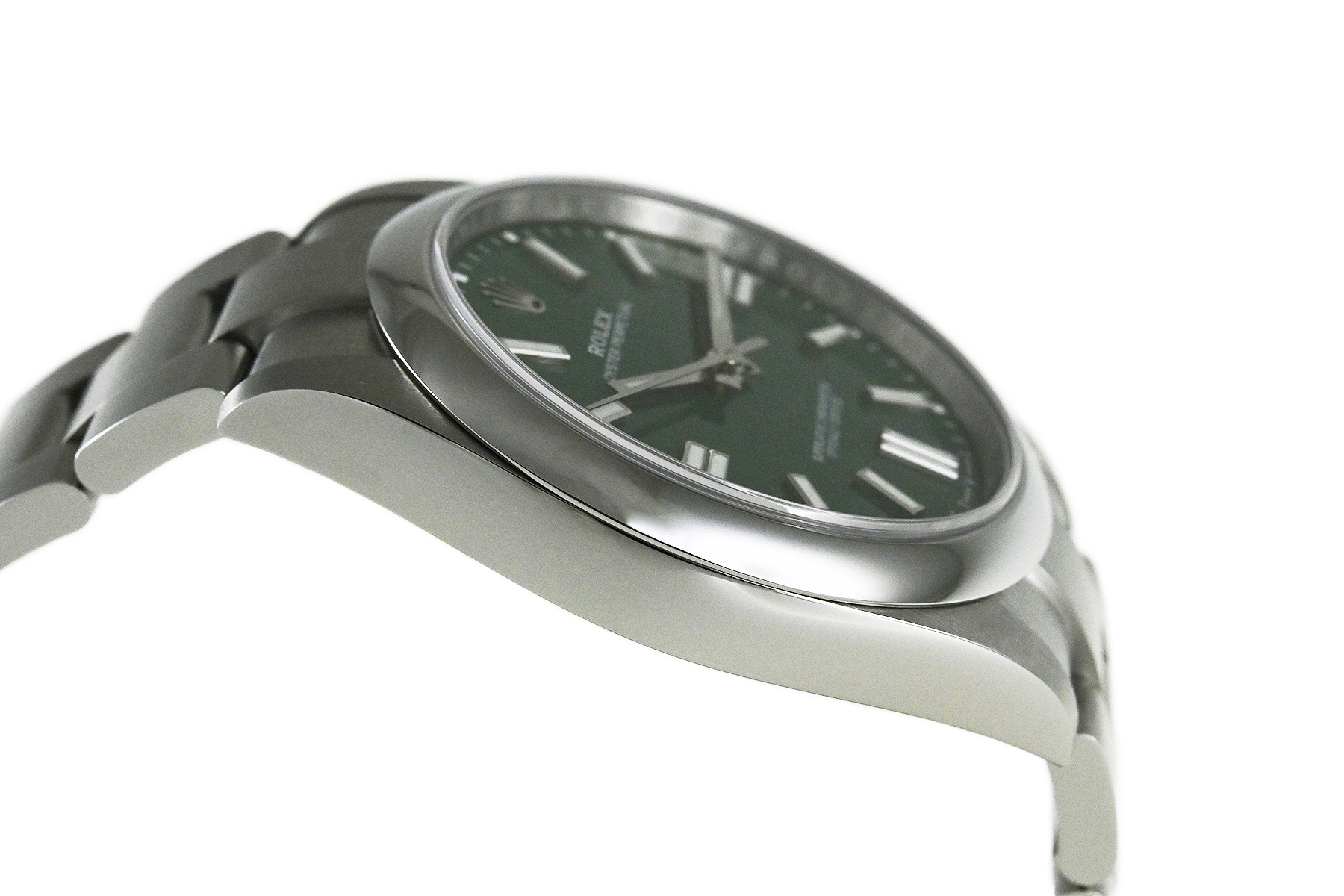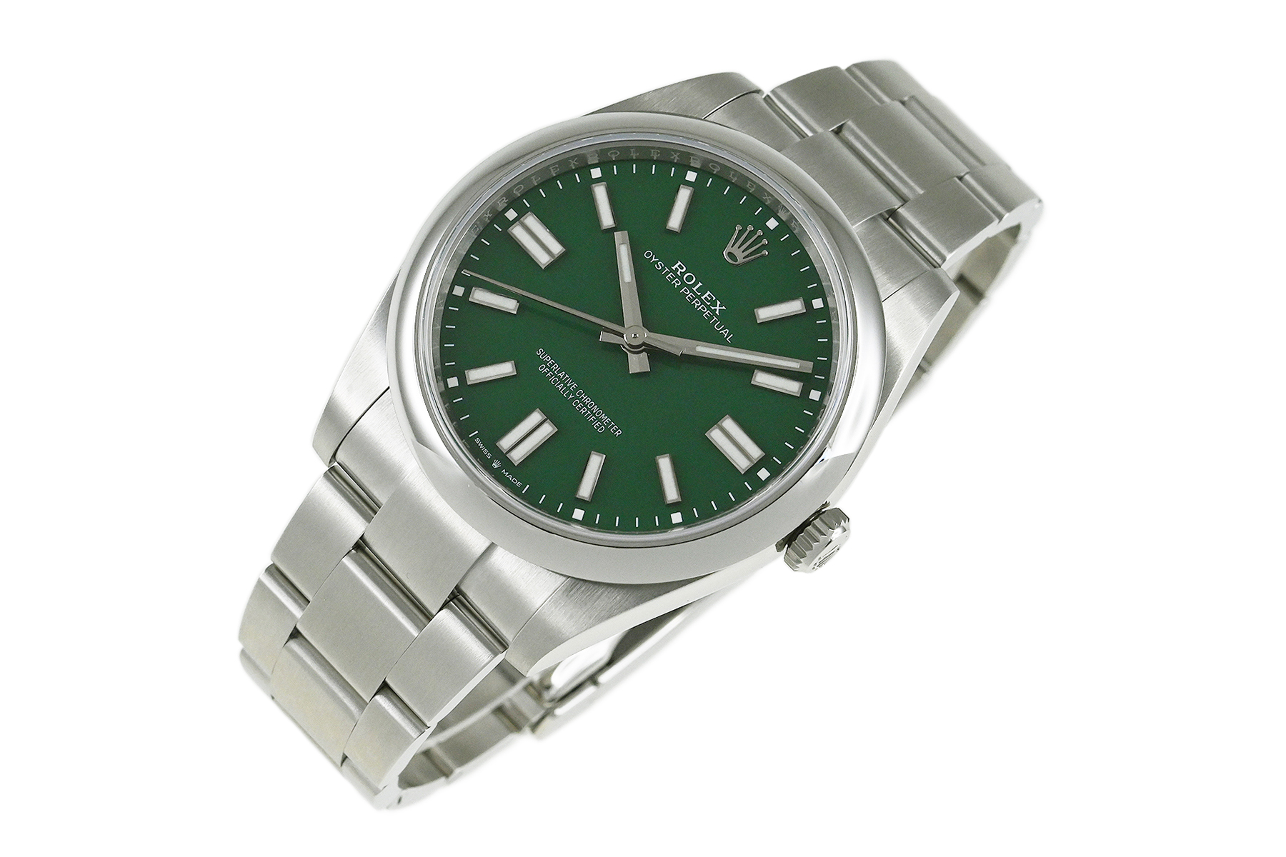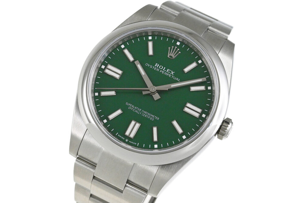 | コメント | カレンダーのない視認性の良いシンプルなモデル「オイスターパーペチュアル」、ケース径41mmのメンズサイズモデルです。グリーンラッカーダイアルが印象的です。ロレックス完全自社製造の高精度ムーブメント キャリバー3230を搭載しています。僅かな軽い擦れはありますが目立つ様なキズはありません。 |