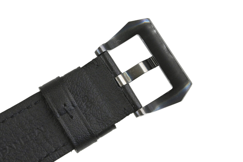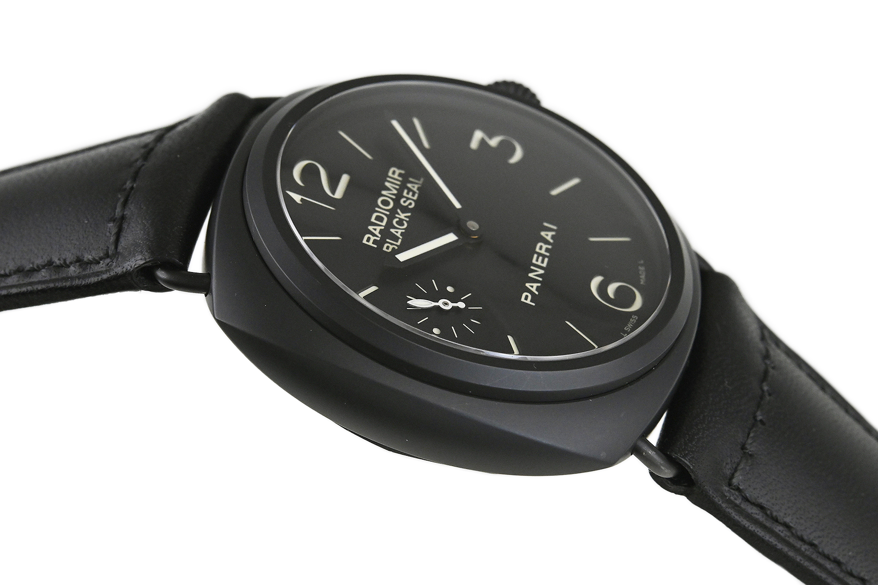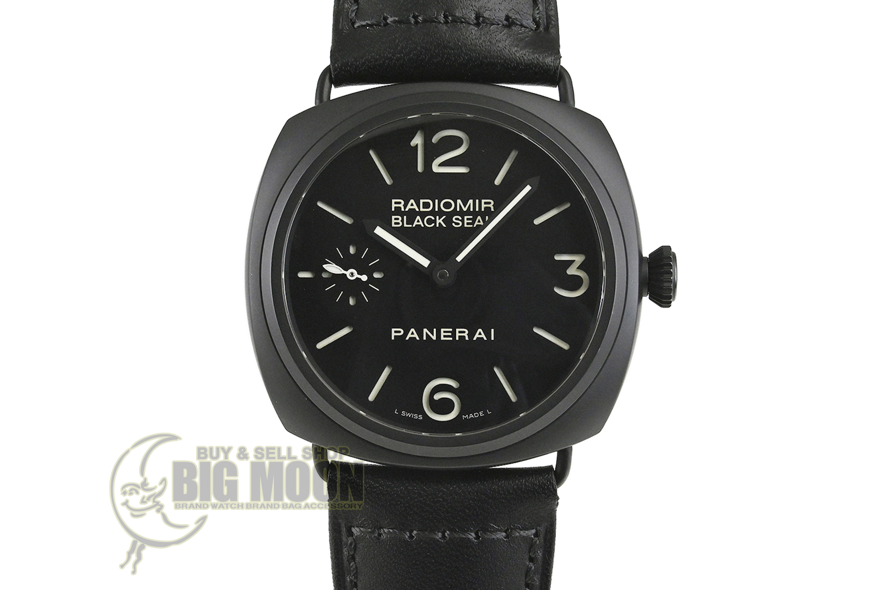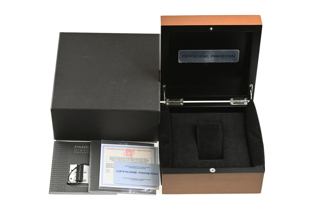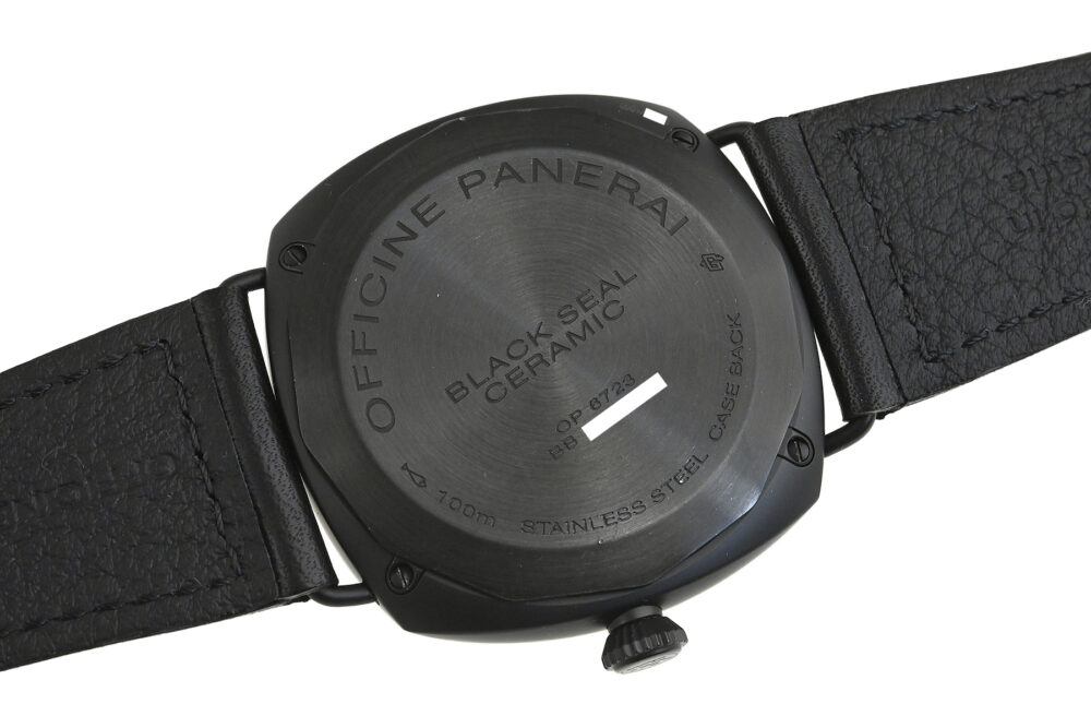 | コメント | クッションケースにワイヤーラグが特徴の人気モデル「ラジオミール」。ケースにマットなセラミック素材を使用、ダイアル12時位置に「RADIOMIE BLACK SEAL」のモデル名が入ったパネライの歴史を象徴するシンプルな45mm手巻モデルです。「ブラックシール」とは、イタリア海軍特殊潜水部隊が「ブラックシール(黒アザラシ)」と呼ばれた低速雷魚艇に乗って活躍したことに由来します。裏蓋に若干の小キズ(エッジ部分に1ヶ所あてキズあり)・擦りキズ、尾錠に小キズ、変色があります。その他は軽い擦れはありますが目立つ様な深いキズはありません。 |