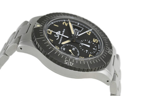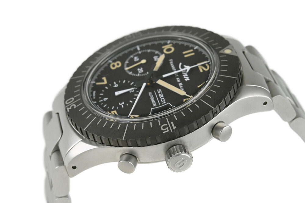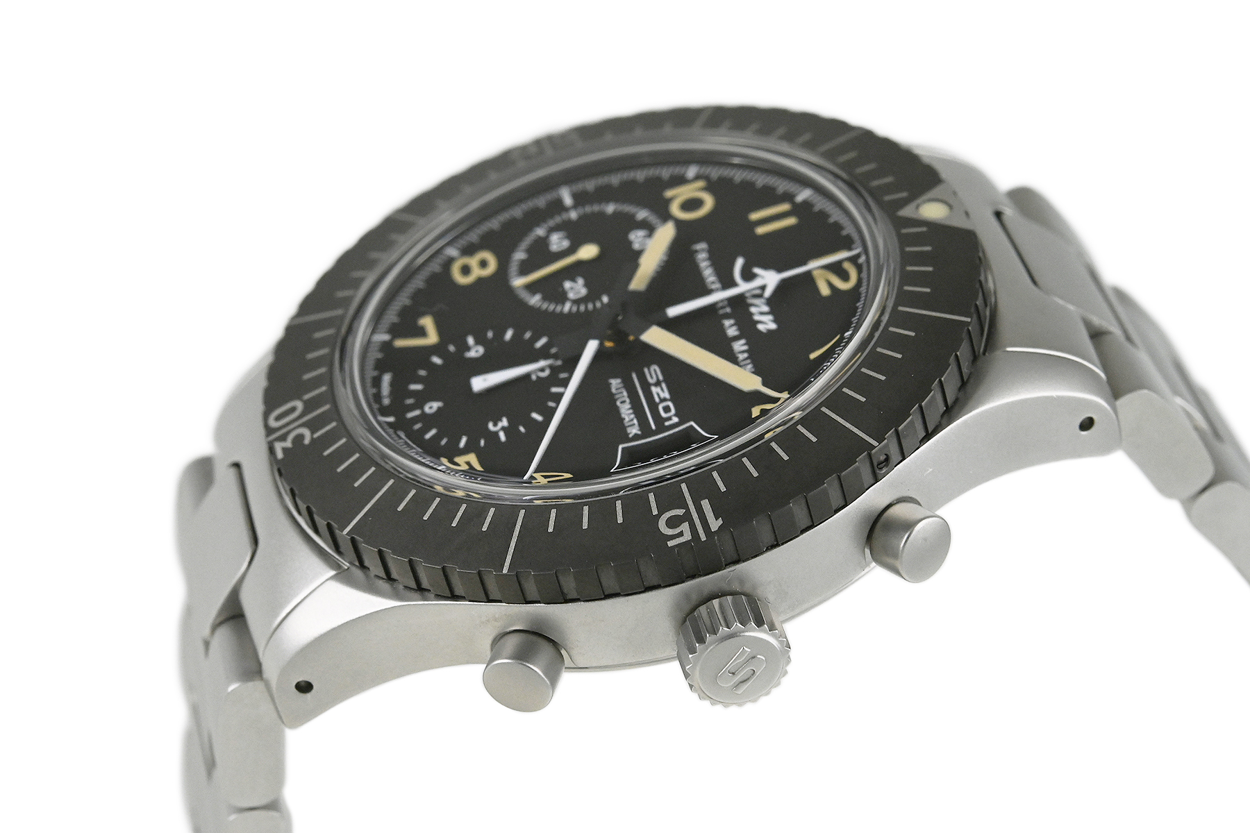 | コメント | ジンのクロノグラフ・ムーブメント Cal.SZ01を搭載したパイロット・クロノグラフ 「156.1.E」世界300本限定モデルです。耐傷性の高いテギメント加工を施したアンスラサイトカラーのベゼルやアイボリー色の夜光塗料を採用するなどヴィンテージテイストなデザインが特徴的です。少々の軽い擦りキズはありますが目立つ様な深いキズはありません。 |