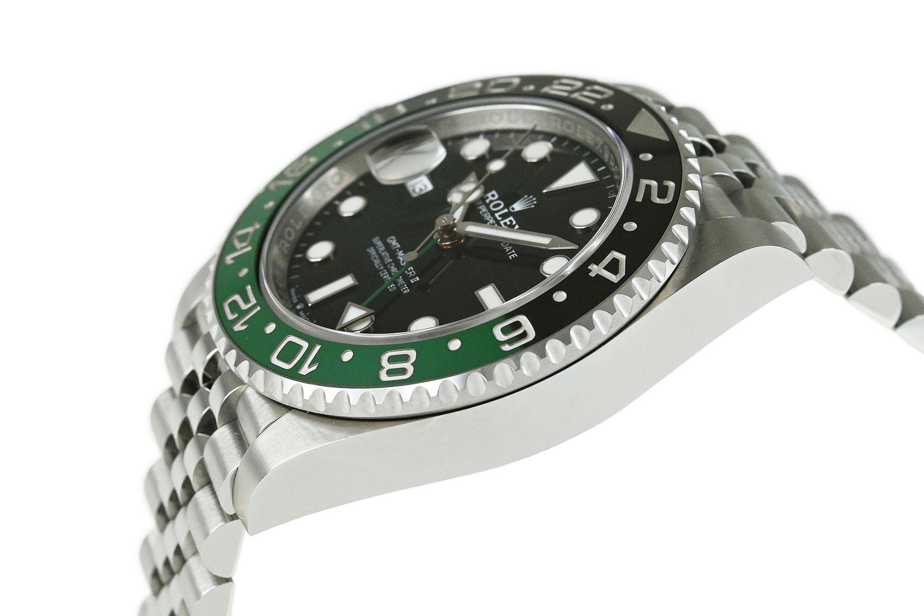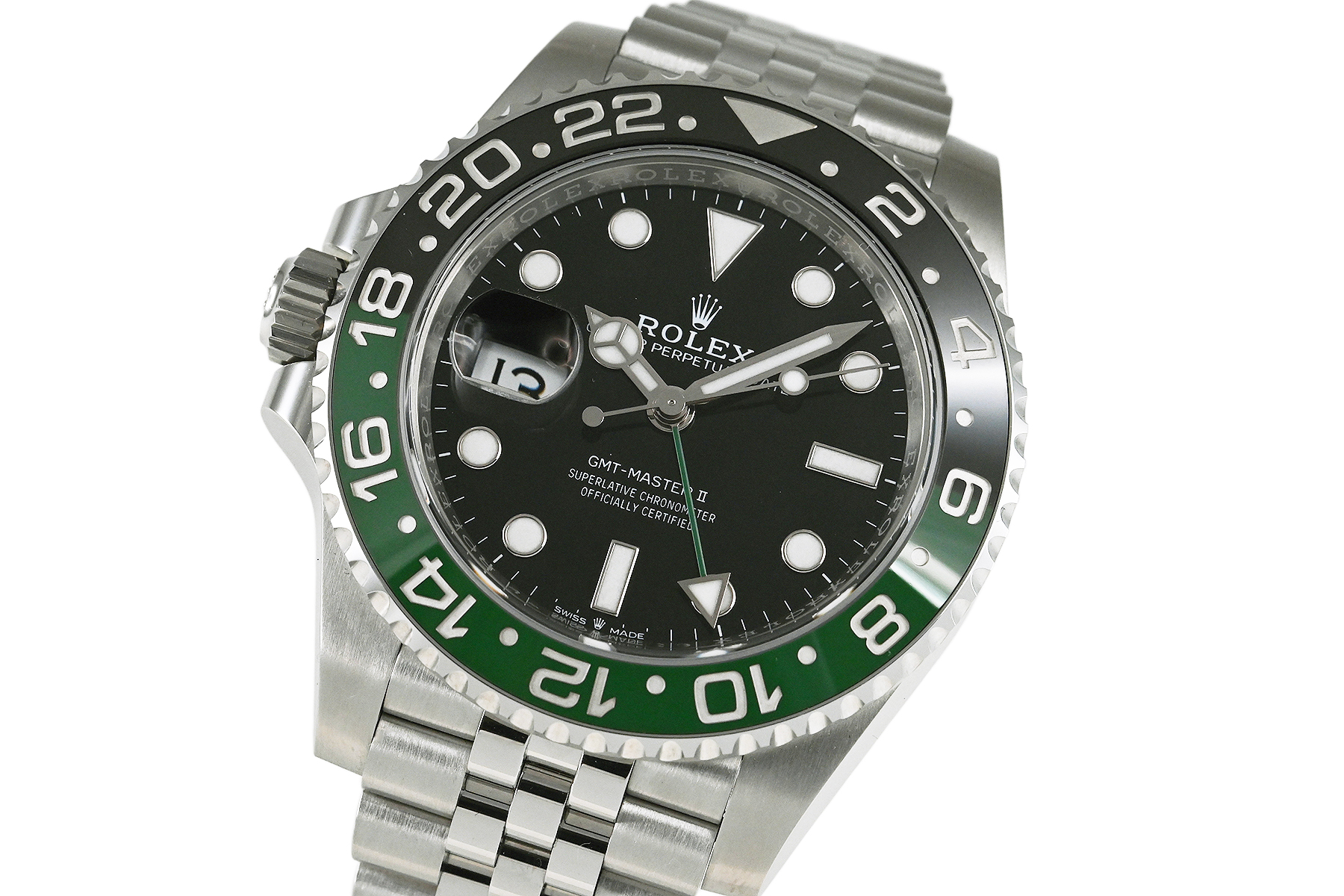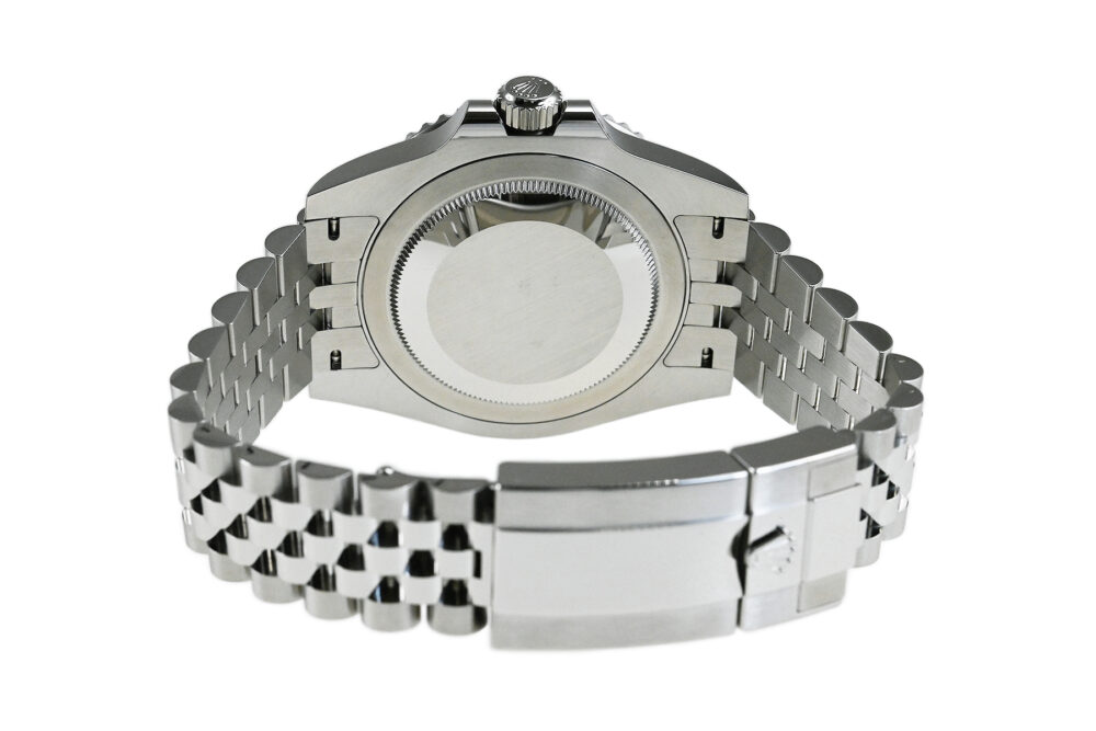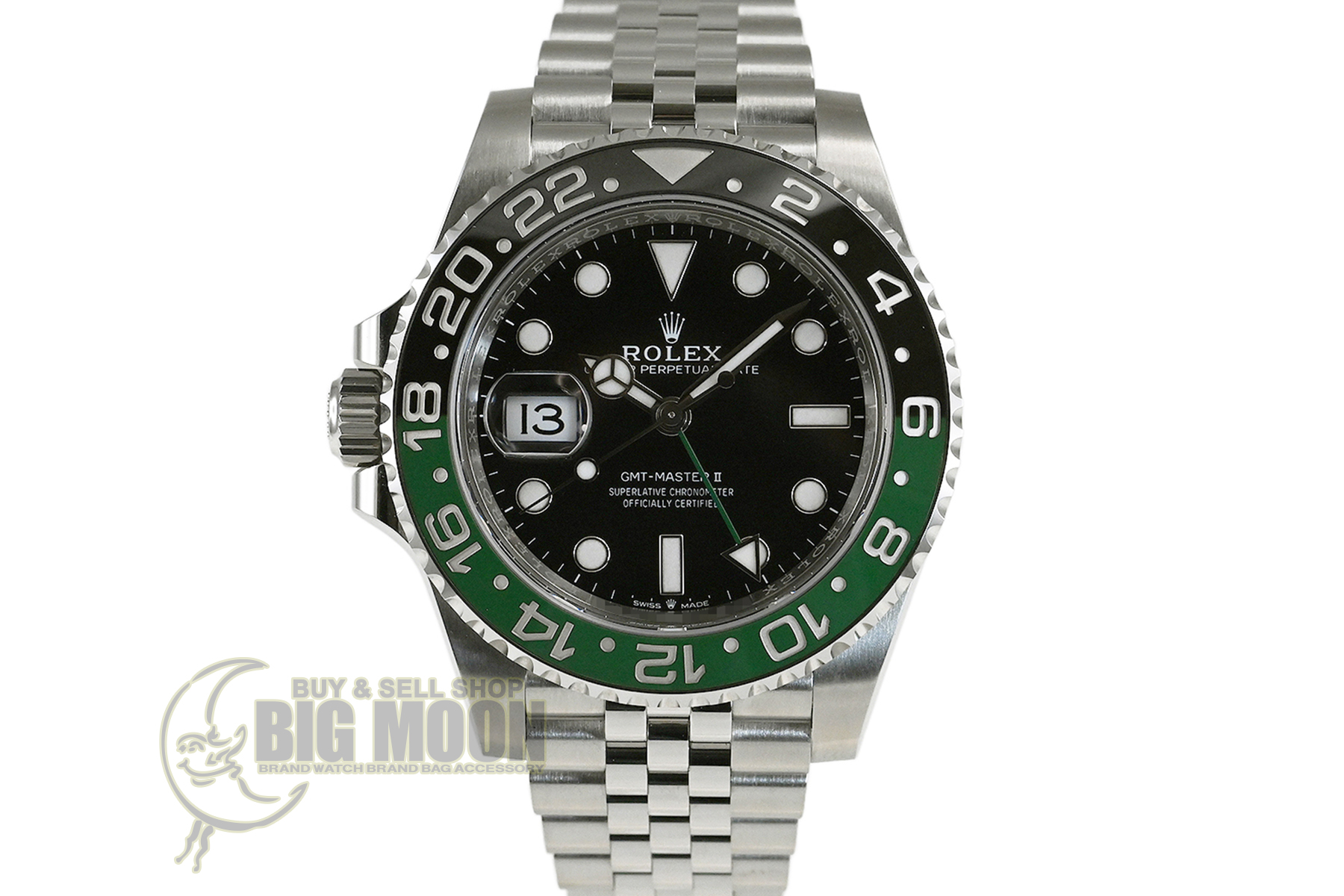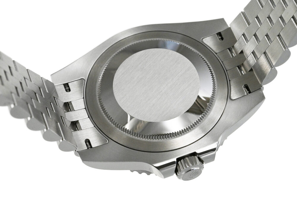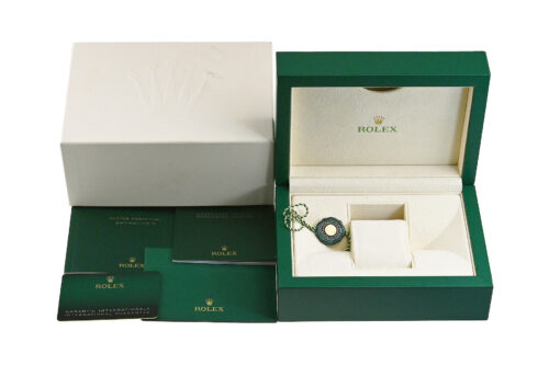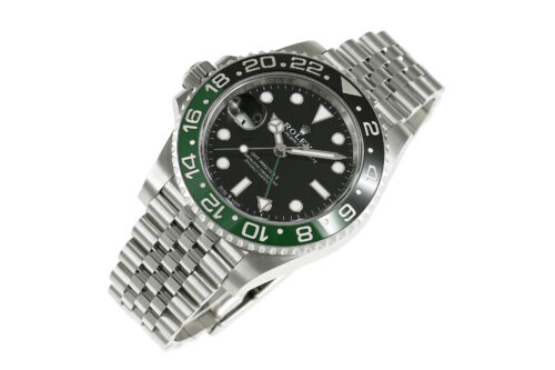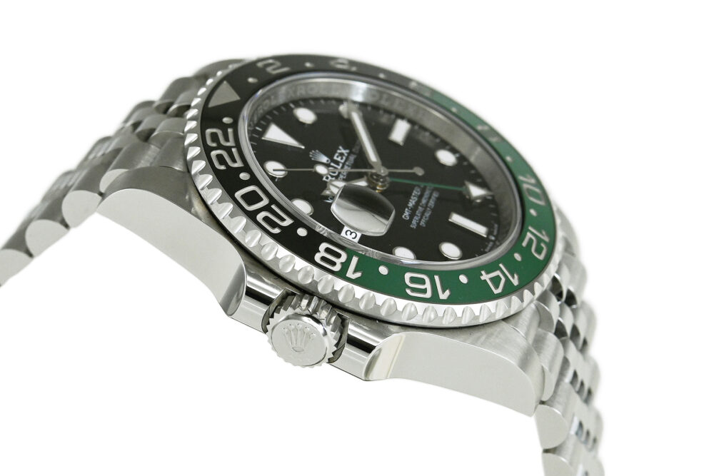 コメント 1955年に誕生した「GMTマスター」。進化したGMTマスターIIは回転ベゼルにより3箇所の時刻を知る事が出来ます。2022年に登場した、ブラック/グリーンカラーのセラミック製ベゼルを備える左側リューズのレフティモデル「Ref.126720VTNR」です。エレガントなジュビリーブレスレット仕様、約70時間のパワーリザーブを備えたロレックスキャリバー3285を搭載しています。裏蓋など極薄っすらとした軽い擦りキズはありますが目立つ様な深いキズはありません。