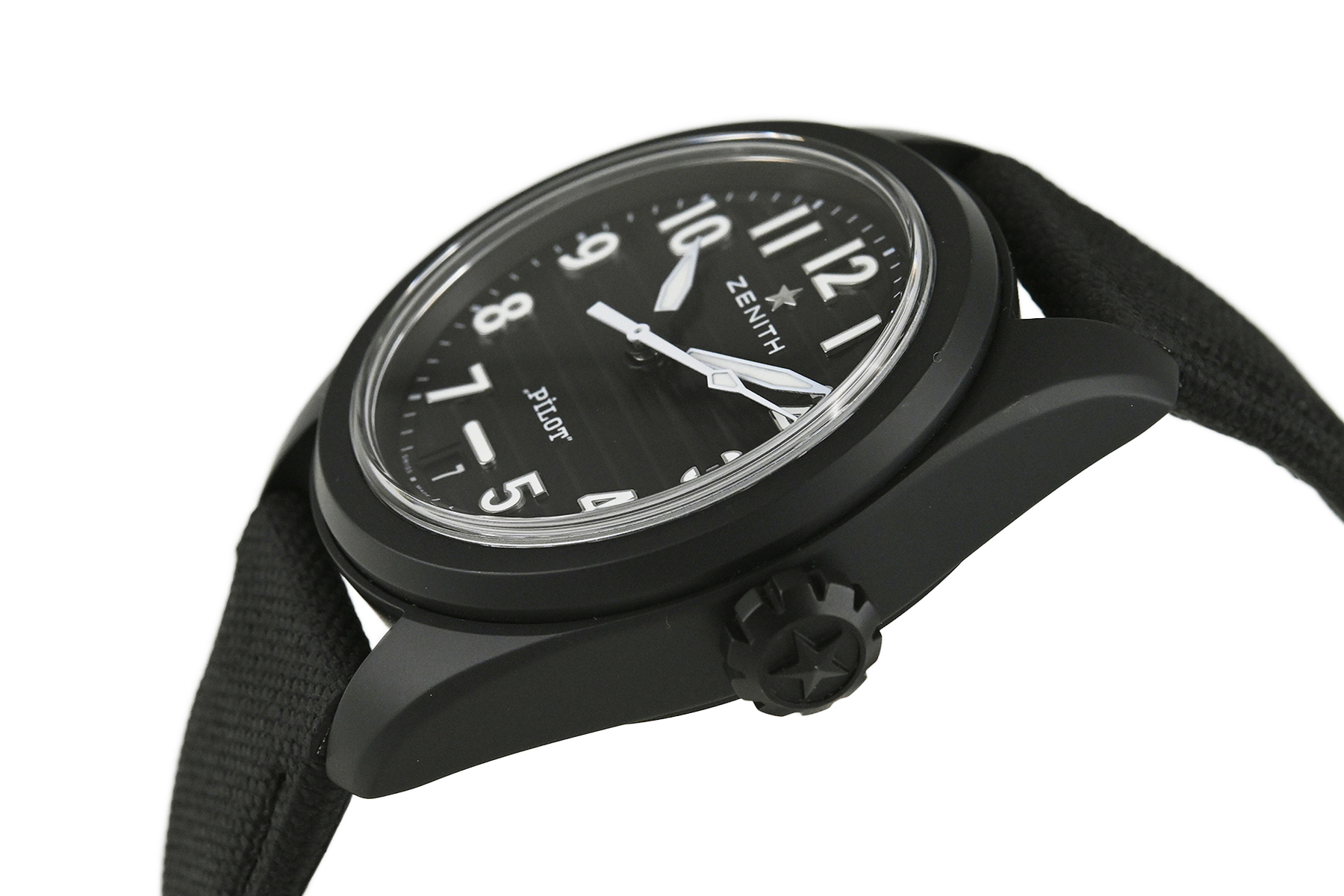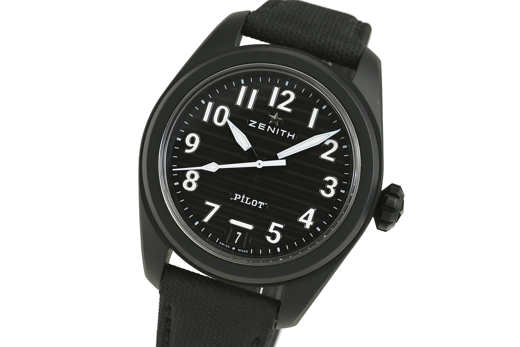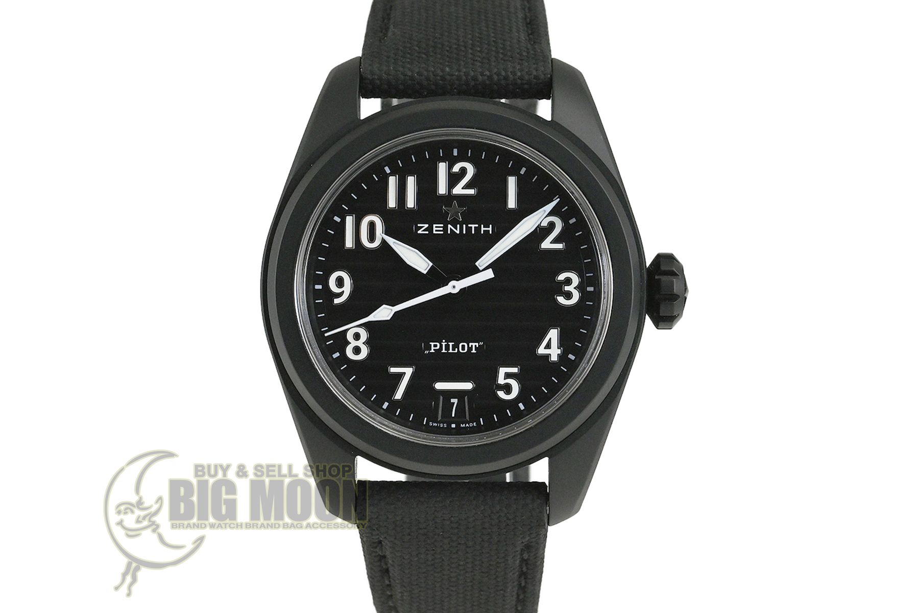 コメント 1865年創業のスイス老舗時計ブランド「ゼニス」。ゼニスを象徴するパイロットコレクションの新世代モデルです。マットブラックセラミック製ケースに視認性の良い波型のブラックダイアルが特徴的、ゼニス マニュファクチュール製高振動自動巻ムーブメント エル・プリメロ 3620を搭載しています。僅かな軽い擦れはありますが目立つ様なキズはありません。付属の革ベルトは若干の使用感(Dバックル留め痕、軽い汚れ)はあります。
