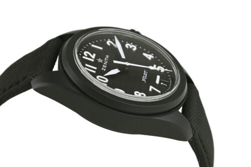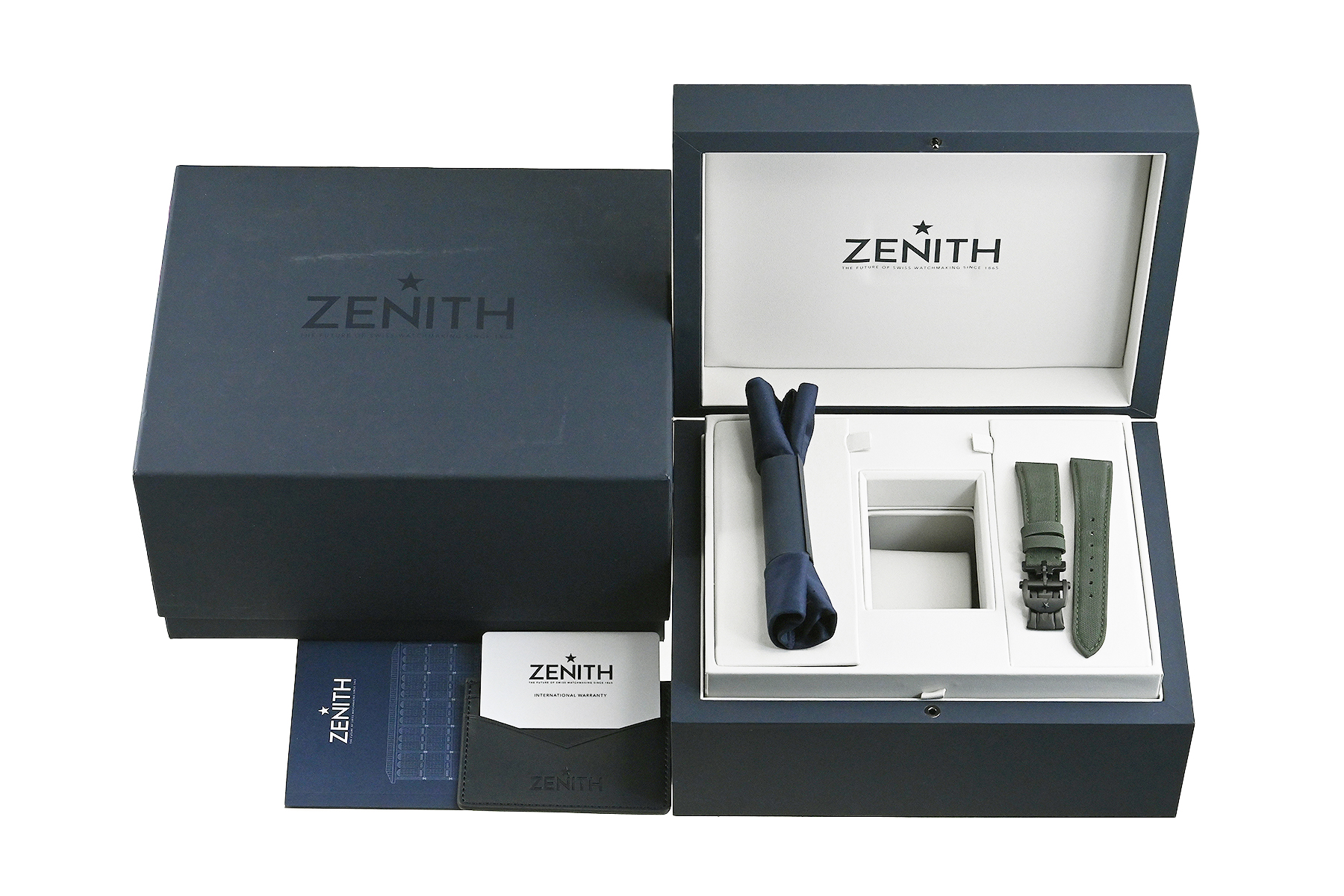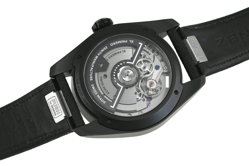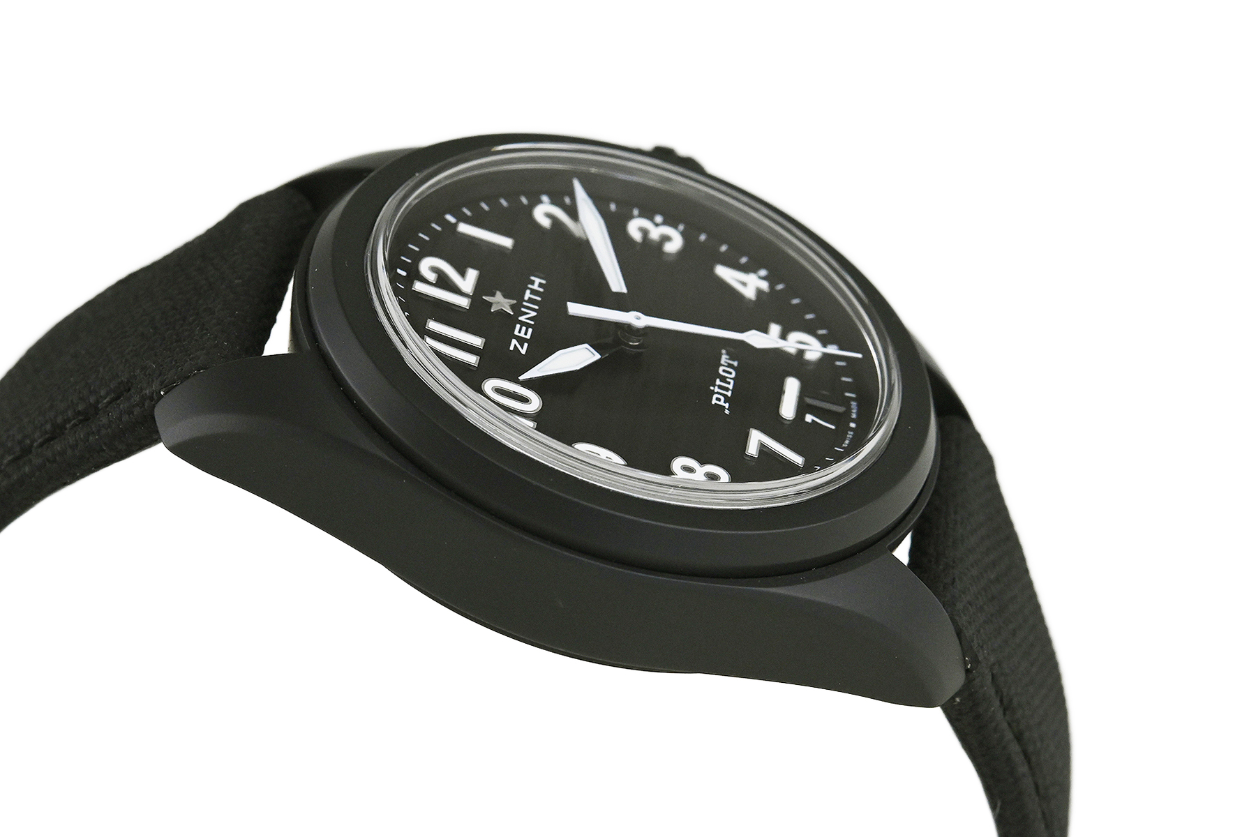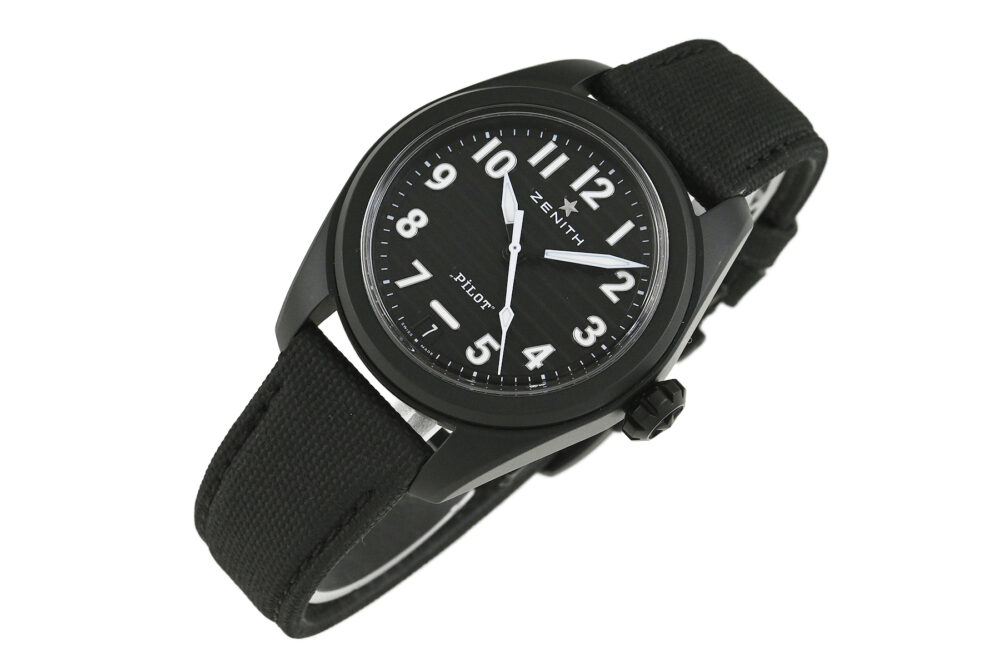 コメント 1865年創業のスイス老舗時計ブランド「ゼニス」。ゼニスを象徴するパイロットコレクションの新世代モデルです。マットブラックセラミック製ケースに視認性の良い波型のブラックダイアルが特徴的、ゼニス マニュファクチュール製高振動自動巻ムーブメント エル・プリメロ 3620を搭載しています。僅かな軽い擦れはありますが目立つ様なキズはありません。付属の革ベルトは若干の使用感(Dバックル留め痕、軽い汚れ)はあります。