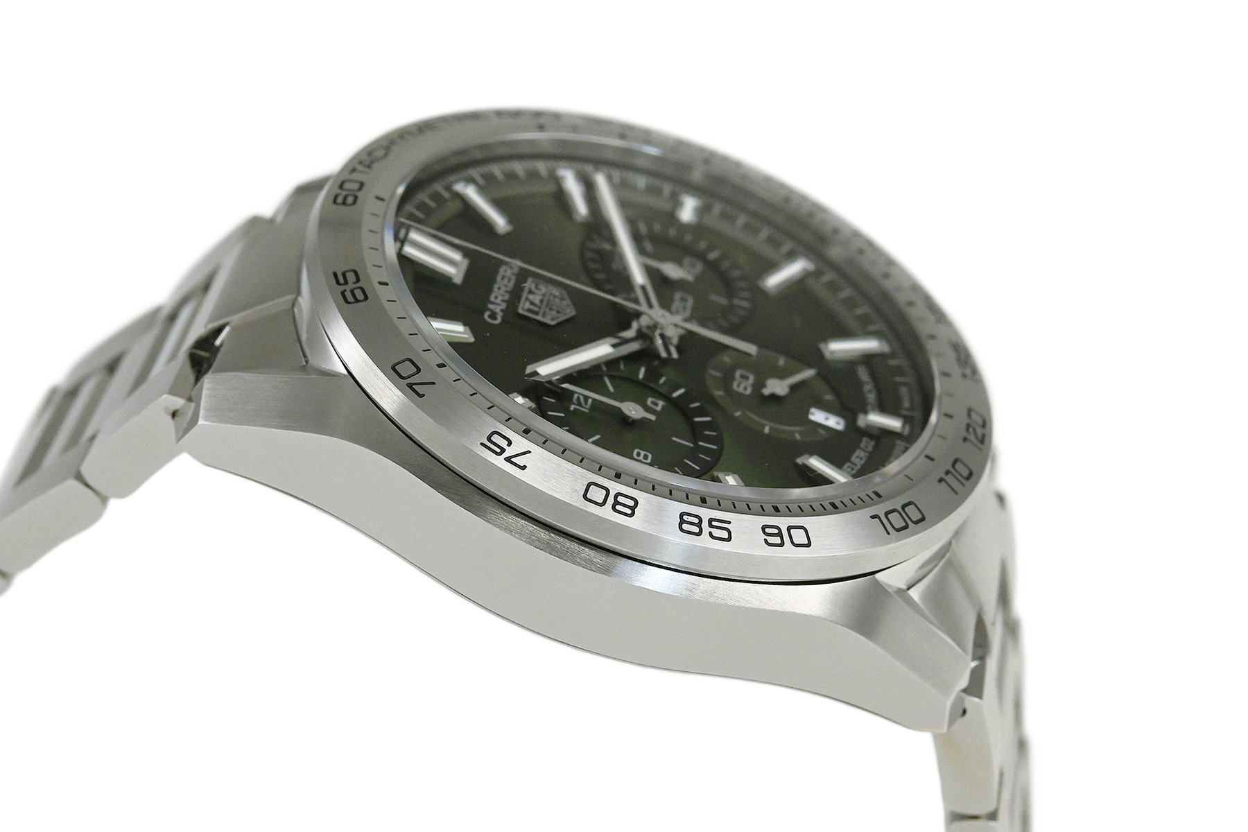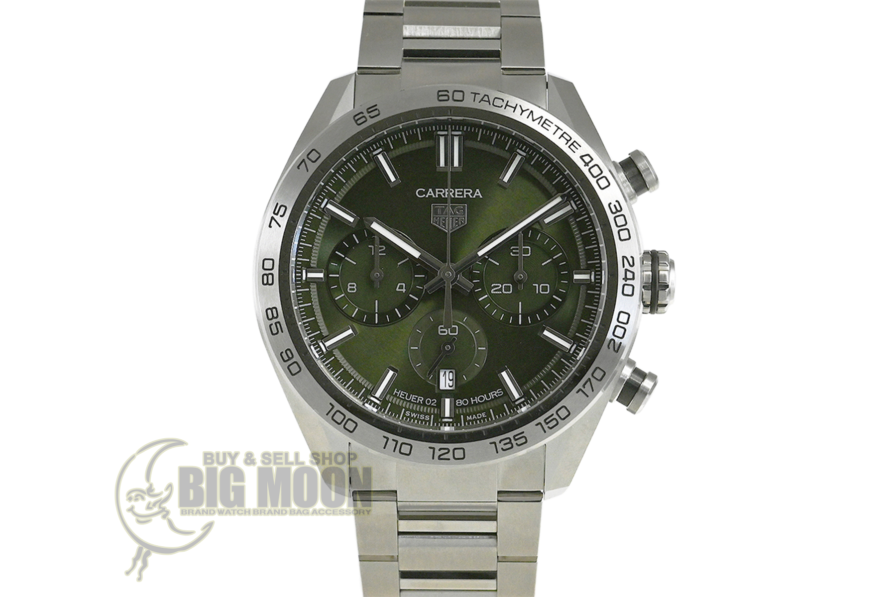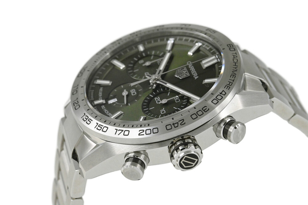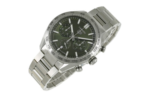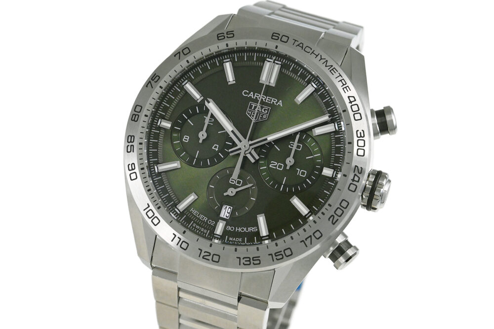 | コメント | モーターレースからインスピレーションを得たクラシックながら現代的なスポーツウォッチ「カレラ」シリーズ。タグ・ホイヤー自社製ムーブメント「キャリバー ホイヤー02」搭載、サーキュラーサテン仕上げが施された綺麗なグリーンダイアルが特徴的、スポーティでエレガントなデザインが魅力です。僅かな軽い擦りキズはありますが目立つ様なキズはありません。 |