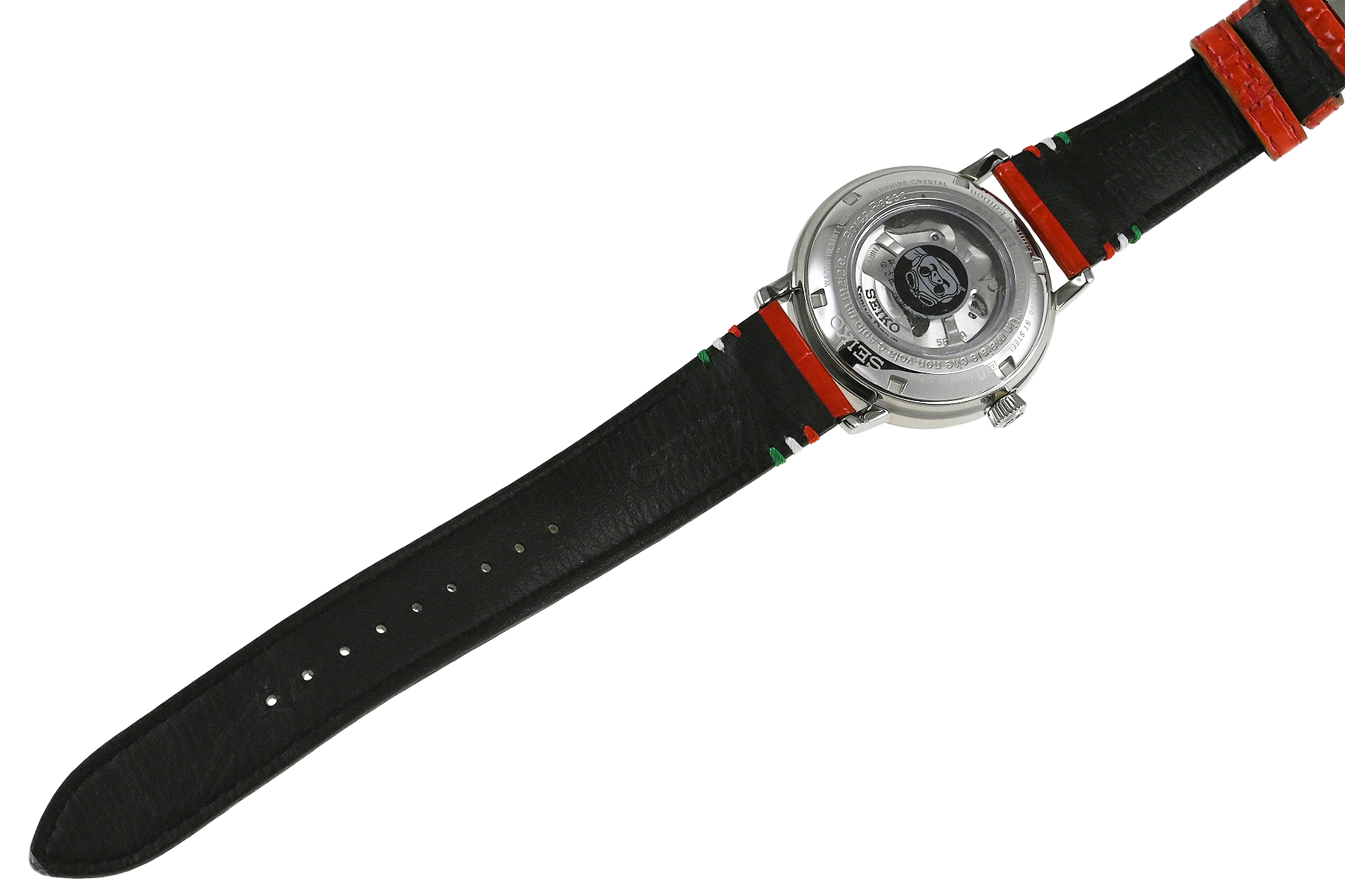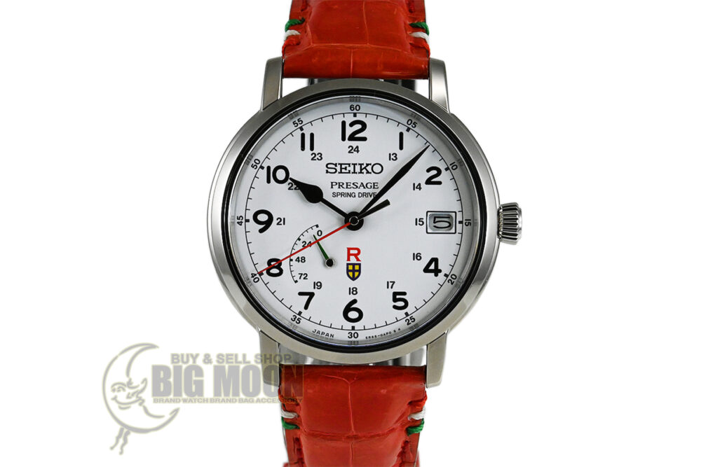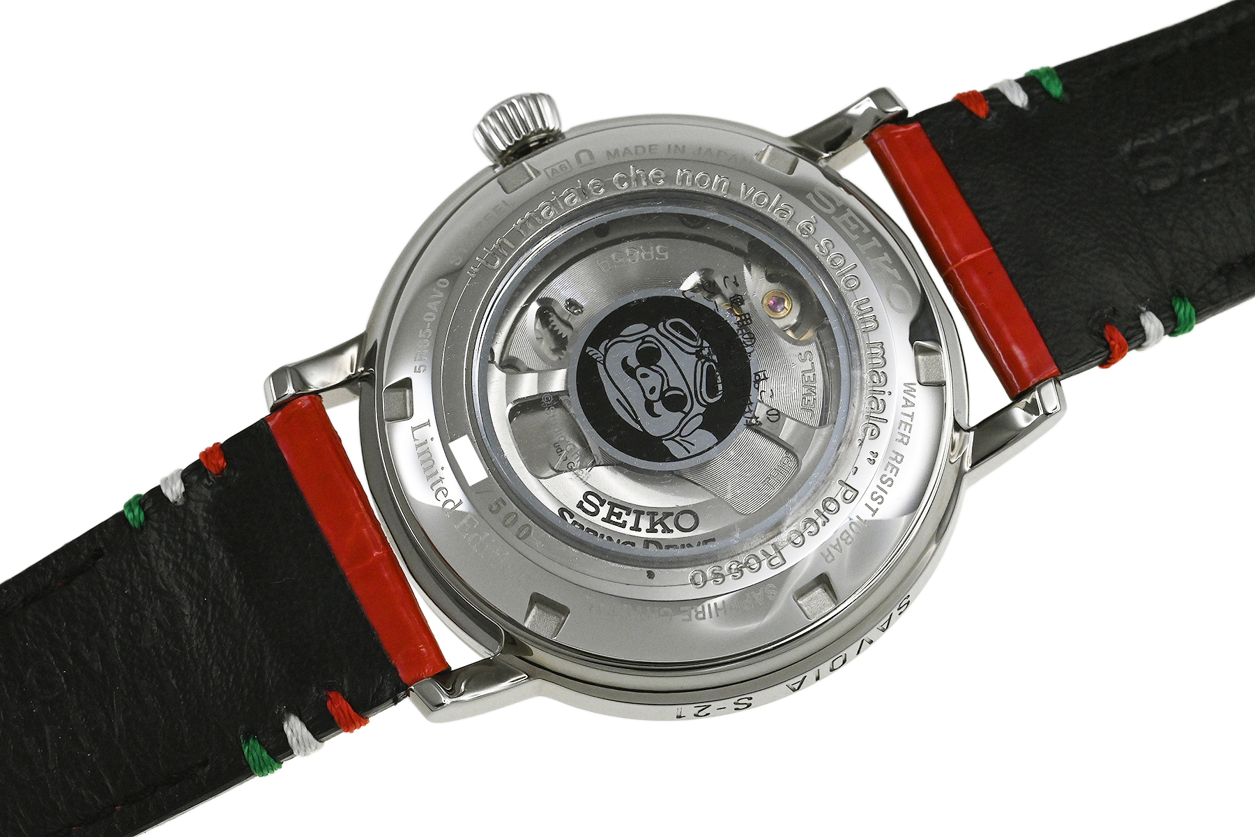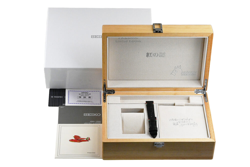 コメント 実用性と機械式の味わいを融合させたセイコードレスメカウォッチシリーズ「プレサージュ」とスタジオジブリ「紅の豚」コラボ限定モデルです。スプリングドライブ5R65搭載モデルで、100年経っても色褪せない「ほうろう」をダイヤルに採用、ポルコの飛行艇「サボイアS-21」をイメージしたデザインとなっており、裏蓋ガラス部分にはポルコが描かれ、映画の名セリフ「飛ばねえ豚はただの豚だ」がイタリア語で記されています。付属品の箱は宮崎駿監督からのメッセージ「時間にしばられずに生きましょう」が表記された特別仕様で、ポルコが刻印されたセーム革が付属しております。若干の軽い小キズ・擦りキズはありますが目立つ様な深いキズはありません。