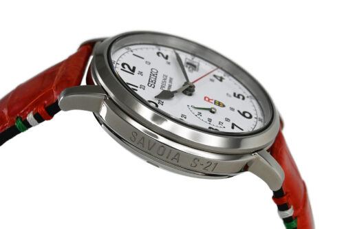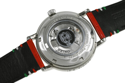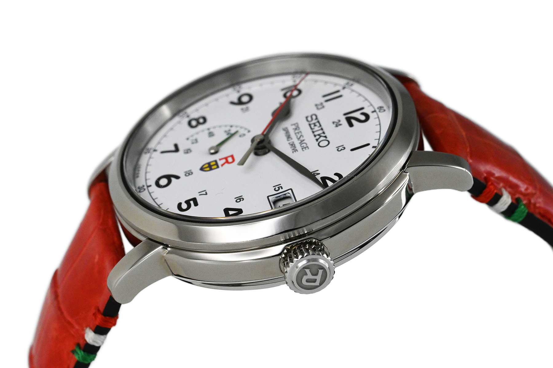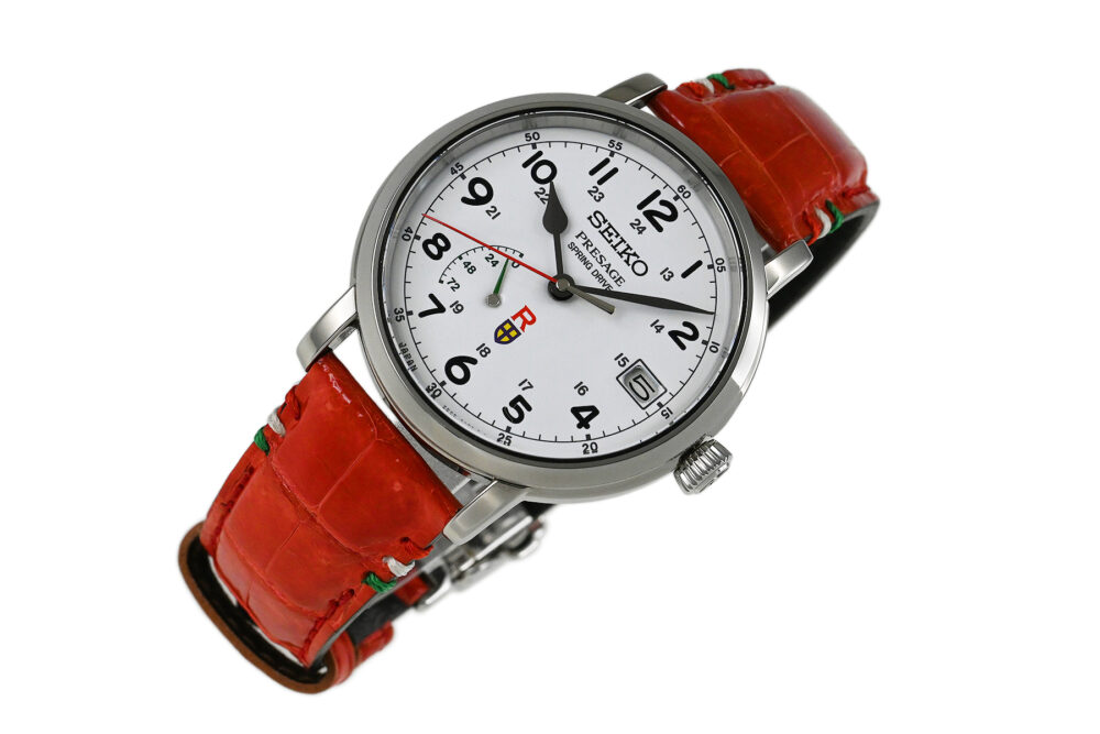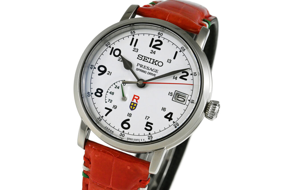 コメント 実用性と機械式の味わいを融合させたセイコードレスメカウォッチシリーズ「プレサージュ」とスタジオジブリ「紅の豚」コラボ限定モデルです。スプリングドライブ5R65搭載モデルで、100年経っても色褪せない「ほうろう」をダイヤルに採用、ポルコの飛行艇「サボイアS-21」をイメージしたデザインとなっており、裏蓋ガラス部分にはポルコが描かれ、映画の名セリフ「飛ばねえ豚はただの豚だ」がイタリア語で記されています。付属品の箱は宮崎駿監督からのメッセージ「時間にしばられずに生きましょう」が表記された特別仕様で、ポルコが刻印されたセーム革が付属しております。若干の軽い小キズ・擦りキズはありますが目立つ様な深いキズはありません。