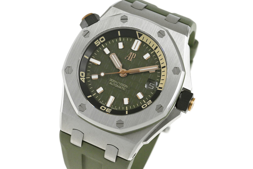| コメント | 1875年にスイスで創業した世界三大高級時計ブランドの一角「オーデマ・ピゲ」。力強いダイナミックなフォルム、ビスが埋め込まれた八角形ベゼルが特徴の「ロイヤル オーク オフショア・ダイバー」自動巻モデルです。「メガタペストリー」模様のダイヤルが印象的です。回転インナーベゼルを装備、自社製自動巻キャリバー4308搭載。僅かな軽い擦れはありますが目立つ様なキズはありません。 |