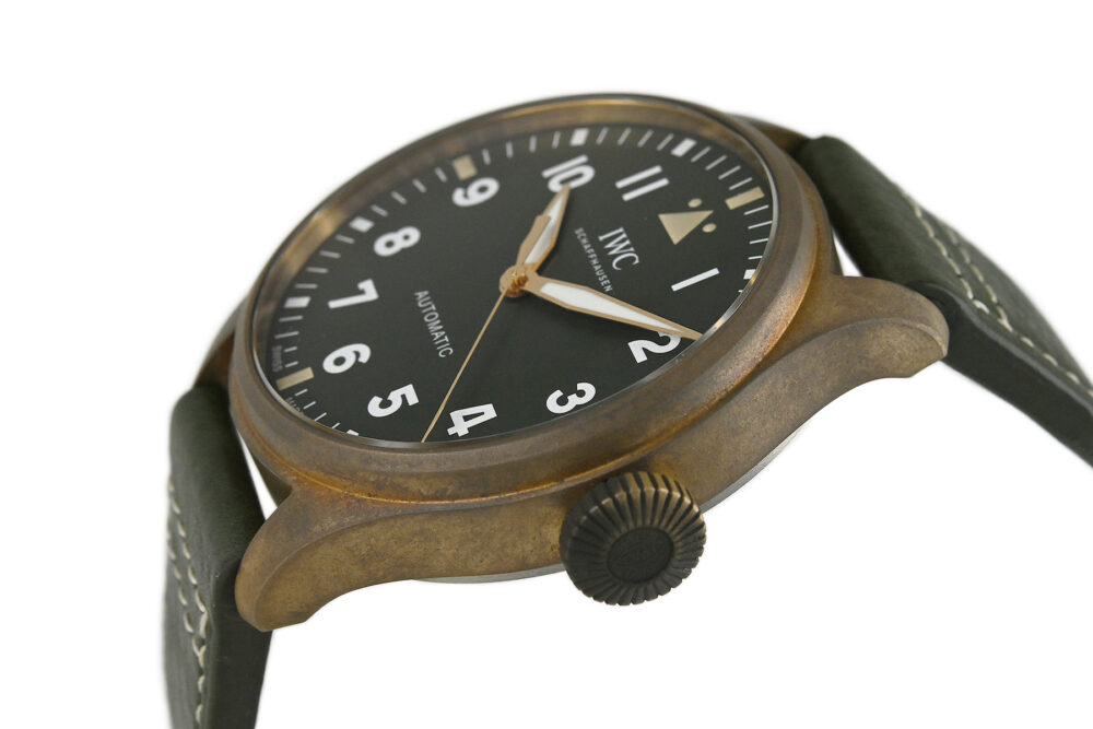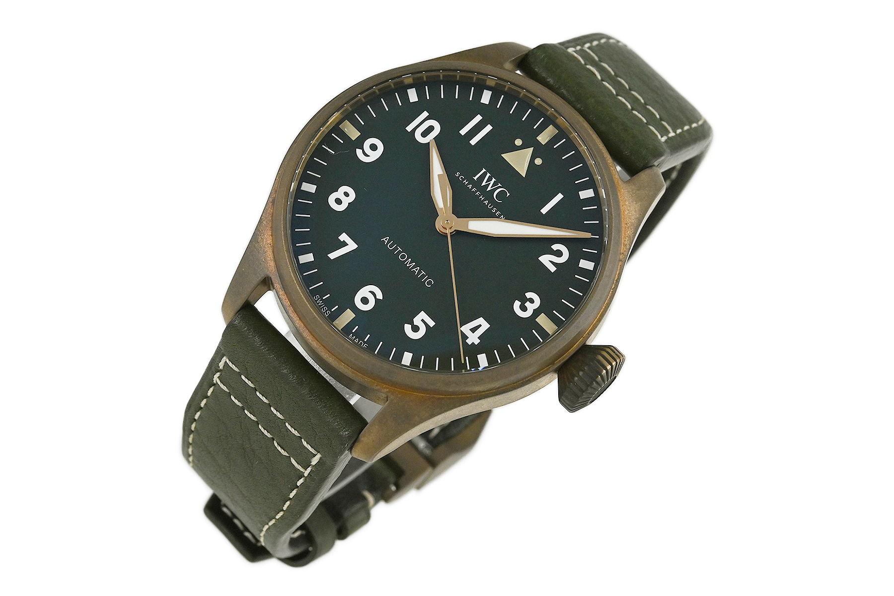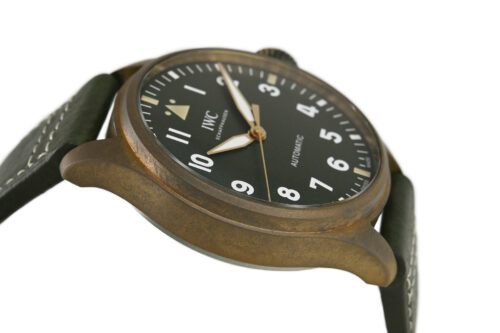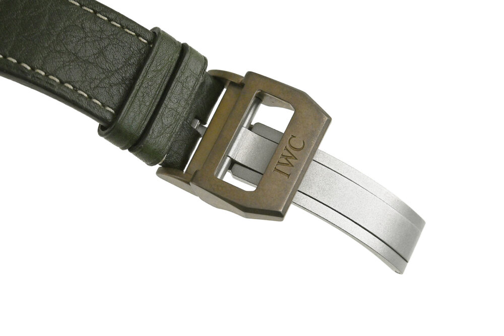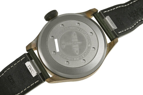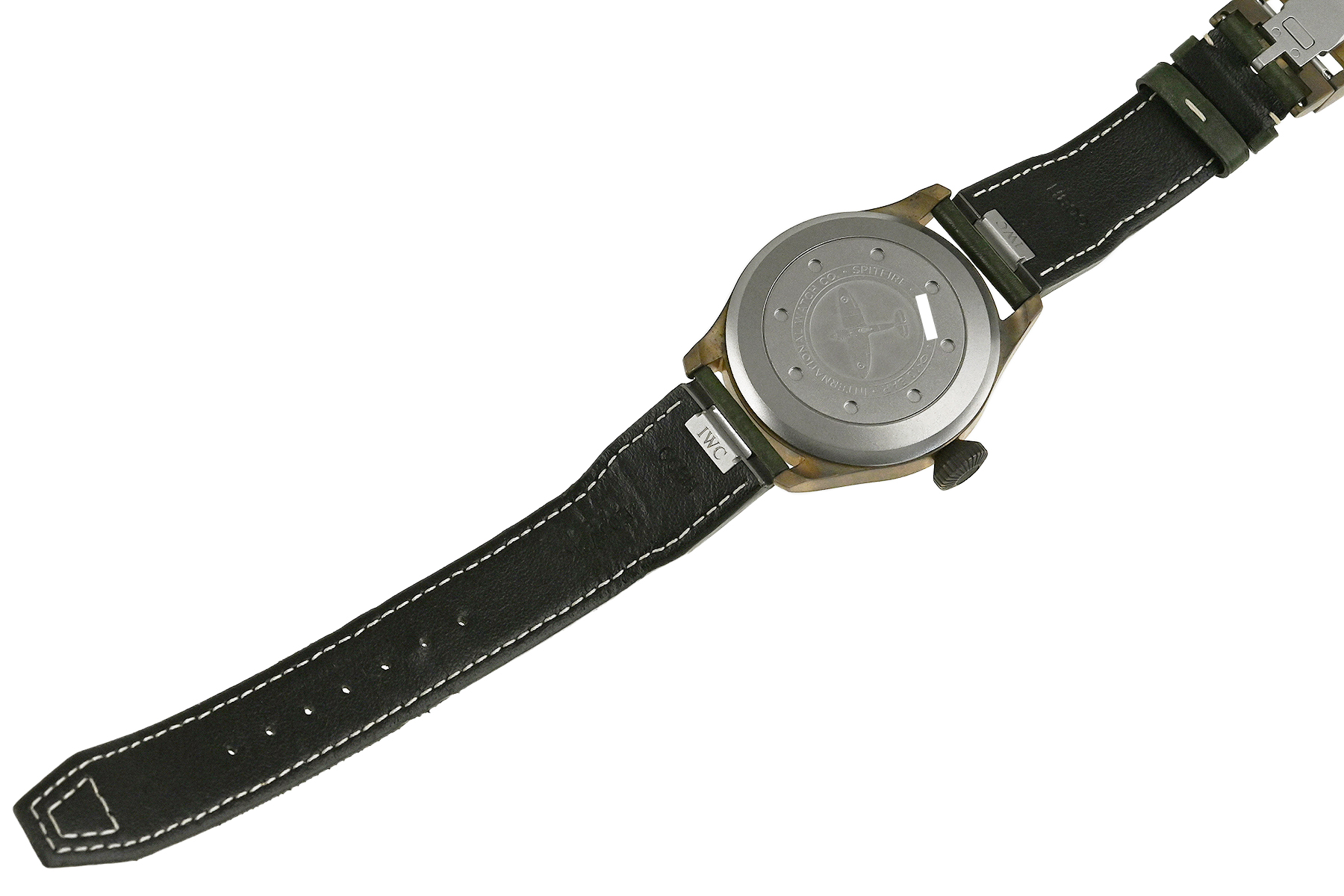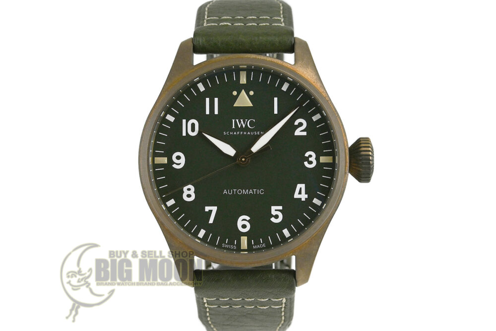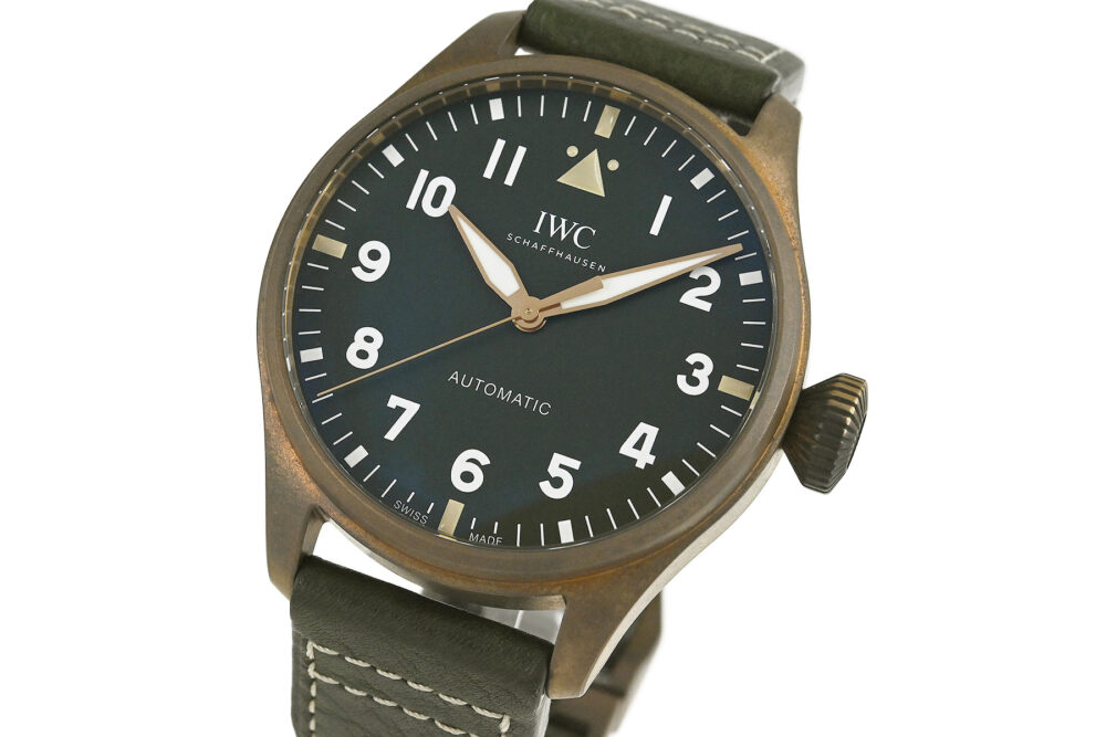 | コメント | クラシックなデザインを採用したIWCのパイロット・ウォッチ・コレクション「ビッグ・パイロット・ウォッチ 43・スピットファイア」。大型の円錐型リューズが特徴的な43mmケースの「ビッグ・パイロット・ウォッチ」をベースに、ミリタリーグリーンダイアル、チタン製の裏蓋を備えたブロンズ製ケース採用でミリタリーテイストなデザインとなっています。簡単にストラップ交換が出来るIWC特許取得のクイック交換システム「EasX-CHANGE」を採用、IWC自社製キャリバー 82100を搭載しています。ブロンズ特有の変色はありますが特に目立つ様なキズはありません。2024年3月に正規修理サービスにてコンプリートサービスをしています。 |