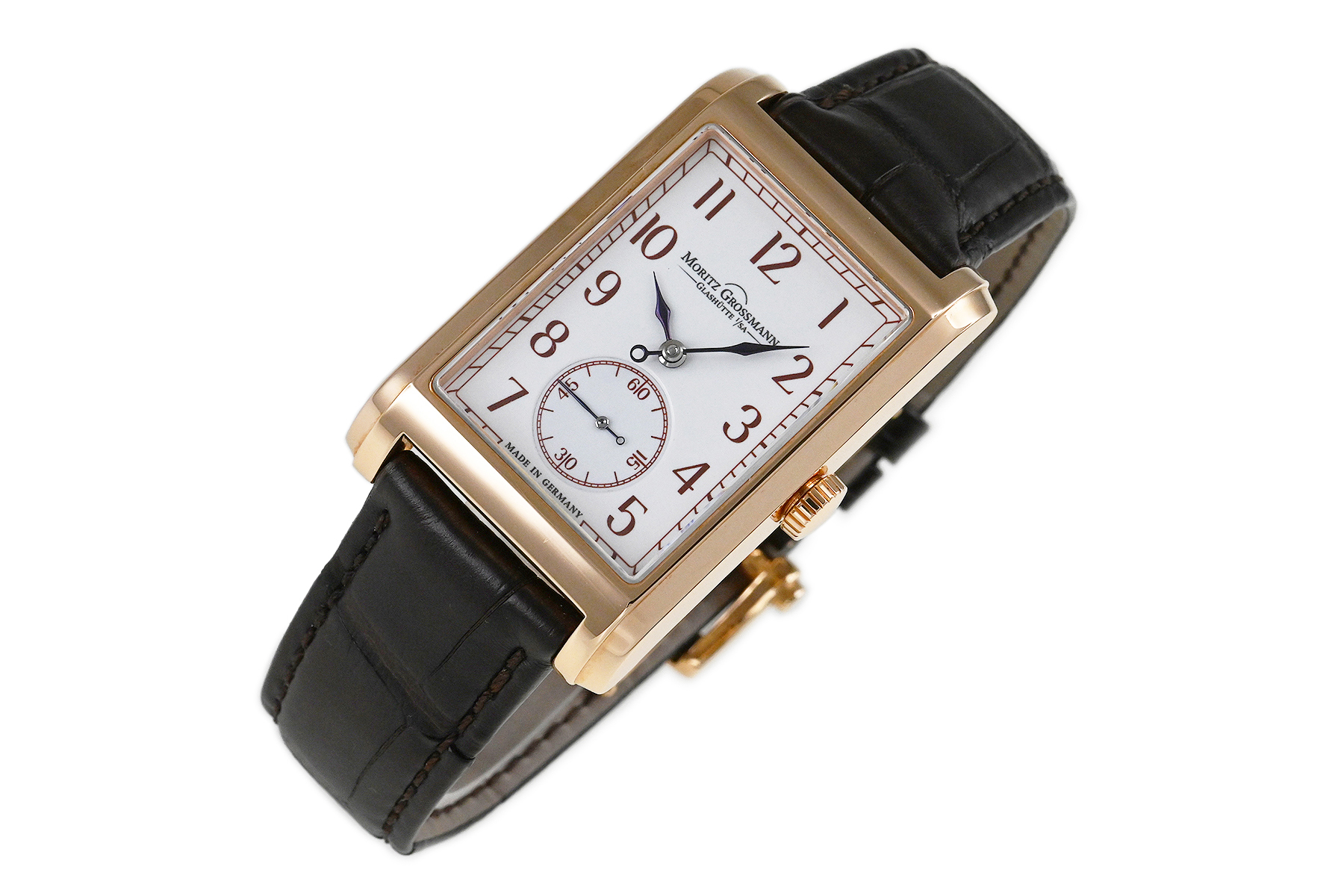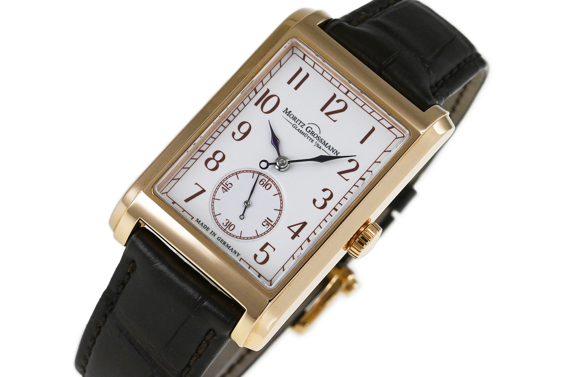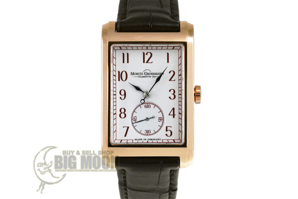 | コメント | 2008年にドイツ・グラスヒュッテにて創業のマニュファクチュールブランド「モリッツ・グロスマン」。19世紀、グラスヒュッテの時計産業の発展に大きく貢献したモリッツ・グロスマンの伝統的な時計作りを最新の技術を取り入れ復活させています。モリッツ・グロスマン初のレクタンギュラーモデルで、ブラウンカラーの目盛りとアラビア数字を備えたグランフー・エナメルダイヤルが特徴的、手作業で仕上げられたパーツが組み合わされたエレガントなデザインが魅力です。少々の軽い擦りキズはありますが目立つ様な深いキズはありません。国内正規店にて購入品です。 |